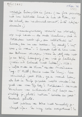 Zondagmiddag waren we bij ‘De Storm’; een prachtig stuk, maar een matige uitvoering. Ik maakte studie van de reacties van Ly, die toch niet veel hooger gingen dan ‘reuze’ en ‘gweldig’. Ernst? Ik weet het niet, maar twijfel. Zij lijkt me iemand, die boven haar geestelijke stand zal willen leven, maar werkelijk belangstelt in jazz. (Van jazz gesproken, met Lou Lichtveld houd ik hier 26 Febr. op de school, een mechanisch concert! à la Schijvendraaiers.)