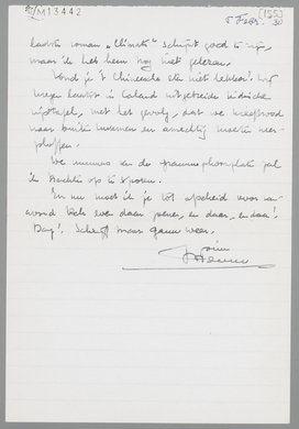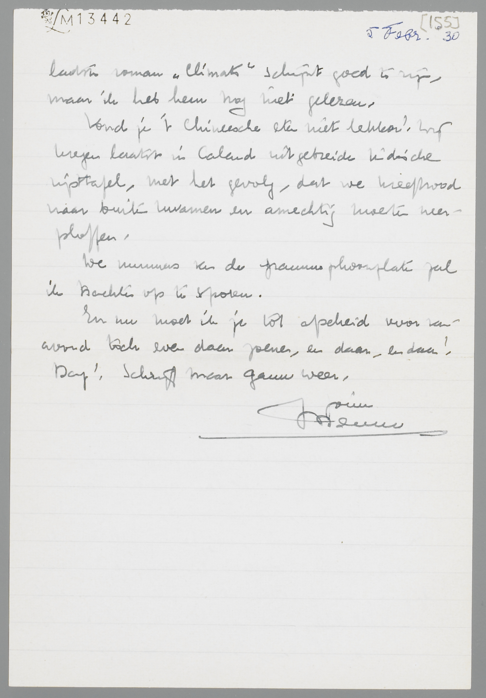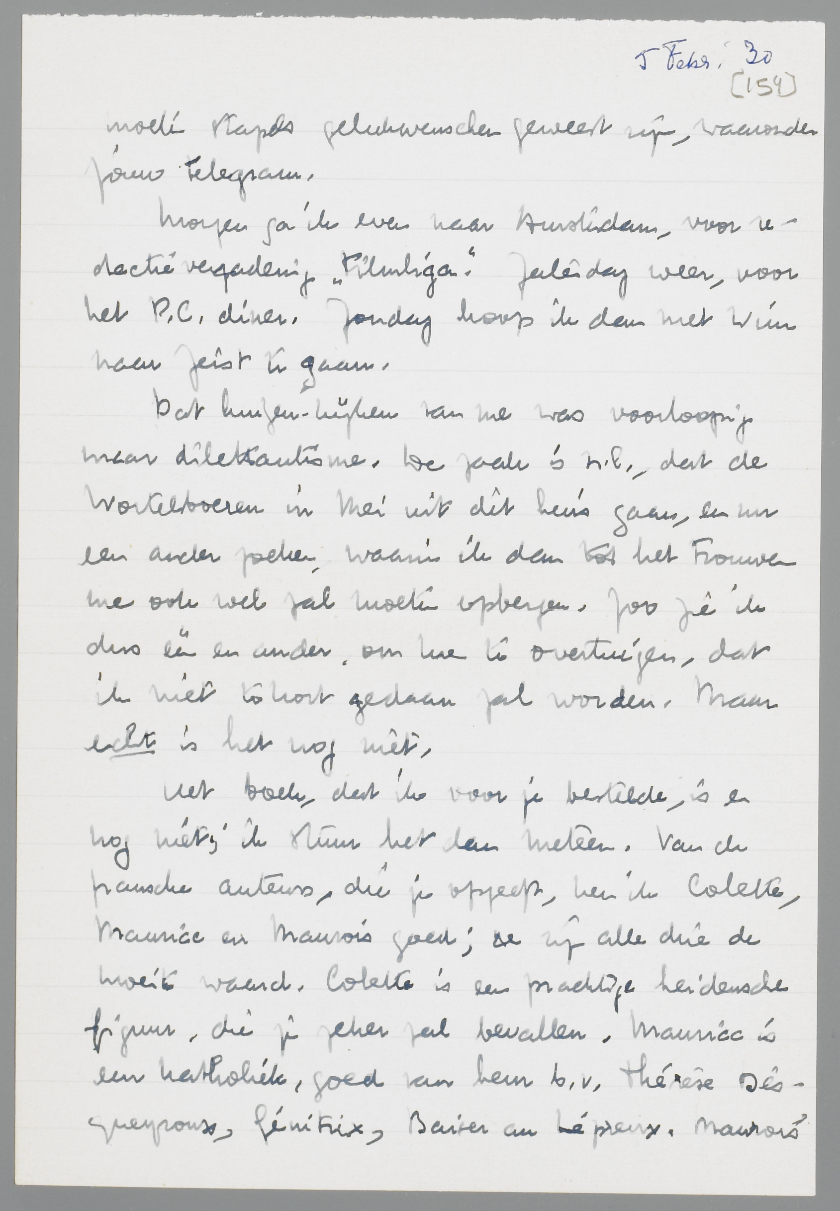Het boek, dat ik voor je bestelde, is er nog niet, ik stuur het dan meteen. Van de fransche auteurs, die je opgeeft, ken ik Colette, Mauriac en Maurois goed; ze zijn alle drie de moeite waard. Colette is een prachtige heidensche figuur, die je zeker zal bevallen. Maurice is een katholiek, goed van hem b.v. Thérèse Dêsqueyroux, Génitirix, Baiser au Lépreux. Maurois' laatste roman ‘Climats’ schijnt goed te zijn, maar ik heb hem nog niet gelezen.