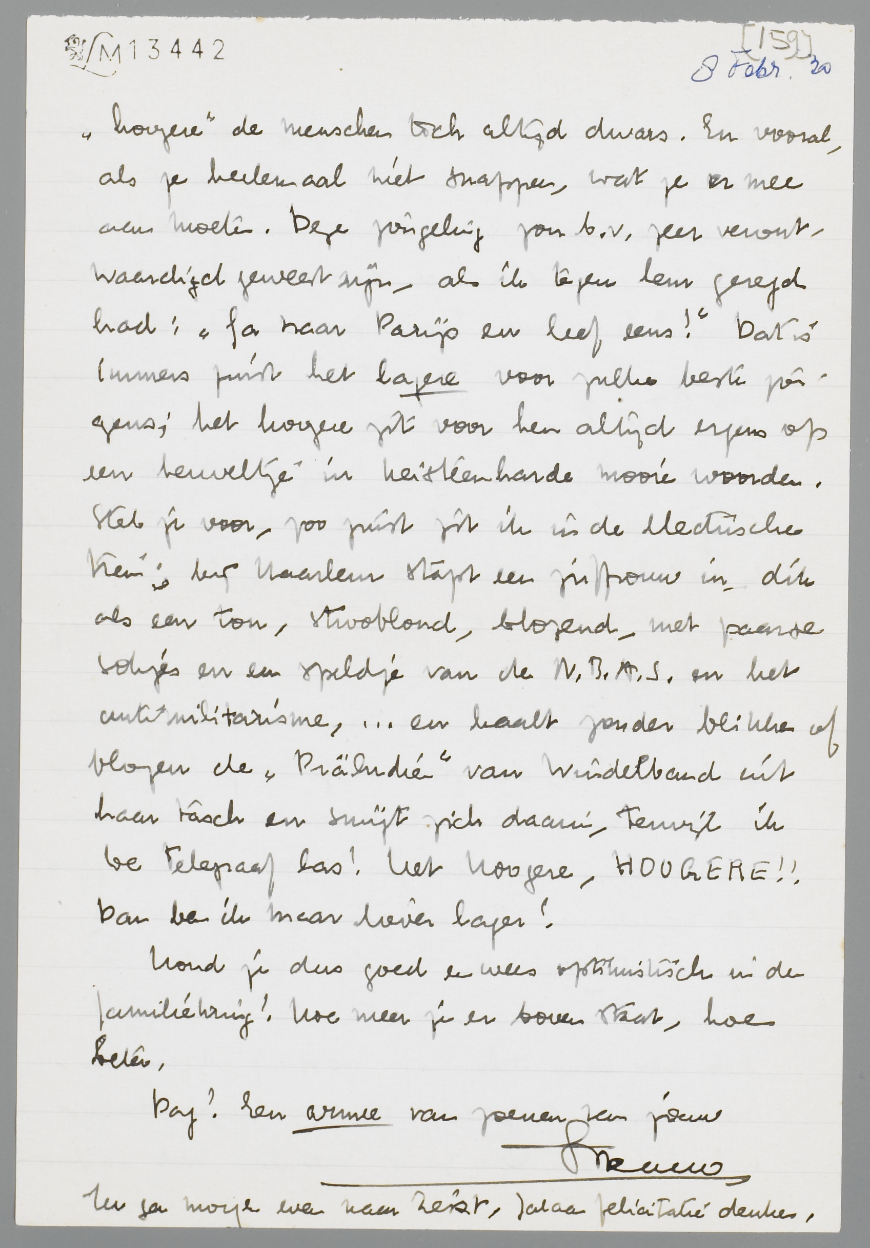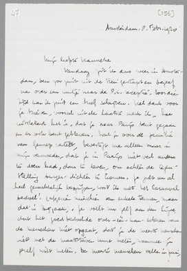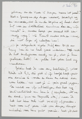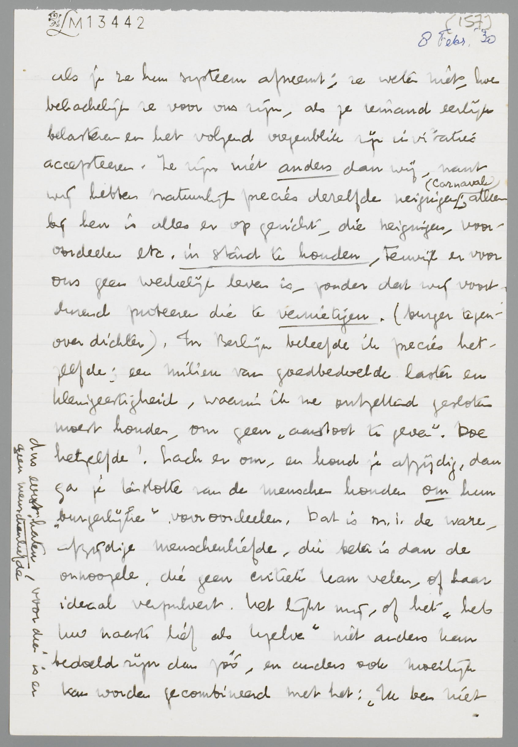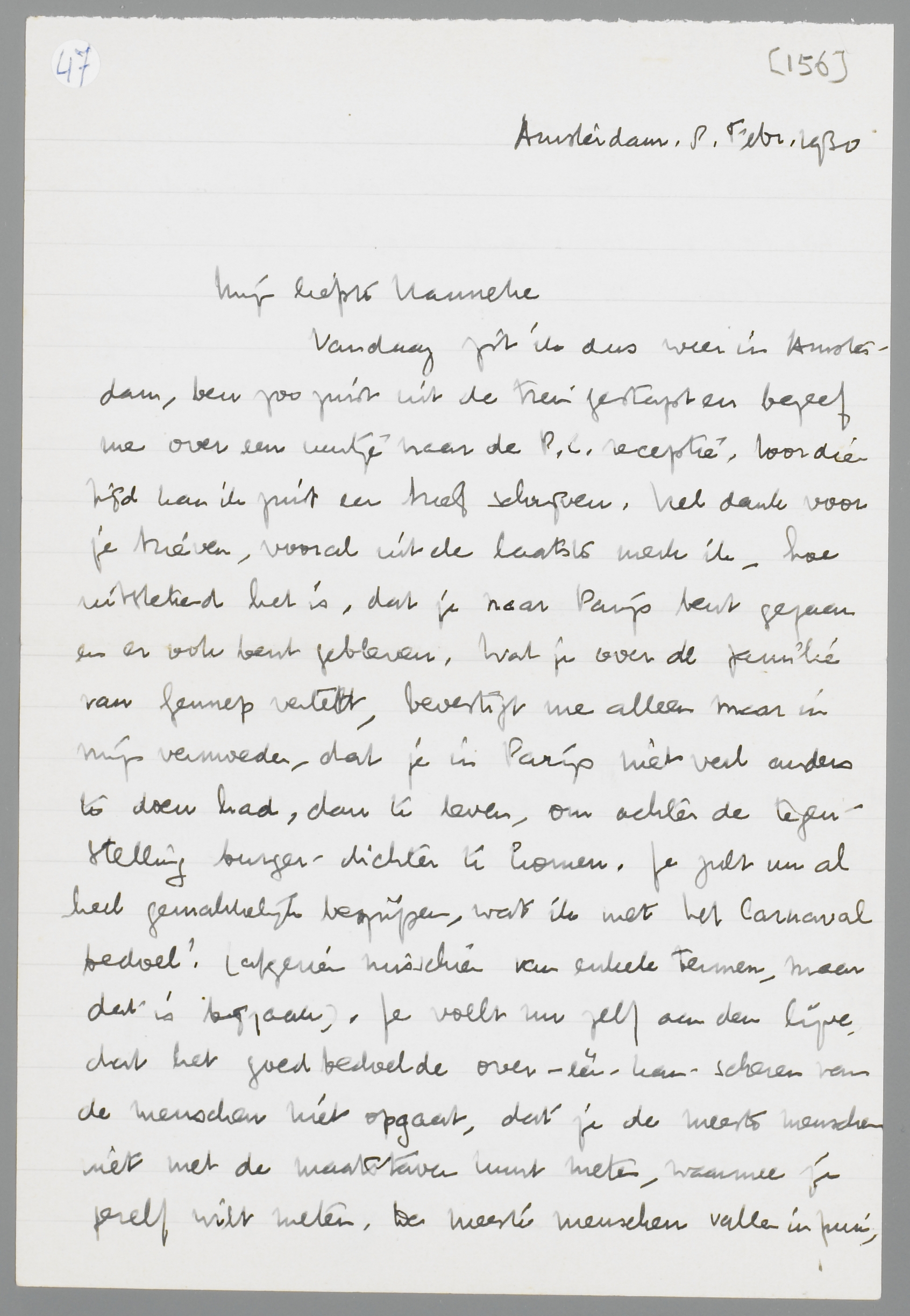 Vandaag zit ik dus weer in Amsterdam, ben zoo juist uit de trein gestapt en begeef me over een uurtje naar de P.C. receptie. Voor dien tijd kan ik juist een brief schrijven. Veel dank voor je brieven, vooral uit de laatste merk ik, hoe uitstekend het is, dat je naar Parijs bent gegaan en er ook bent gebleven. Wat je over de familie van Gennep vertelt, bevestigt me alleen maar in mijn vermoeden, dat je in Parijs niet veel anders te doen had, dan te leven, om achter de tegenstelling burger-dichter te komen. Je zult nu al heel gemakkelijk begrijpen, wat ik met het Carnaval bedoel! (Afgezien misschien van enkele termen, maar dat is bijzaak.) Je voelt nu zelf aan den lijve, dat het goed bedoelde over-één-kam-scheren van de menschen niet opgaat, dat je de meeste menschen niet met de maatstaven kunt meten, waarmee je jezelf wilt meten. De meeste menschen vallen in puin als je ze hun systeem afneemt; ze weten niet, hoe belachelijk ze voor ons zijn, als ze iemand eerlijk belasteren en het volgend oogenblik zijn invitaties accepteeren. Ze zijn niet anders dan wij, want wij hebben natuurlijk precies dezelfde neiging (Carnaval); alleen bij hen is alles er op gericht, die neigingen, vooroordelen etc. in stand te houden, terwijl er voor ons geen werkelijk leven is, zonder dat wij voortdurend probeeren die te vernietigen (burger tegenover dichter). In Berlijn beleefde ik precies hetzelfde; een milieu van goedbedoelde laster en kleingeestigheid, waarin ik me ontzettend gesloten moest houden, om geen ‘aanstoot te geven’. Doe hetzelfde! Lach er om, en houd je afzijdig, dan ga je tenslotte van de menschen houden om hun ‘burgerlijke’ vooroordeelen. Dat is m.i. de ware, afzijdige menschenliefde, die beter is dan de onnoozele, die geen critiek kan velen, of haar ideaal verpulvert. <dus eerst, haten, voordien is er geen menschenliefde> Het lijkt mij, of het ‘heb uw naaste lief als uzelve’ niet anders kan bedoeld zijn dan zóó, en anders ook moeilijk kan worden gecombineerd met het: ‘Ik ben niet gekomen, om den Vrede te brengen, maar het zwaard.’ Dat v. Gennep aan deze dingen meedoet, bevestigt nog een vermoeden, dat ik van den beginne af had: dat hij meer een intellectueel curiosum dan een ‘wijs mensch’ is. Anders loopt zoo iemand toch eenvoudig weg! Wie trouwt anders ook een vrouw, die niet lezen of schrijven kan?