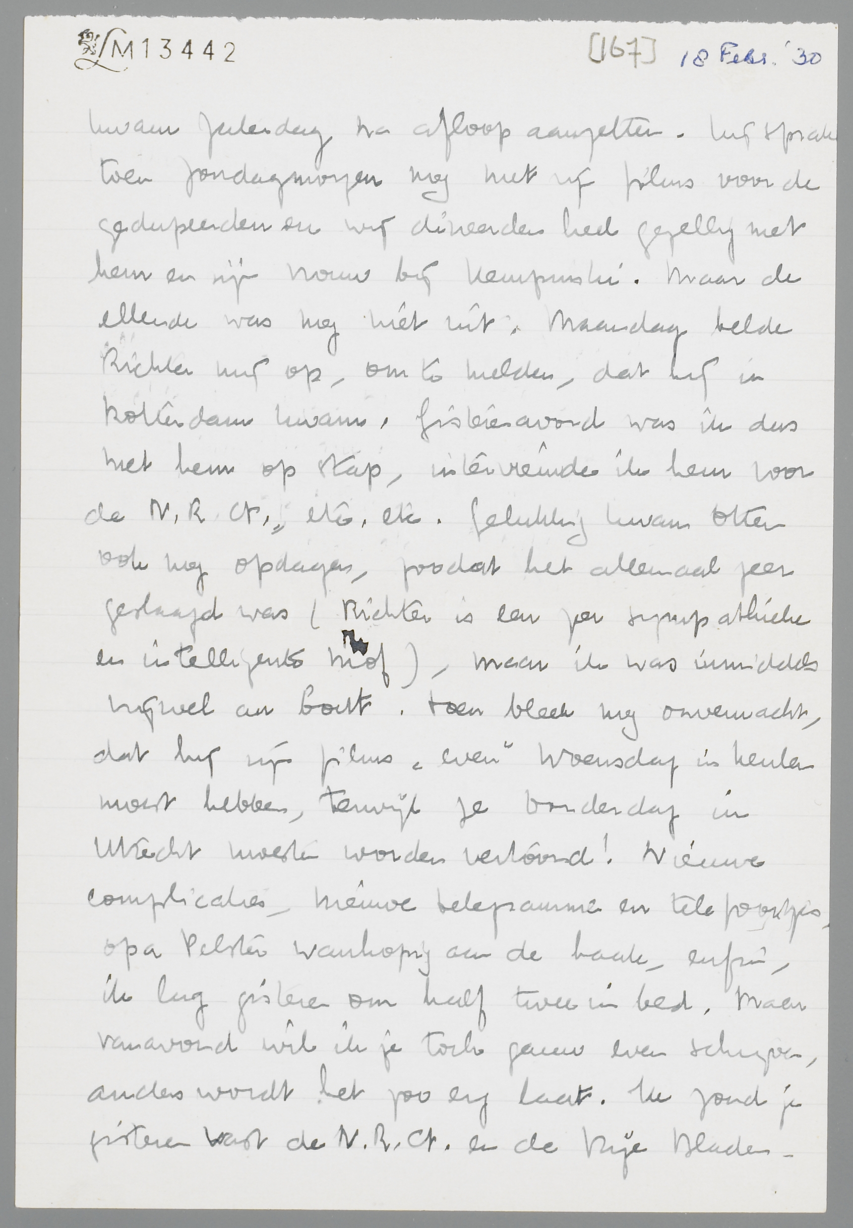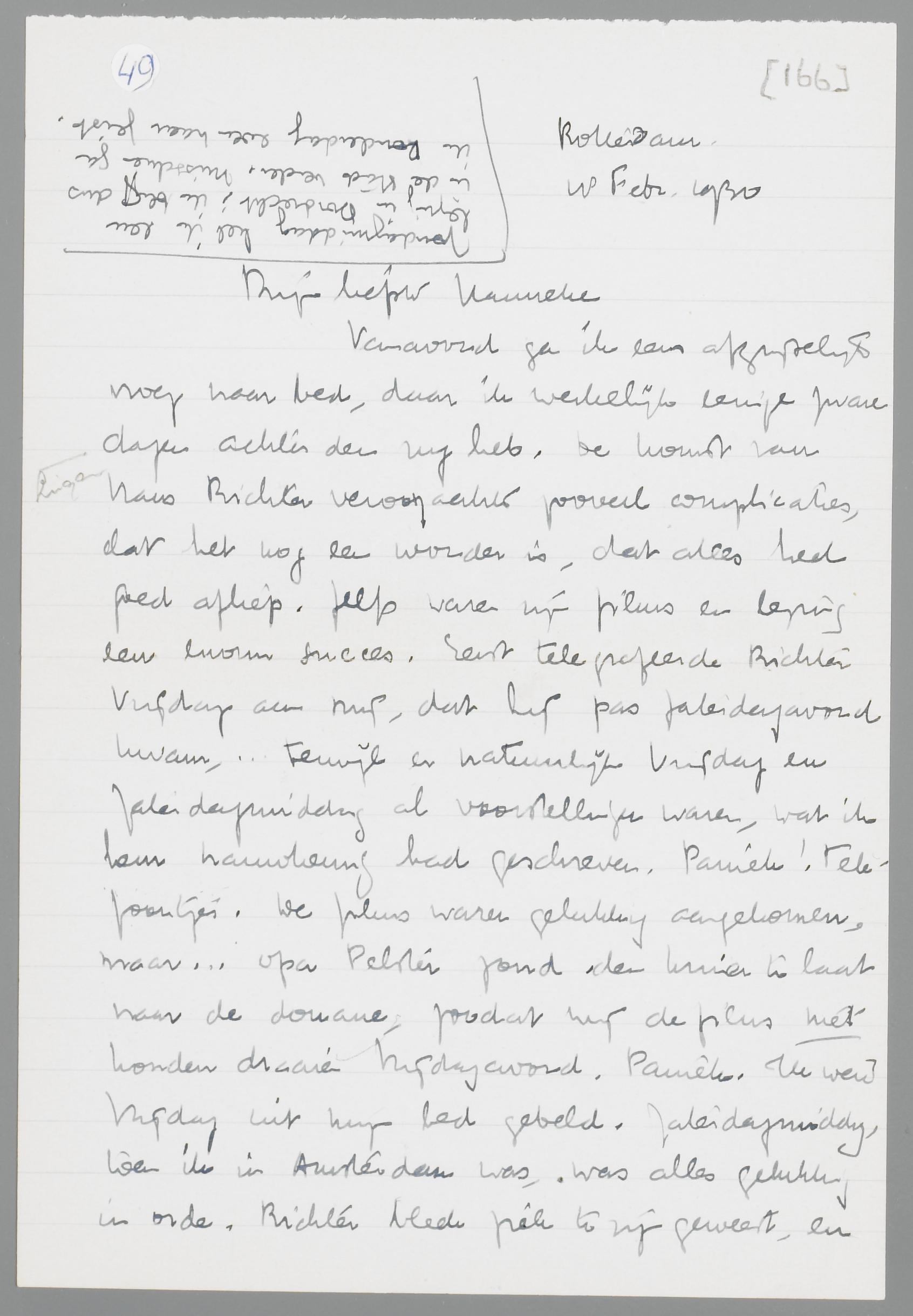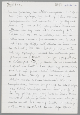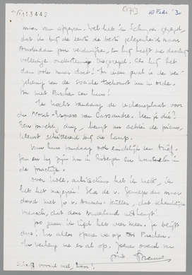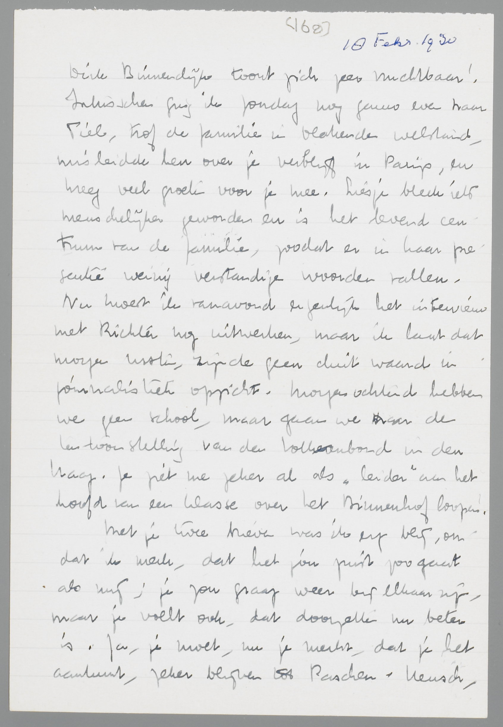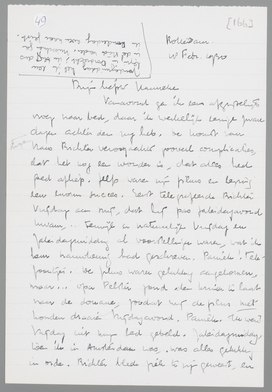 Vanavond ga ik eens afgrijselijk vroeg naar bed, daar ik werkelijk eenige zware dagen achter den rug heb. De komst van Hans Richter veroorzaakte zooveel complicaties, dat het nog een wonder is, dat alles heel goed afliep. Zelfs waren zijn films en lezing een enorm succes. Eerst telegrafeerde Richter Vrijdag aan mij, dat hij pas zaterdagavond kwam... terwijl er natuurlijk Vrijdag en Zaterdagmiddag al voorstellingen waren, wat ik hem nauwkeurig had geschreven. Paniek! Telefoontjes. De films waren gelukkig aangekomen, maar... opa Pelster zond den kruier te laat naar de douane, zoodat wij de films niet konden draaien Vrijdagavond. Paniek. Ik werd Vrijdag uit mijn bed gebeld. Zaterdagmiddag, toen ik in Amsterdam was, was alles gelukkig in orde. Richter bleek ziek te zijn geweest, en kwam Zaterdag na afloop aanzetten. Hij sprak toen zondagmorgen nog met zijn films voor de gedupeerden en wij dineerden heel gezellig met hem en zijn vrouw bij Kempinski. Maar de ellende was nog niet uit. Maandag belde Richter mij op, om te melden, dat hij in Rotterdam kwam. Gisterenavond was ik dus met hem op stap, interviewde ik hem voor de N.R.C., etc. etc. Gelukkig kwam Otten ook nog opdagen, zoodat het allemaal zeer geslaagd was (Richter is een zeer sympathieke en intelligente mof), maar ik was inmiddels vrijwel au bout. Toen bleek nog onverwachts, dat hij zijn films ‘even’ Woensdag in Keulen moest hebben, terwijl ze Donderdag in Utrecht moesten worden vertoond! Nieuwe complicaties, nieuwe telegrammen en telefoontjes. Opa Pelster wanhopig aan de haak, enfin, ik lag gisteren om half twee in bed. Maar vanavond wil ik je toch gauw even schrijven, anders wordt het zoo erg laat. Ik zond je gisteren vast de N.R.C. en de Vrije Bladen. Dirk Binnendijk toont zich zeer vruchtbaar! Intusschen ging ik Zondag nog gauw even naar Tiel, trof de familie in blakende welstand, misleidde hen over je verblijf in Parijs, en kreeg veel groeten voor je mee. Liesje bleek iets menschelijker geworden en is het levend centrum van de familie, zoodat er in haar presentie weinig verstandige woorden vallen. Nu moest ik vanavond eigenlijk het interview met Richter nog uitwerken, maar ik laat dat morgen rusten, zijnde geen duit waard in journalistiek opzicht. Morgenochtend hebben we geen school maar gaan we naar de tentoonstelling van de Volkerenbond in Den Haag. Je ziet me zeker al als ‘leider’ aan het hoofd van een klasse over het Binnenhof loopen!
