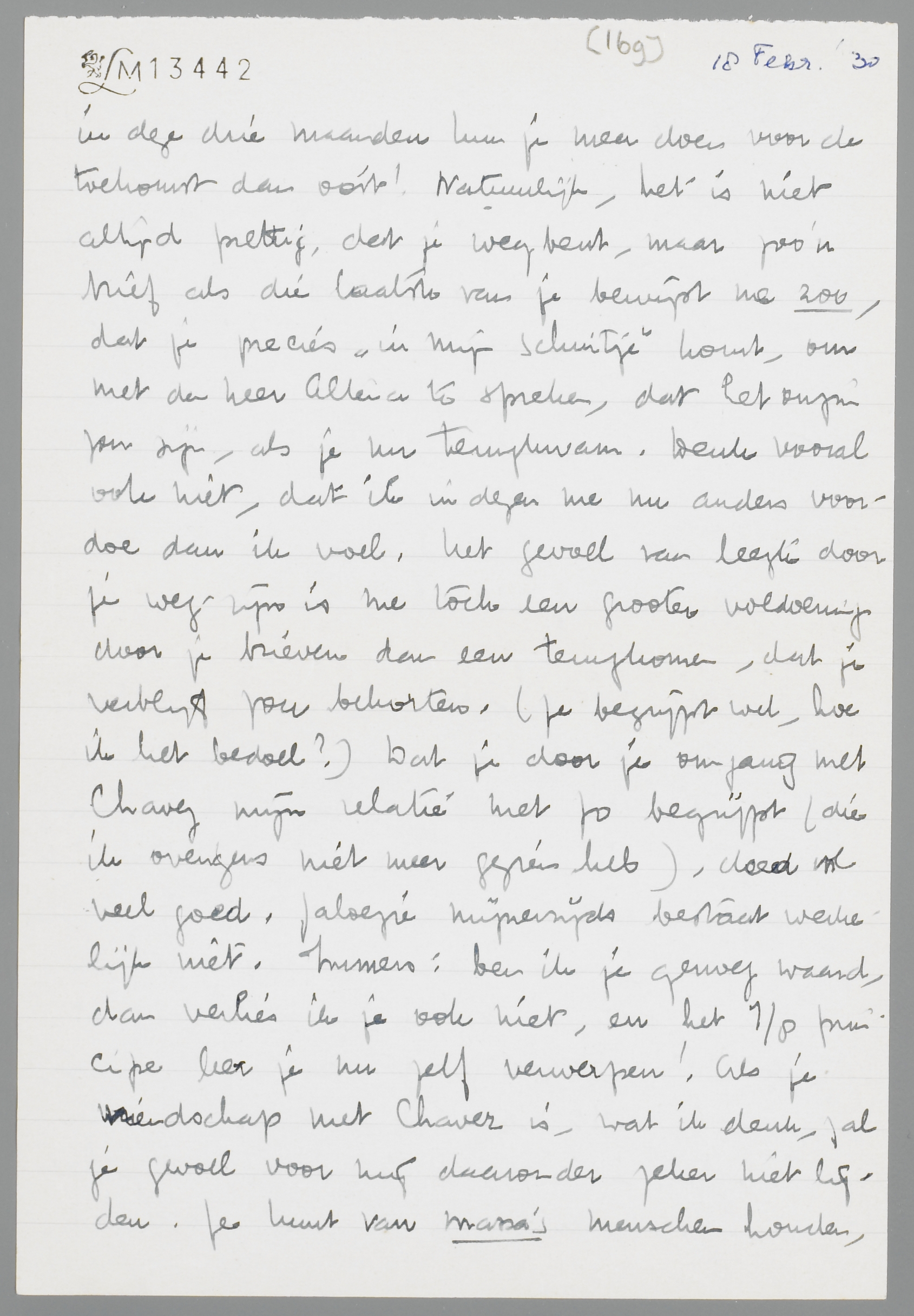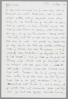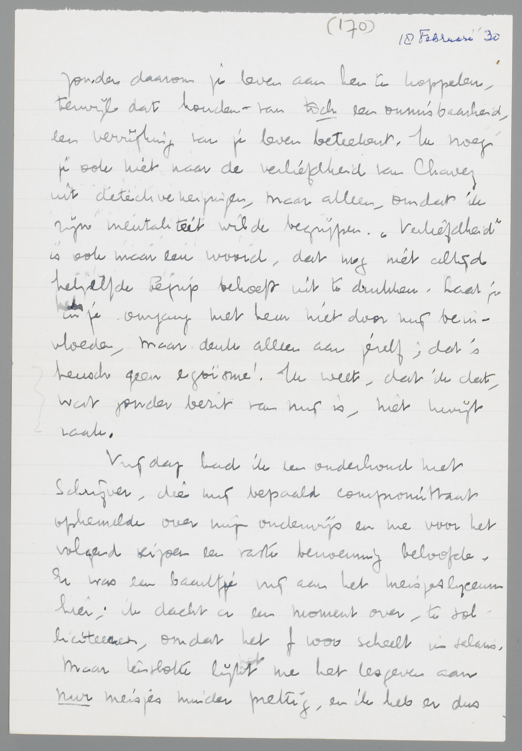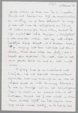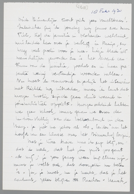 Met je twee brieven was ik erg blij, omdat ik merk, dat het jou juist zoo gaat als mij; je zou graag weer bij elkaar zijn, maar je voelt ook, dat doorzetten nu beter is. Ja, je moet, nu je merkt, dat je het aankunt, zeker blijven tot Paschen. Heusch, in deze drie maanden kun je meer doen voor de toekomst dan ooit! Natuurlijk, het is niet altijd prettig, dat je weg bent, maar zoo’n brief als die laatste van je bewijst me zoo dat je precies ‘in mijn schuitje’ komt, om met den heer Altena te spreken, dat het onzin zou zijn, als je nu terugkwam. Denk vooral ook niet, dat ik in dezen me nu anders voordoe dan ik voel. Het gevoel van leegte door je weg-zijn, is me toch een grootere voldoening door je brieven dan een terugkomen, dat je verblijf zou bekorten. (Je begrijpt wel, hoe ik het bedoel?) Dat je door je omgang met Chavez mijn relatie met Jo begrijpt (die ik overigens niet meer gezien heb), deed me veel goed. Jaloezie mijnerzijds bestaat werkelijk niet. Immers: ben ik je genoeg waard, dan verlies ik je ook niet, en het 7/8 principe leer je nu zelf verwerpen! Als je vriendschap met Chavez is, wat ik denk, zal je gevoel voor mij daaronder zeker niet lijden. Je kunt van massa’s menschen houden, zonder daarom je leven aan hen te koppelen, terwijl dat houden-van toch een onmisbaarheid, een verrijking van je leven beteekent. Ik vroeg je ook niet naar de verliefdheid van Chavez uit detectiveneigingen, maar alleen, omdat ik zijn mentaliteit wilde begrijpen. ‘Verliefdheid’ is ook maar een woord, dat nog niet altijd hetzelfde begrip behoeft uit te drukken. Laat je in je omgang met hem niet door mij beinvloeden, maar denk alleen aan jezelf; dat is heusch geen egoïsme! Ik weet, dat ik dat, wat zonder bezit van mij is, niet kwijt raak.