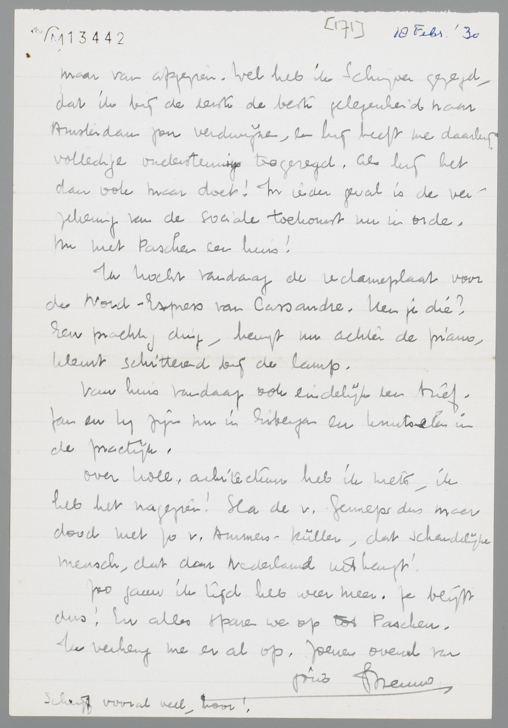 Ik kocht vandaag de reclameplaat voor de Nord-Express van Cassandra. Ken je die? Een prachtig ding, hangt nu achter de piano, kleurt schitterend bij de lamp.