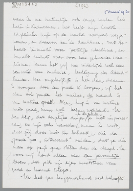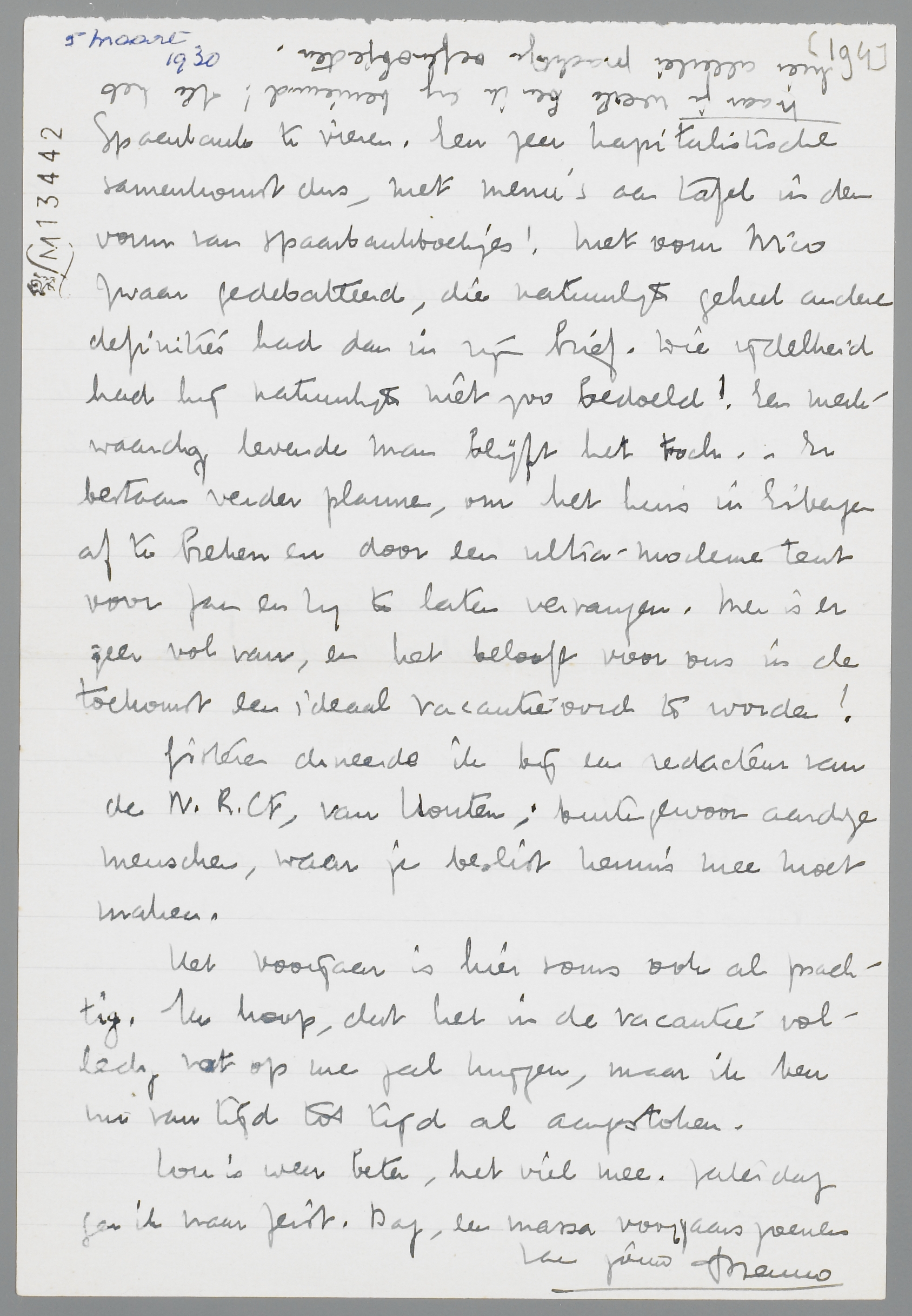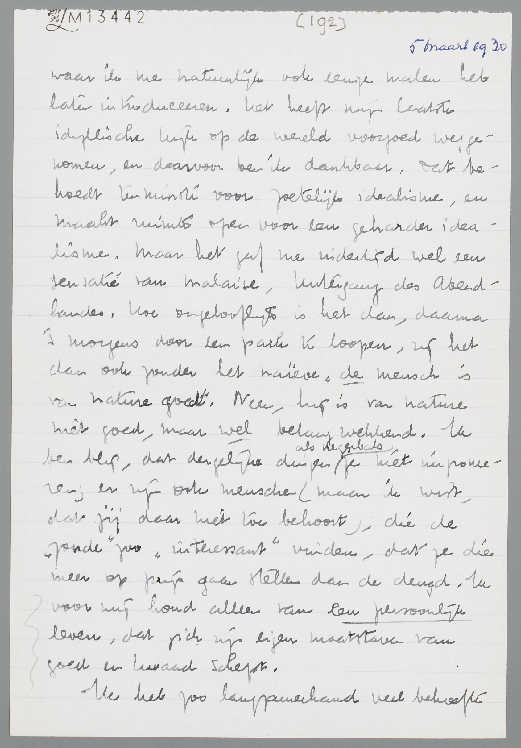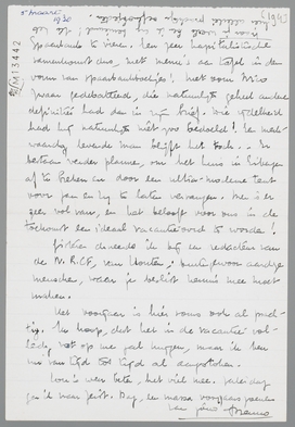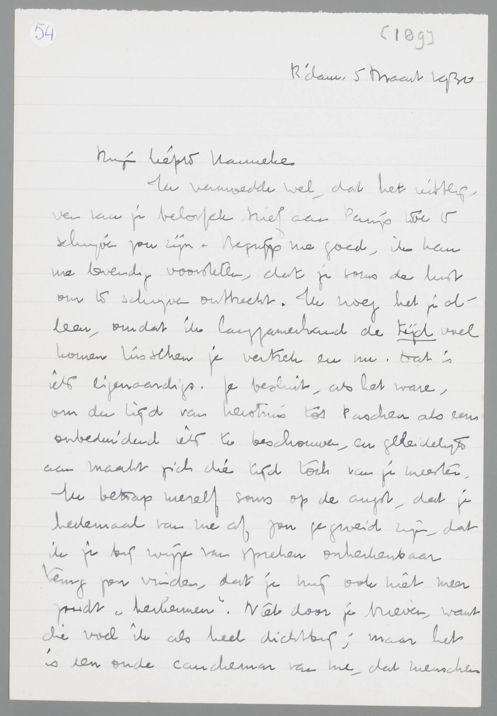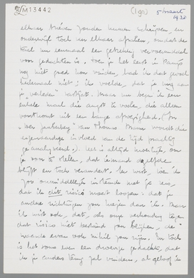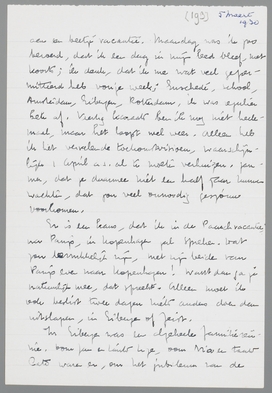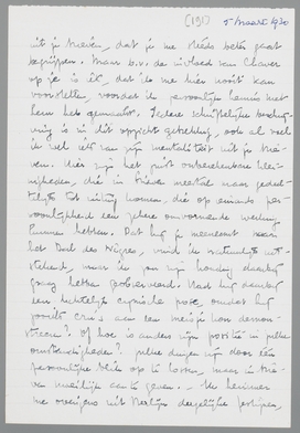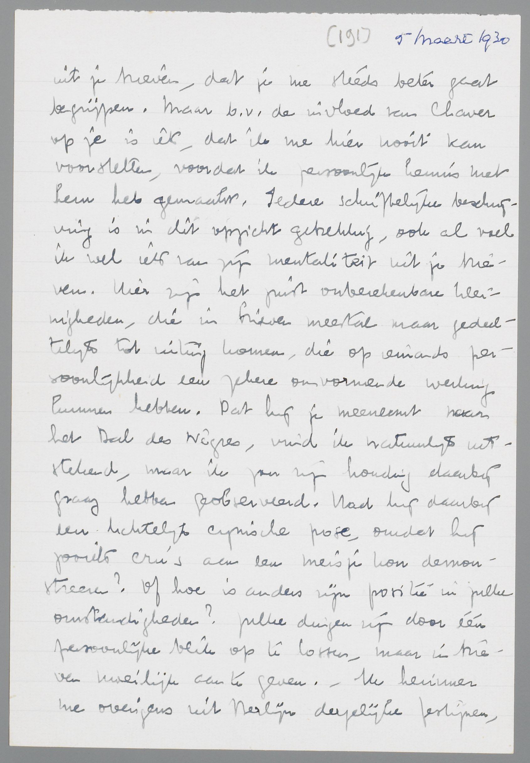 Ik vermoedde wel, dat het uitblijven van je beloofde brief aan Parijs toe te schrijven zou zijn. Begrijp me goed, ik kan me levendig voorstellen, dat je soms de lust tot schrijven ontbreekt. Ik vroeg het je alleen, omdat ik langzamerhand de tijd voel komen tusschen je vertrek en nu. Dat is iets eigenaardigs. Je besluit, als het ware, om den tijd van Kerstmis tot Paschen ale een onbeduidend iets te beschouwen, en geleidelijk aan maakt zich die tijd toch van je meester. Ik betrap mezelf soms op de angst dat je heelemaal van me af zou gegroeid zijn, dat ik je bij wijze van spreken onherkenbaar terug zou vinden, dat je mij ook niet meer zoudt ‘herkennen’. Niet door je brieven, want die voel ik als heel dichtbij; maar het is een oude cauchemar van me, dat menschen elkaar brieven zouden kunnen schrijven, en onderwijl toch van elkaar afraken, omdat de taal nu eenmaal een gebrekkig vervoermiddel voor gedachten is. Toen je het eerst in Parijs nog niet goed kon vinden, had ik dat gevoel heelemaal niet; ik voelde, dat je nog aan je ‘verleden’ vastzat. Maar nu begin ik een enkele maal die angst te voelen, die alleen voortkomt uit een lange afwezigheid. (In ‘Der Zauberberg ’van Thomas Mann wordt die eigenaardige invloed van de tijd prachtig geanalyseerd.) Het is altijd moeilijk, om je voor te stellen, dat iemand dezelfde blijft en toch verandert. Ik wist, toen ik zoo onmiddellijk instemde met je reis, dat ik dit risico moest loopen: dat je andere richtingen zou kiezen dan ik. Maar ik wist ook, dat, als onze verhouding tegen dat risico niet bestand zou blijken, de waarde ervan ook nihil zou zijn. En toch is het soms even een droevige gedachte, dat ik je anders terug zal vinden, al geloof ik uit je brieven, dat je me steeds beter gaat begrijpen. Maar b.v. de invloed van Chavez op je is iets, dat ik me hier nooit kan voorstellen, voordat ik persoonlijk kennis met hem heb gemaakt. Iedere schriftelijke beschrijving is in dit opzicht gebrekkig, ook al voel ik wel iets van zijn mentaliteit uit je brieven. Hier zijn het juist onberekenbare kleinigheden, die in brieven meestal maar gedeeltelijk tot uiting komen, die op iemands persoomlijkheid een zekere omvormende werking kunnen hebben. Dat hij je meeneemt naar het Bal des nègres, vind ik natuurlijk uitstekend, maar ik zou zijn houding daarbij graag hebben geobserveerd. Had hij daarbij een lichtelijk cynische pose, omdat hij zooiets cru’s aan een meisje kon demonstreeren? Of hoe is anders zijn positie in jullie omstandigheden? Zulke dingen zijn door één persoonlijke blik op te lossen, maar in brieven moeilijk aan te geven. Ik herinner me overigens uit Berlijn dergelijke festijnen, waar ik me natuurlijk ook eenige malen heb laten introduceeren. Het heeft mijn laatste idyllische kijk op de wereld voorgoed weggenomen, en daarvoor ben ik dankbaar. Dat behoedt tenminste voor zoetelijk idealisme, en maakt ruimte open voor een geharder idealisme. Maar het gaf me indertijd wel een sensatie van malaise, Untergang des Abendlandes. Hoe ongelooflijk is het dan, daarna ’s morgens door een park te loopen, zij het dan ook zonder het naieve ‘de mensch is van nature goed’. Neen, hij is van nature niet goed, maar wel belangwekkend. ik ben blij, dat dergelijke dingen als negerbals je niet imponeeren; er zijn ook menschen (maar ik wist, dat jij daar niet toe behoort), die de ‘zonde’ zoo ‘interessant’ vinden, dat ze die meer op prijs gaan stellen dan de deugd. Ik voor mij houd alleen van een persoonlijk leven, dat zich zijn eigen maatstaven van goed en kwaad schept.