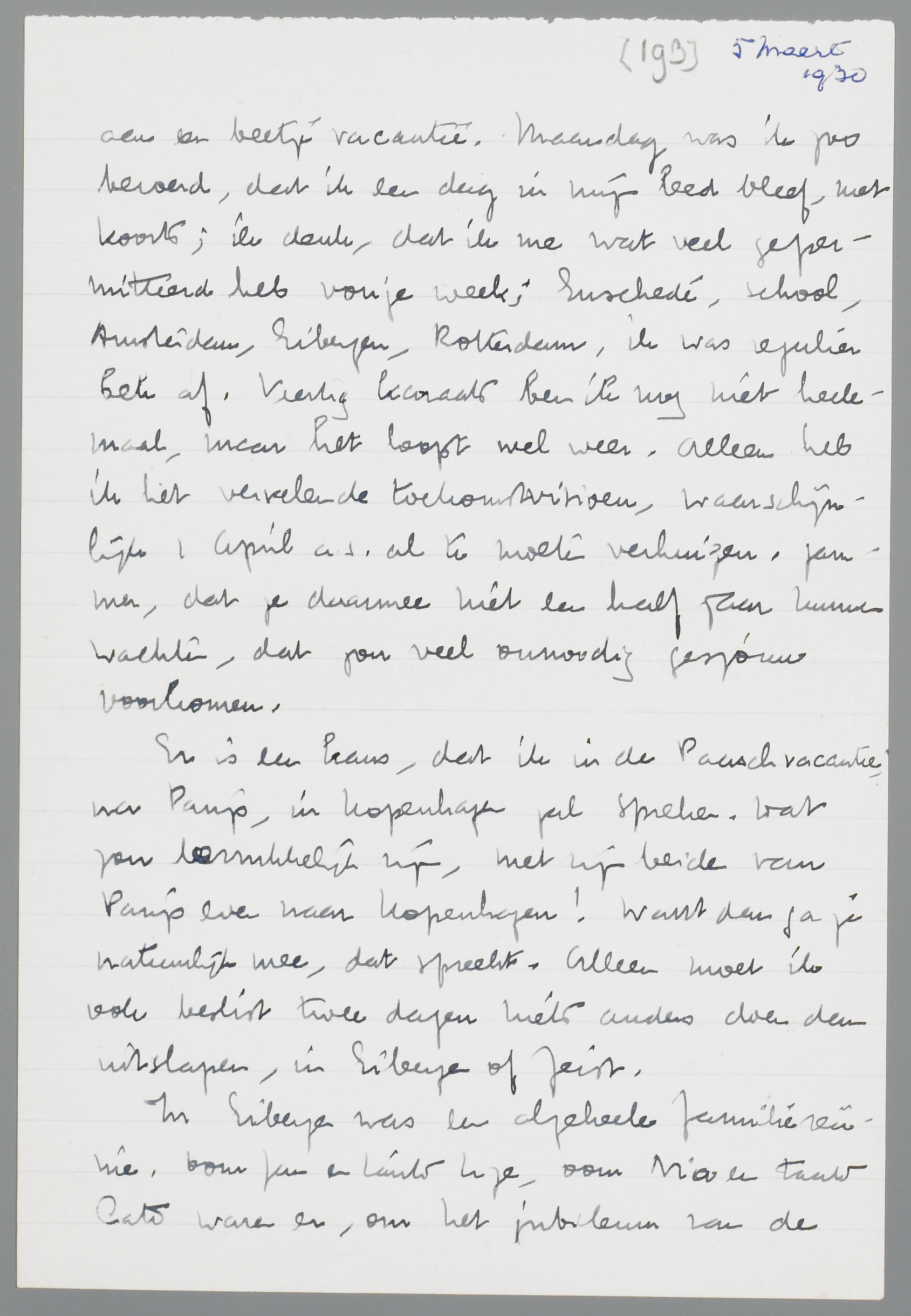 Er is een kans, dat ik in de Paaschvacantie, na Parijs, in Kopenhagen zal spreken. Dat zou verrukkelijk zijn, met zijn beiden van Parijs even naar Kopenhagen! Want dan ga je natuurlijk mee, dat spreekt. Alleen moet ik ook beslist twee dagen niets anders doen dan uitslapen, in Eibergen of Zeist.