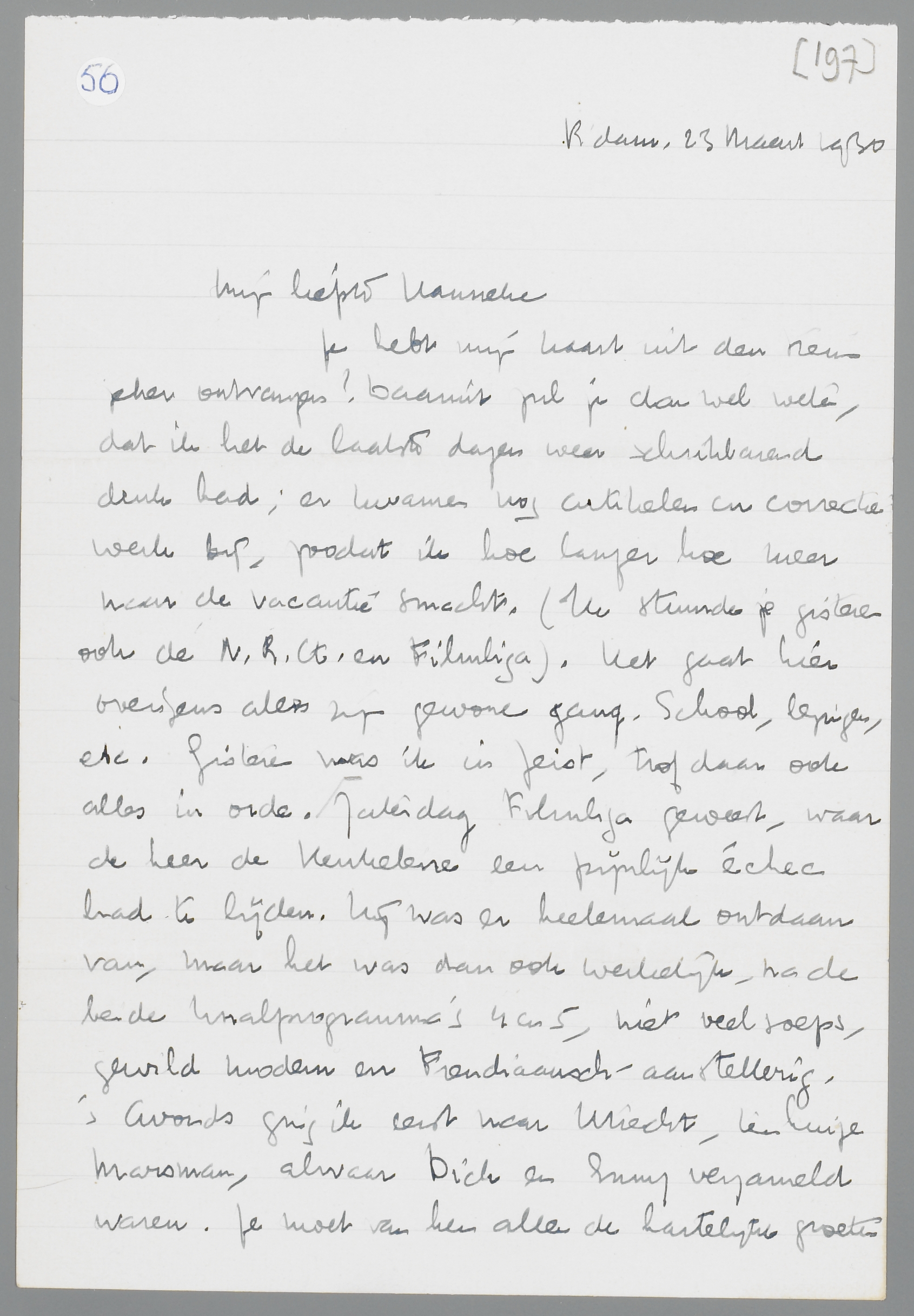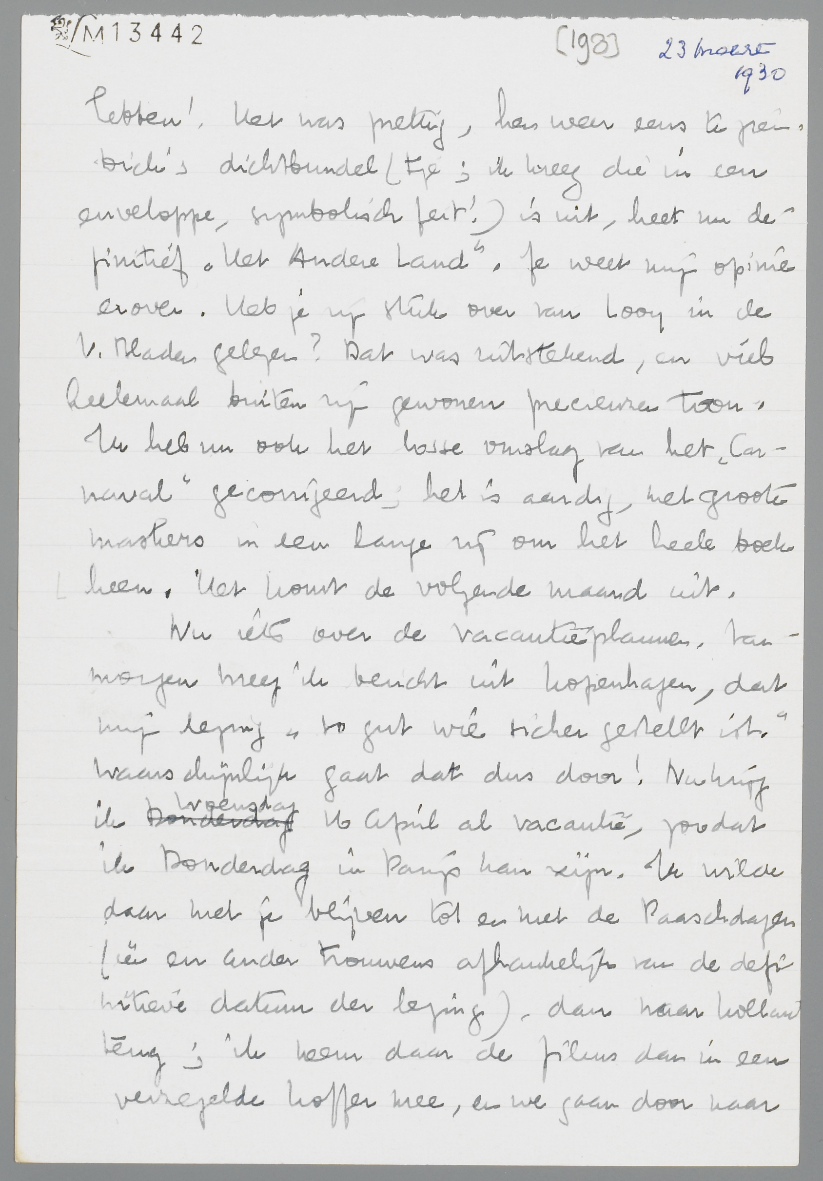 Je hebt mijn kaart uit de trein zeker ontvangen? Daaruit zul je dan wel weten, dat ik het de laatste dagen weer schrikbarend druk had; er kwamen nog artikelen en correctiewerk bij, zoodat ik hoe langer hoe meer naar de vacantie smacht. Ik stuurde je gisteren ook de N.R.Ct. en Filmliga). Het gaat hier overigens alles zijn gewone gang. School, lezingen, etc. Gisteren was ik in Zeist, trof daar ook alles in orde. Zaterdag Filmliga geweest, waar de heer de Keukeleire een pijnlijk échec had te lijden. Hij was er heelemaal ontdaan van, maar het was dan ook werkelijk, na de beide knalprogramma’s 4 en 5, niet veel soeps, gewild modern en Freudiaanscg-aanstellerig. ’s Avonds ging ik eerst naar Utrecht, ten huize Marsman, alwaar Dick en Enny verzameld waren. Je moet van hen allen de hartelijke groeten hebben! Het was prettig, hen weer eens te zien. Dick’s dichtbundel (tje, ik kreeg die in een enveloppe, symbolisch feit!) is uit, heet nu definitief ‘Het Andere Land’. Je weet mijn opinie erover. Heb je zijn stuk over van Loon in de V. Bladen gelezen? Dat was uitstekend, en viel heelemaal buiten zijn gewonen precieuzen toon. Ik heb nu ook het losse omslag van het ‘Carnaval’ gecorrigeerd; het is aardig, met groote maskers in een lange rij om het heele boek heen. Het komt de volgende maand uit.