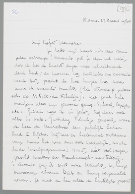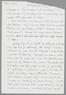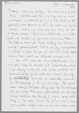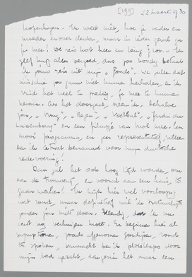 Zondag las ik in Zeist een brief van v.Gennep over jou en je verhouding tot Parijs. Hij beschouwt de zaken vanuit typisch rationalistisch, nuchter standpunt, begrijpt er m.a.w. niets van, als ik goed zie. Hij schrijft bewonderend over je bindkunst, maar kennelijk vindt hij ook, dat die goed is, om je gedachten te kalmeeren! Of liever: zoet te houden. Een echt eenzijdige mannentheorie. Trouwens, het woord ‘Hegel’ bij het Carnaval der burgers is voorbarig en oppervlakkig, want het gaat, hoewel het in de ‘drieslag’ (burger, dichter, carnaval) misschien iets op Hegel lijkt, precies tegen mijn conclusies in. Bovendien, dat onmiddellijk etiquetten-plakken-met-andere-namen heeft toch ook niet den minsten zin. Natuurlijk heft iedereen invloeden ondergaan, maar dat is toch het interessante niet. Het interessante is, of hij zichzelf tracht te zijn.