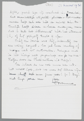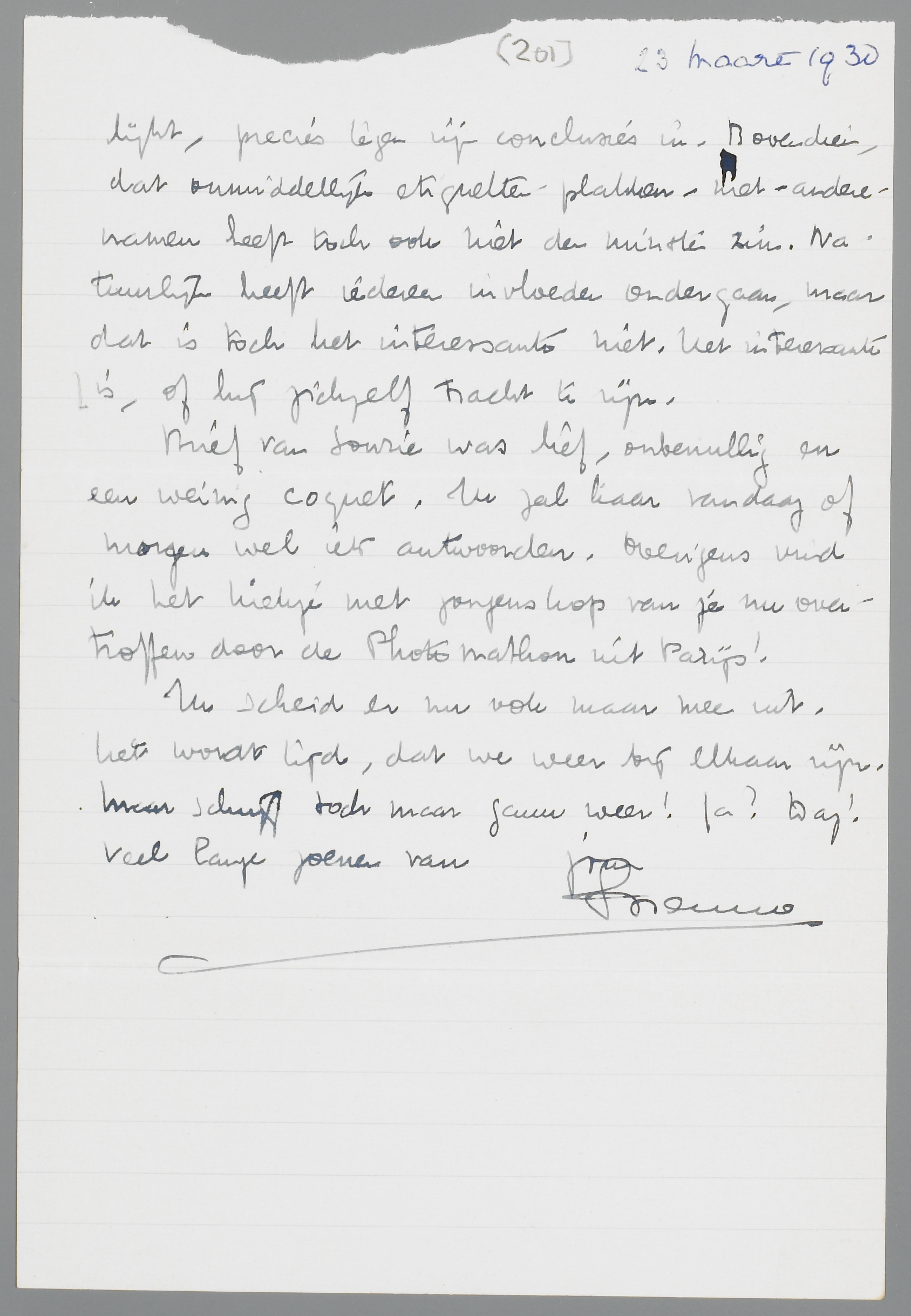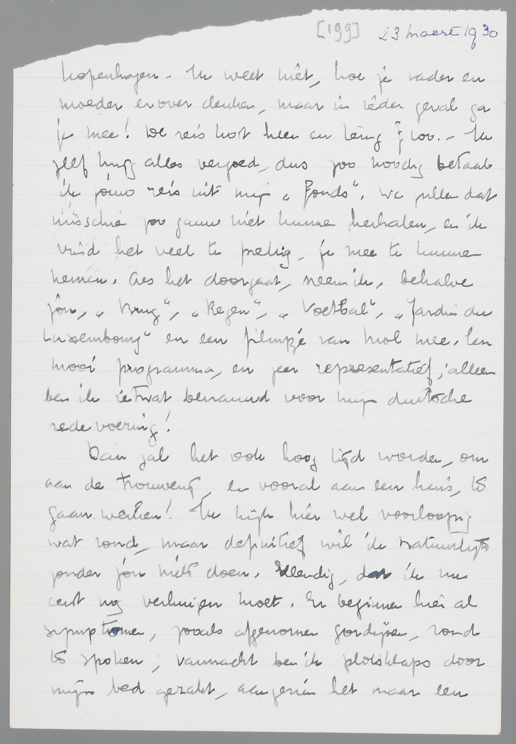 Nu iets over de vacantieplannen. Vanmorgen kreeg ik bericht uit Kopenhagen, dat mijn lezing ‘so gut wie sicher gestellt ist.’ Waarschijnlijk gaat het dus door! Nu krijg ik Woensdag 16 April al vacantie, zoodat ik Donderdag in Parijs kan zijn. Ik wilde daar met je blijven tot en met de Paaschdagen (één en ander trouwens afhankelijk van de definitieve datum der lezing), dan naar Holland terug; ik neem de films dan in een verzegelde koffer mee, en we gaan door naar kopenhagen. Ik weet niet, hoe je vader en moeder erover denken, maar in ieder geval ga je mee! De reis kost heen en terug f 100. Ik zelf krijg alles vergoed, dus zoo nodig betaal ik jouw ries uit mijn ‘fonds’. We zullen dat misschien zoo gauw niet kunnen herhalen, en ik vind het veel te prettig, je mee te kunnen nemen. Als het doorgaat, neem ik, behalve jou, ‘Brug’, ‘Regen’, ‘Voetbal’, ‘Jardin du Luxembourg’ en een filmpje van Mol mee. Een mooi programma, en zeer representatief; alleen ben ik ietwat benauwd voor mijn duitsche redevoering!