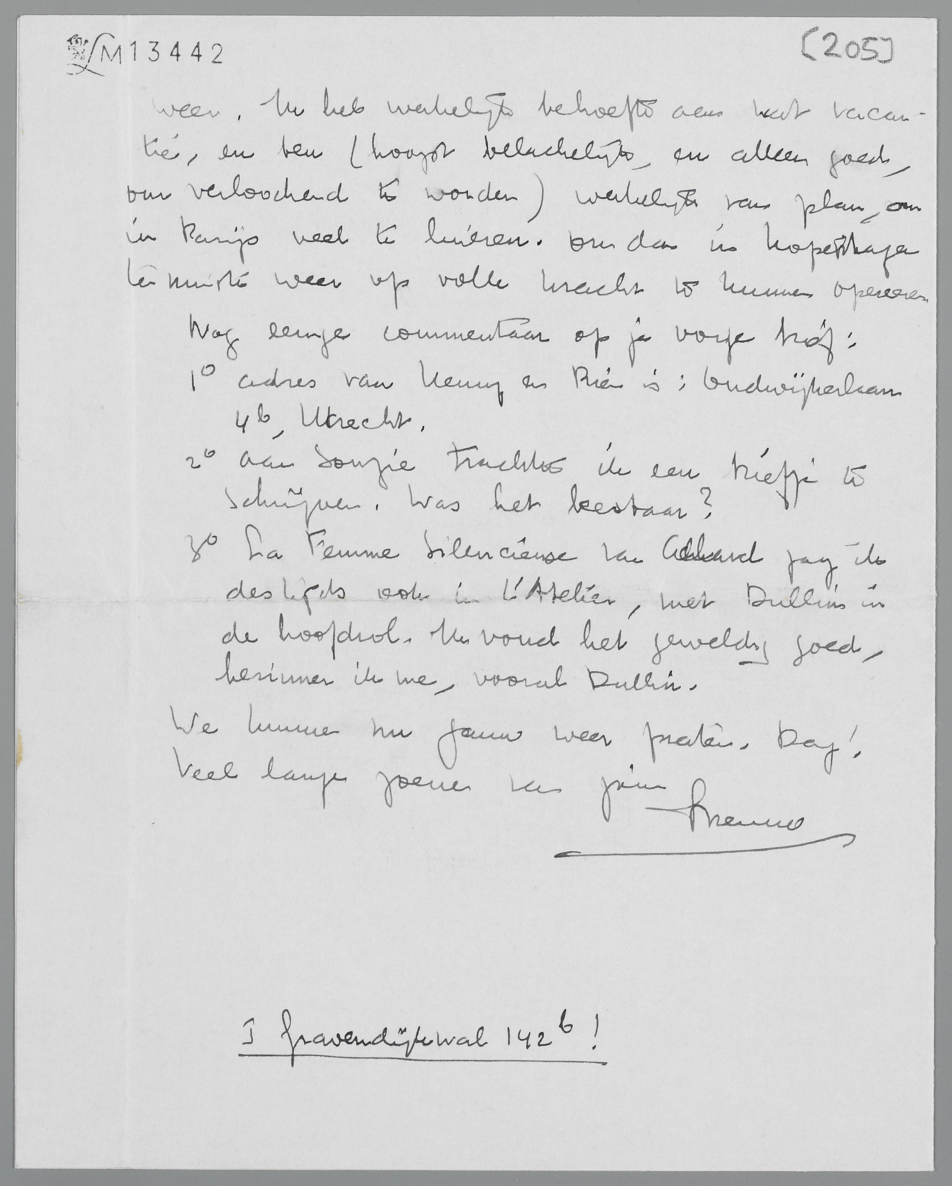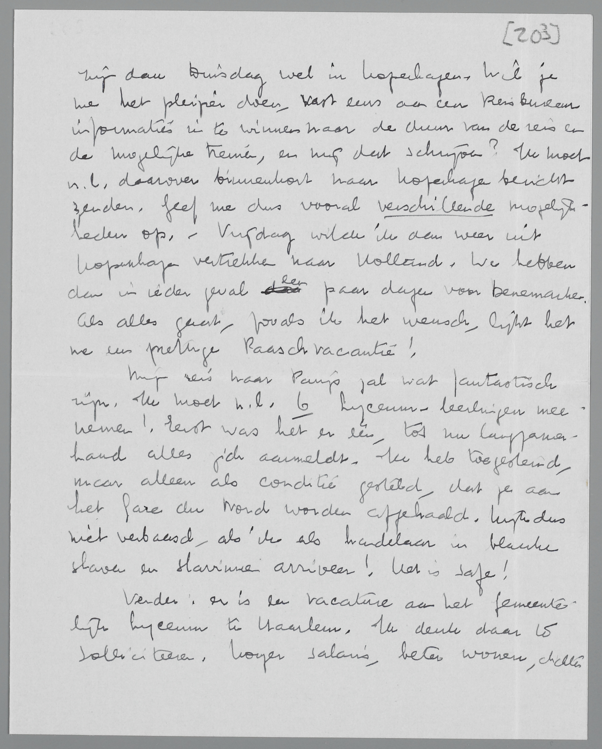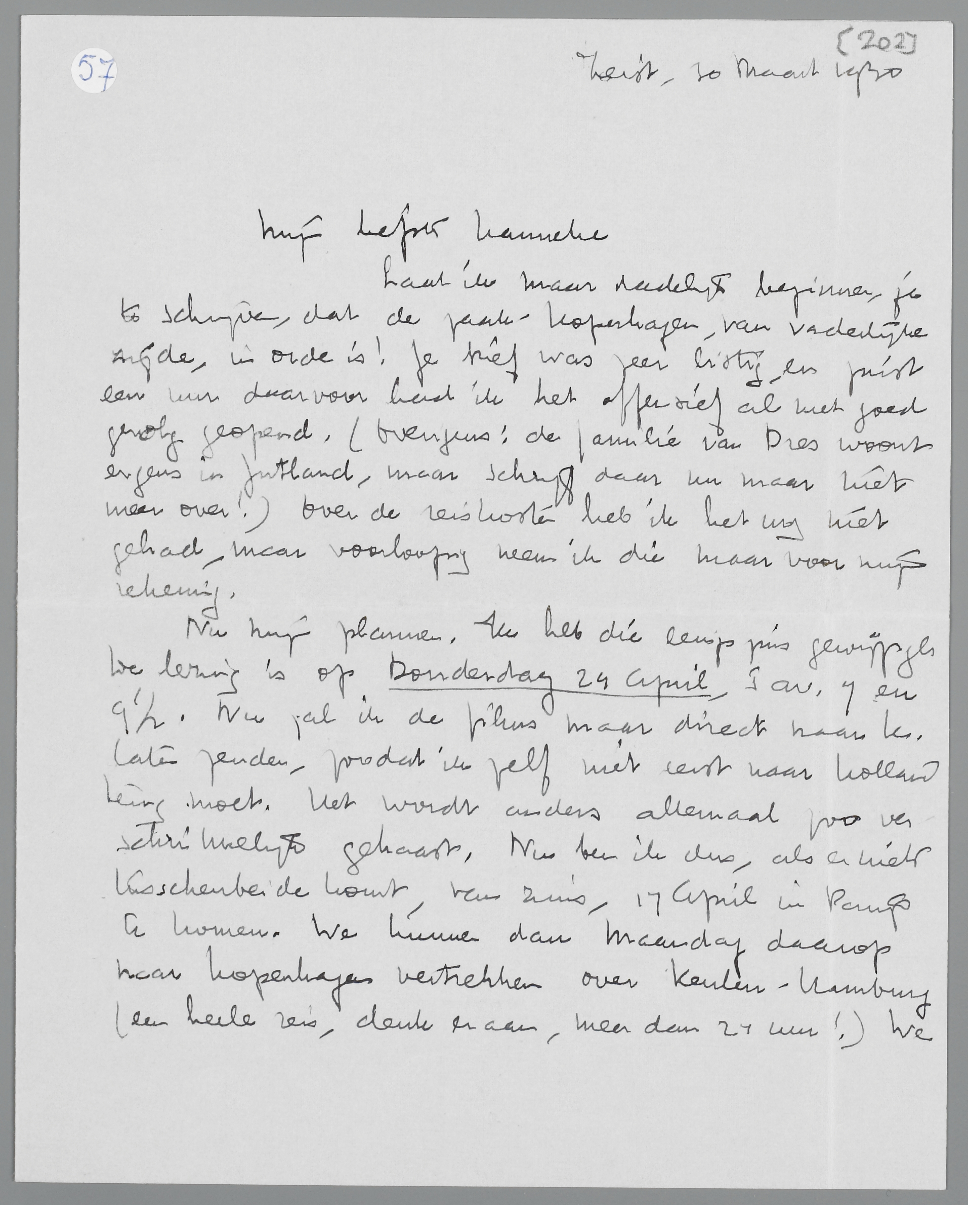 Nu mijn plannen. Ik heb die eenigszins gewijzigd. De lezing is op Donderdag 24 april, s'av. 7 en 9 1/2. Nu zal ik de films maar direct naar K. laten zenden, zoodat ik zelf niet eerst naar Holland terug moet. Het wordt anders allemaal zoo verschrikkelijk gehaast. Nu ben ik dus, als er niets tusschenbeide komt, van zins, 17 april in Parijs te komen. We kunnen dan maandag daarop naar Kopenhagen vertrekken over Keulen-Hamburg (een heele reis, denk er aan, meer dan 24 uur!) We zijn dan Dinsdag wel in Kopenhagen. Wil je me het pleizier doen, vast eens aan een Reisbureau informatie in te winnen naar de duur van de reis en de mogelijke treinen, en mij dat schrijven? Ik moet n.l. daarover binnenkort naar Kopenhagen bericht zenden. Geef me dus vooral verschillende mogelijkheden op. Vrijdag wilde ik dan weer uit Kopenhagen vertrekken naar Holland. We hebben dan in ieder geval een paar dagen voor Denemarken. Als alles gaat, zooals ik het wensch, lijkt het me een prettige Paaschvacantie!