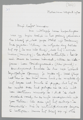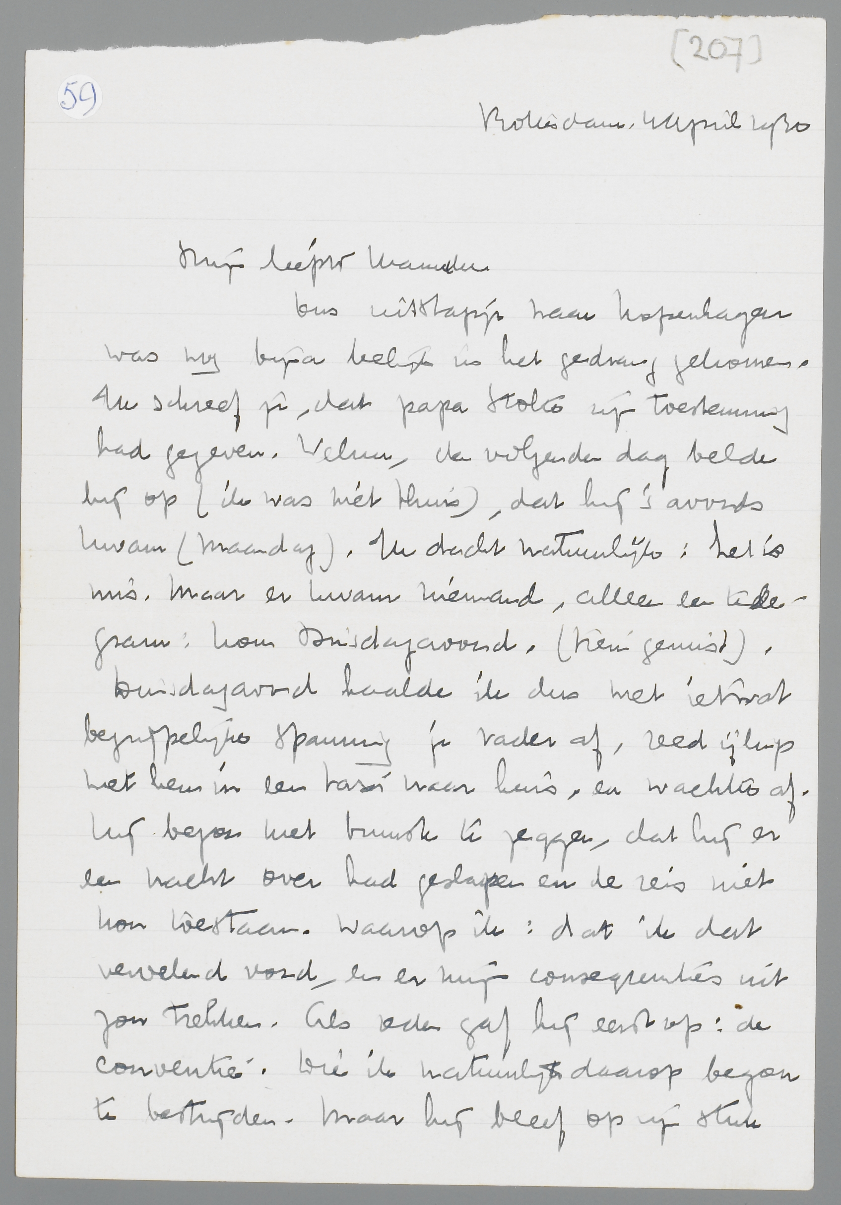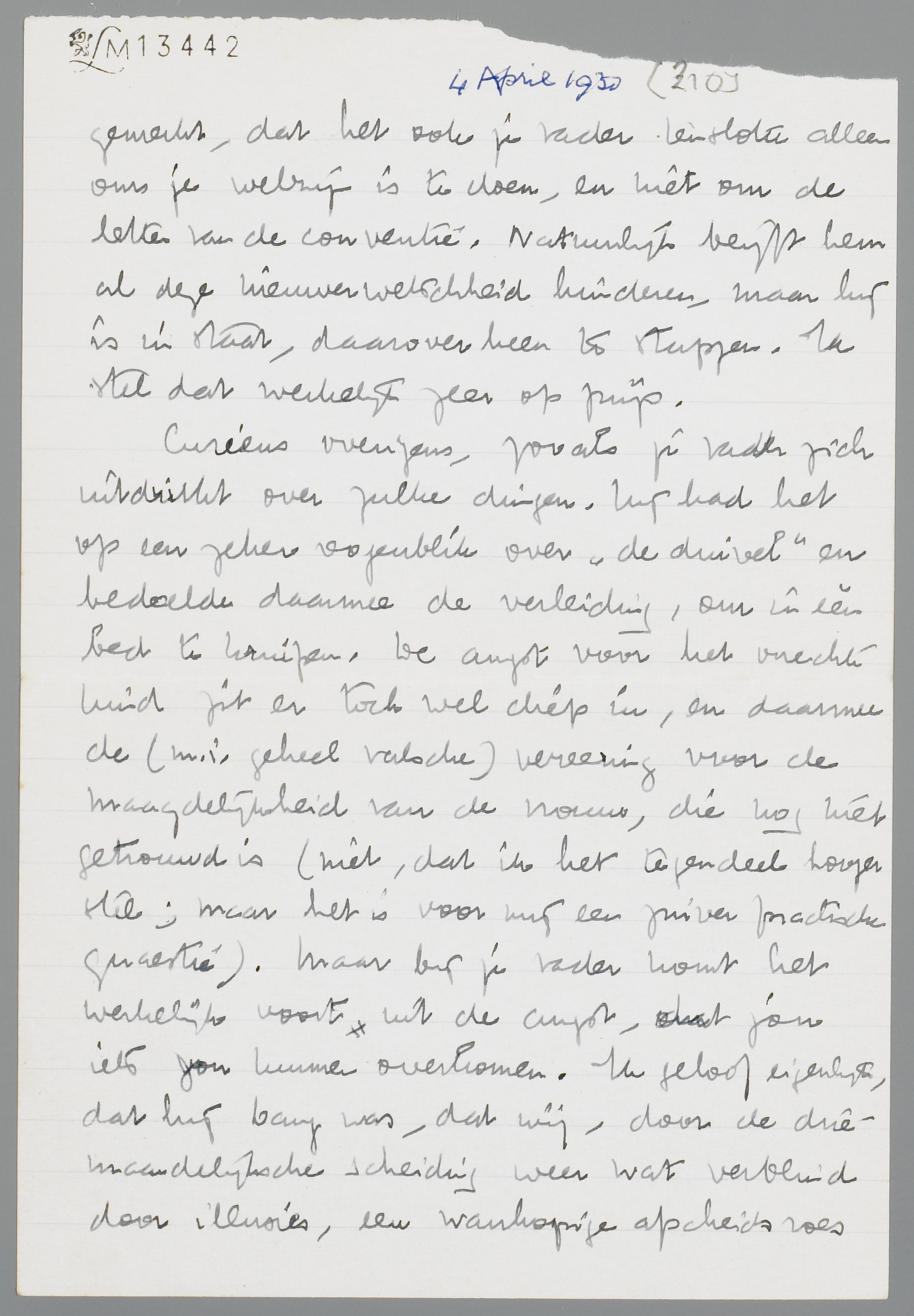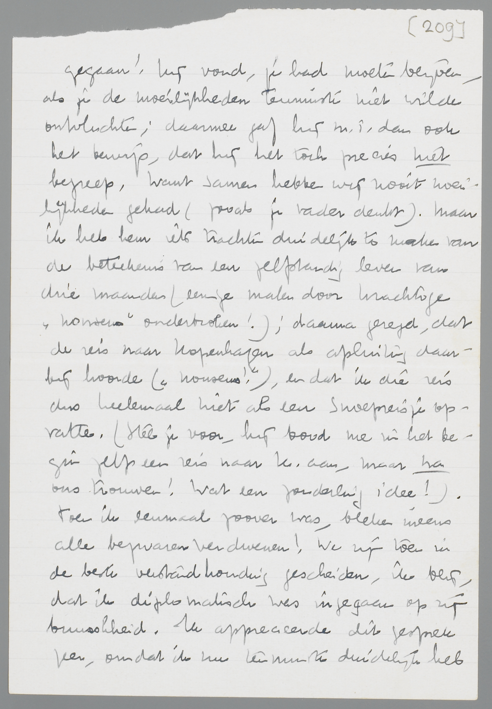 Curieus overigens, zooals je vader zich uitdrukt over zulke dingen. Hij had het op een zeker oogenblik over ‘de duivel’ en bedoelde daarmee de verleiding, om in één bed te kruipen. De angst voor het onechte kind zit er toch wel diep in, en daarmee de (m.i. geheel valsche) vereering voor de maagdelijkheid van de vrouw, die nog niet getrouwd is (niet, dat ik het tegendeel hooger stel; maar het is voor mij een zuiver practische quaestie). Maar bij je vader komt het werkelijk voort uit de angst, jou iets zou kunnen overkomen. Ik geloof eigenlijk, dat hij bang was, dat wij, door de driemaandelijkse scheiding weer wat verblind door illusies, een wanhopige afscheidsroes wilden vieren, waarvan jij dan de dupe zou kunnen worden. Nu, ik heb hem dienomtrent gerustgesteld, en hij heeft nu voluit en werkelijk gerust zijn toestemming gegeven. Natuurlijk heb ik bijna moeten zweren, dat we in Kopenhagen in gescheiden huizen zouden logeeren...