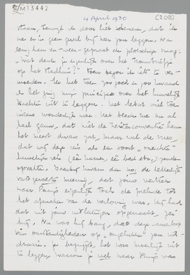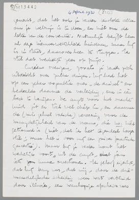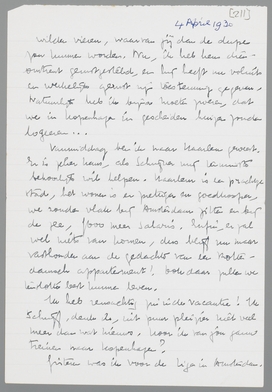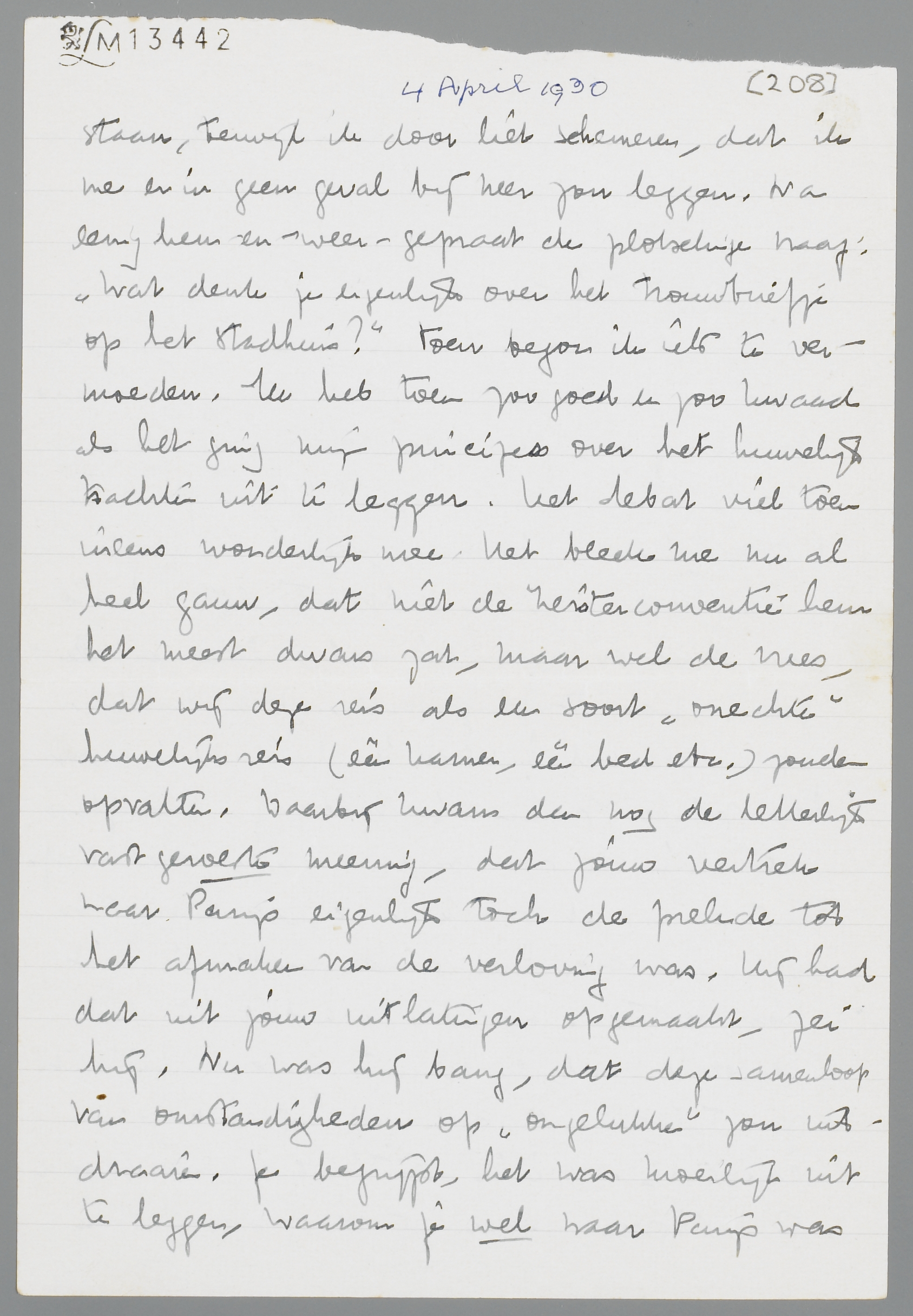 Ons uitstapje naar Kopenhagen was nog bijna lelijk in het gedrang gekomen. Ik schreef je, dat papa Stolte zijn toestemming had gegeven. Welnu, de volgende dag belde hij op (ik was niet thuis), dat hij 's avonds kwam (Maandag). Ik dacht natuurlijk: het is mis. Maar er kwam niemand, alleen een telegram: kom Dinsdagavond. (Trein gemist). Dinsdagavond haalde ik dus met ietwat begrijpelijke spanning je vader af, reed ijlings met hem in een taxi naar huis, en wachtte af. Hij begon met bruusk te zeggen, dat hij er een nacht over had geslapen en de reis niet kon toestaan. Waarop ik: dat ik dat vervelend vond, en er mijn consequenties uit zou trekken. Als vader gaf hij eerst op: de conventie. Die ik natuurlijk daarop begon te bestrijden. Maar hij bleef op zijn stuk staan, terwijl ik door liet schemeren, dat ik me er in geen geval bij neer zou leggen. Na eenig heen-en-weer-gepraat de plotselinge vraag: ‘Wat denk je eigenlijk over het trouwbriefje op het stadhuis?’ Toen begon ik iets te vermoeden. Ik heb toen zoo goed en zoo kwaad als het ging mijn principes over het huwelijk trachten uit te leggen. Het debat viel toen ineens wonderlijk mee. Het bleek me nu al heel gauw, dat niet de Zeister conventie hem het meest dwars zat, maar wel de vrees, dat wij deze reis als een soort ‘onechte’ huwelijksreis (één kamer, één bed etc.) zouden opvatten. Daarbij kwam dan nog de letterlijk vastgeroeste meening, dat jouw vertrek naar Parijs eigenlijk toch de prelude tot het afmaken van de verloving was. Hij had dat uit jouw uitlatingen opgemaakt, zei hij. Nu was hij bang, dat deze samenloop van omstandigheden op ‘ongelukken’ zou uitdraaien. Je begrijpt, het was moeilijk uit te leggen, waarom je wel naar Parijs was gegaan! Hij vond, je had moeten blijven, als je de moeilijkheden tenminste niet wilde ontvluchten; daarmee gaf hij m.i. dan ook het bewijs, dat hij het toch precies niet begreep, want samen hebben wij nooit moeilijkheden gehad (zooals je vader denkt). Maar ik heb hem iets trachten duidelijk te maken van de beteekenis van een zelfstandig leven van drie maanden (eenige malen door krachtige ‘nonsens’ onderbroken!); daarna gezegd, dat de reis naar Kopenhagen als afsluiting daarbij hoorde (‘nonsens’), en dat ik die reis dus helemaal niet als een snoepreisje opvatte. (Stel je voor, hij bood me in het begin zelfs een reis naar K. aan, maar na ons trouwen! Wat een zonderling idee!). Toen ik eenmaal zoover was, bleken ineens alle bezwaren verdwenen! We zijn toen in de beste verstandhouding gescheiden, ik blij, dat ik diplomatisch was ingegaan op zijn bruuskheid. Ik apprecieerde dit gesprek zeer, omdat ik nu tenminste duidelijk heb gemerkt, dat het ook je vader tenslotte alleen om je welzijn is te doen, en niet om de letter van de conventie. Natuurlijk blijft hem al deze nieuwerwetschheid hinderen, maar hij is in staat, daarover heen te stappen. Ik stel dat werkelijk zeer op prijs.