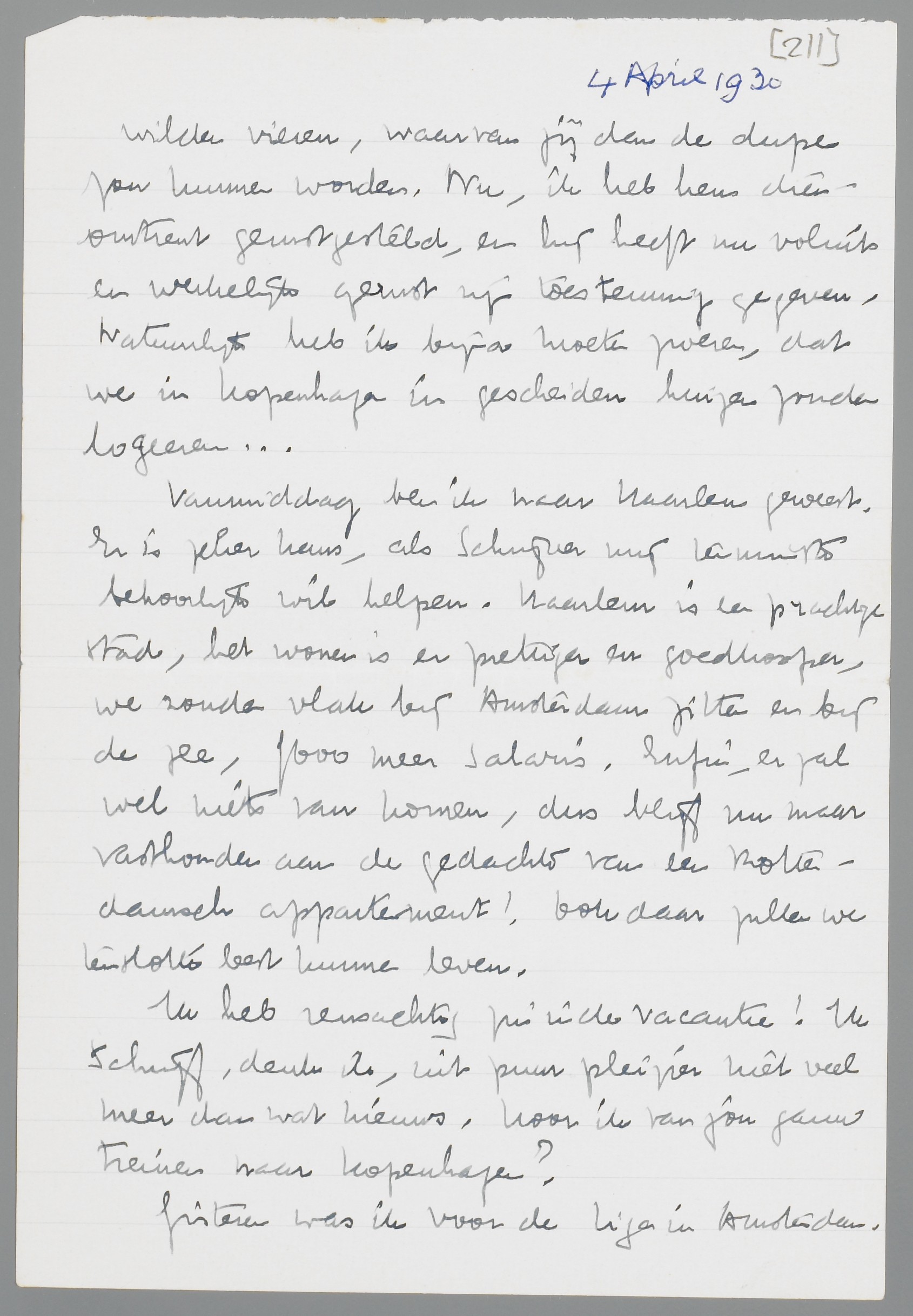 Vanmiddag ben ik naar Haarlem geweest. Er is zeker kans, als Schrijver mij tenminste behoorlijk wil helpen. Haarlem is een prachtige stad, het wonen is er prettiger en goedkooper, we zouden vlak bij Amsterdam zitten en bij de zee, ƒ600 meer salaris. Enfin, er zal wel niets van komen, dus blijf nu maar vasthouden aan de gedachte van een Rotterdamsch appartement! Ook daar zullen we tenslotte best kunnen leven.