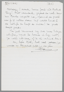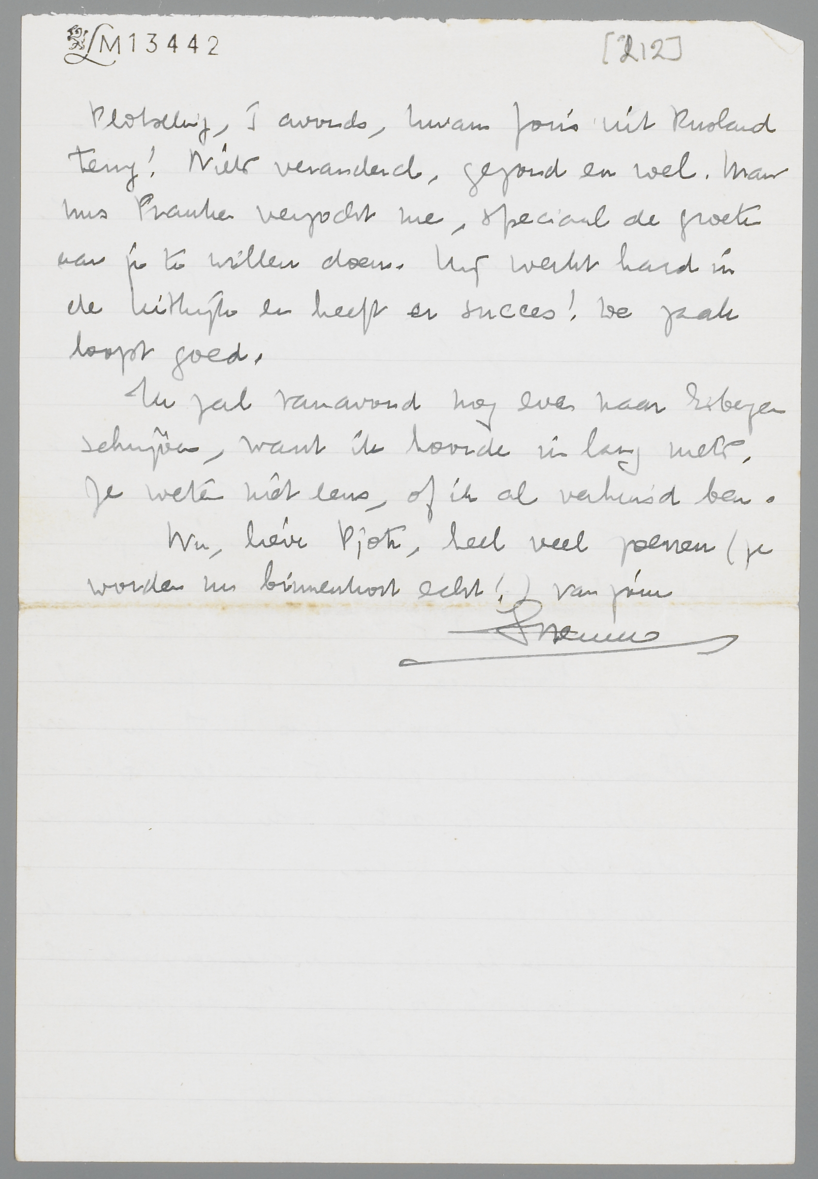 Gisteren was ik voor de Liga in Amsterdam. Plotseling, 's avonds, kwam Joris uit Rusland terug! Niets veranderd, gezond en wel. Maar Nus Franken verzocht me, speciaal de groeten aan je te willen doen. Hij werkt hard in de Uitkijk en heeft er succes! De zaak loopt goed.