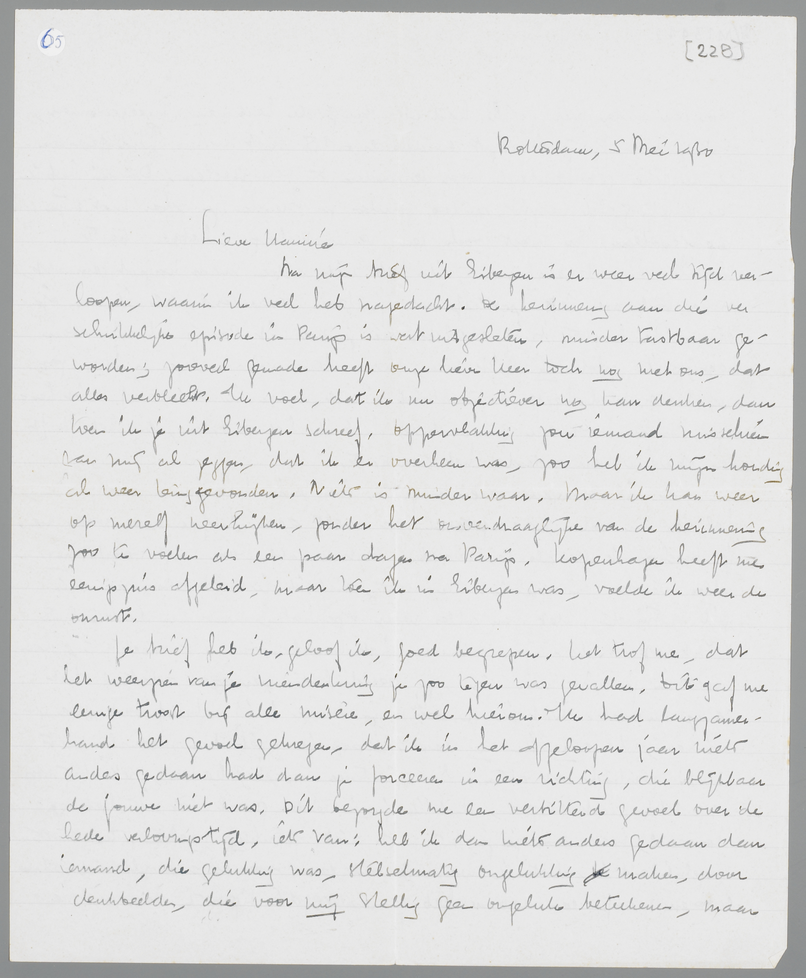 Na mijn brief uit Eibergen is er weer veel tijd verloopen, waarin ik veel heb nagedacht. De herinnering aan die verschrikkelijke episode in Parijs is wat uitgesleten, minder tastbaar geworden; zooveel genade heeft onze lieve heer toch nog met ons, dat alles verbleekt. Ik voel, dat ik nu objectiever nog kan denken dan toen ik je uit Eibergen schreef. Oppervlakkig zou iemand misschien van mji al zeggen, dat ik er overheen was, zoo heb ik mijn houding al weer teruggevonden. Niets is minder waar. Maar ik kan weer op mezelf neerkijken, zonder het onverdraaglijke van de herinnering zoo te voelen als een paar dagen na Parijs. Kopenhagen heeft me eenigszins afgeleid, maar toen ik in Eibergen was, voelde ik weer de onrust.