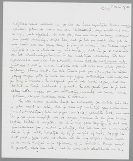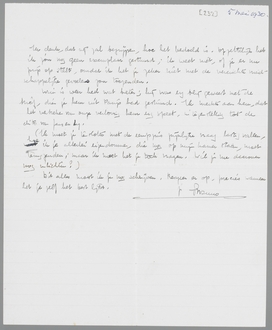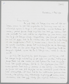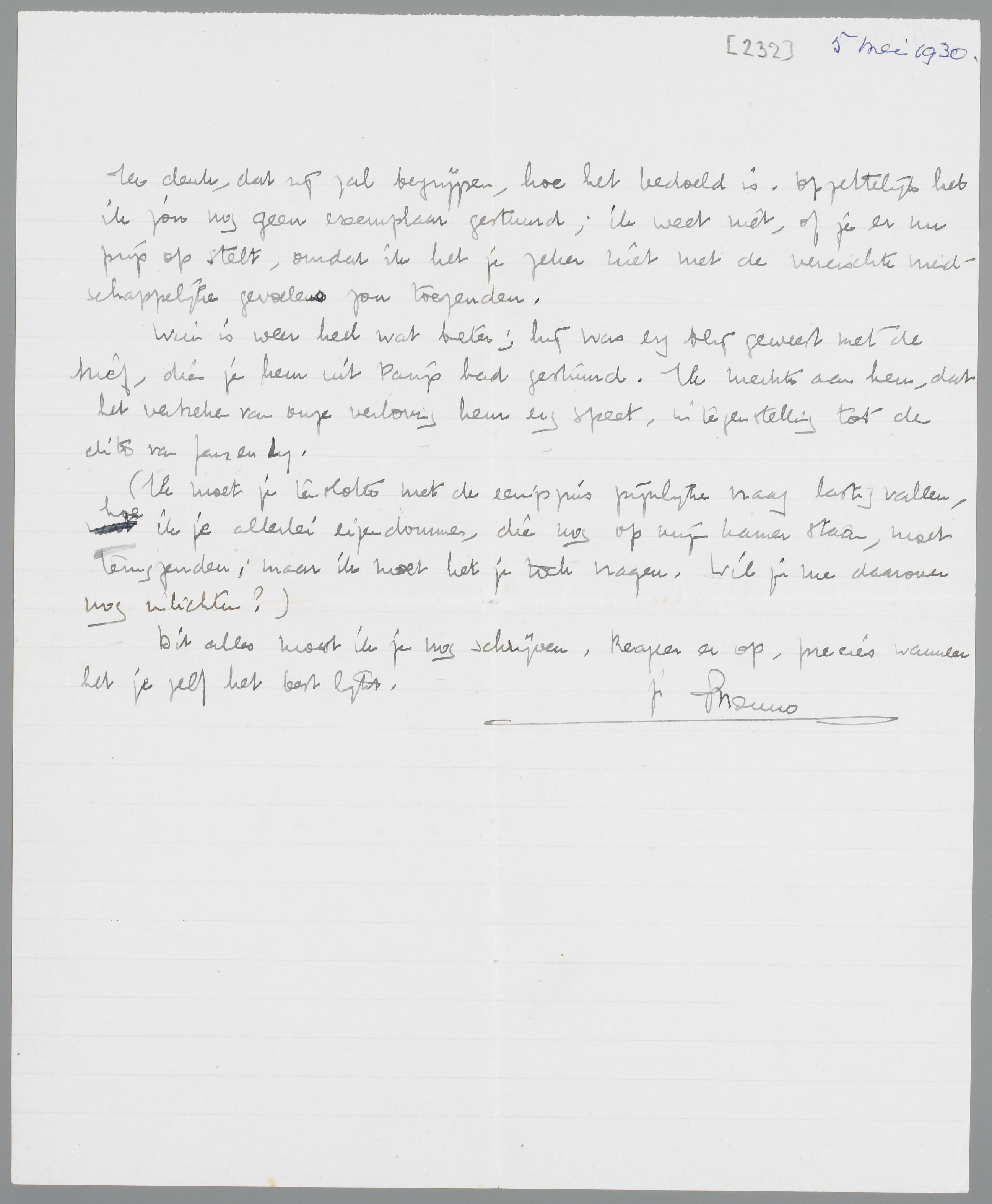 Je brief heb ik, geloof ik, goed begrepen. Het trof me, dat het weerzien van je vriendenkring je zoo tegen was gevallen. Dit gaf me eenige troost bij alle misère, en wel hierom. Ik had langzamerhand het gevoel gekregen, dat ik in het afgeloopen jaar niets anders gedaan had dan je forceeren in een richting, die blijkbaar de jouwe niet was. Dit bezorgde me een verbitterd gevoel over de hele verlovingstijd, iets van: heb ik dan niets anders gedaan dan iemand, die gelukkig was, stelselmatig ongelukkig maken, door denkbeelden, die voor mij stellig geen ongeluk beteekenen, maar voor een ander wel! Ik had uit Parijs de herinnering meegenomen, dat je aan Parijs vastzat en dus eigenlijk niet anders had gedaan dan de ééne gebondenheid voor de andere te verwisselen. Daarin heb ik me ongetwijfeld vergist, anders zouden je vrienden je zeker niet zijn tegengevallen. Er moet toch een verwantschap (hebben) bestaan tusschen onze levenslijnen; ik heb niet alleen kapot gemaakt, maar toch ook iets positiefs aan je leven veranderd. Als ik dan op één na de laatste brief overlees, die je me uit Parijs schreef, dan begrijp ik plotseling niet meer, hoe alles zich in deze richting zoo vervloekt snel heeft ontwikkeld. Eerst wilde ik die brief niet herlezen, maar voor een paar dagen heb ik het gedaan, en het heeft me opnieuw verwonderd, het contrast.