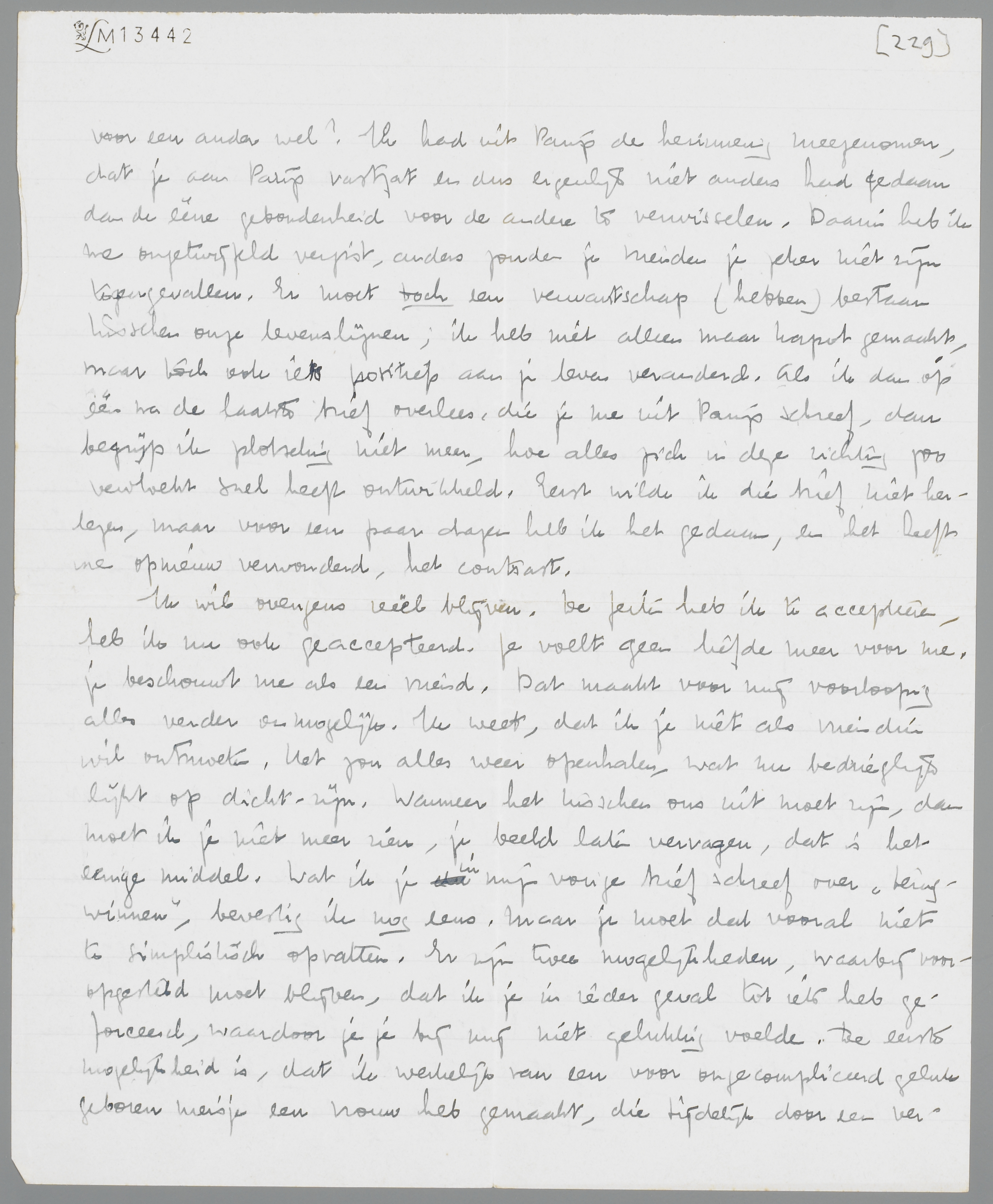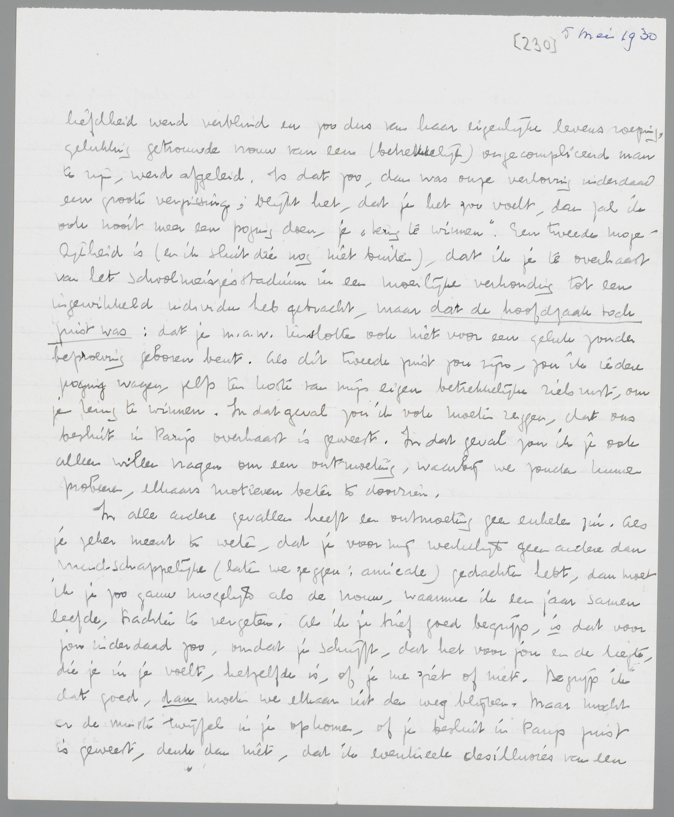 In alle andere gevallen heeft een ontmoeting geen enkelen zin. Als je zeker meent te weten, dat je voor mij geen andere dan vriendschappelijke (laten we zeggen: amicale) gedachten hebt, dan moet ik je zoo gauw mogelijk als de vrouw, waarmee ik een jaar samenleefde, trachten te vergeten. Als ik je brief goed begrijp, is dat voor jou inderdaad zoo, omdat je schrijft, dat het voor jou en de liefde, die je in je voelt, hetzelfde is, of je me ziet of niet. Begrijp ik dat goed, dan moeten we elkaar uit den weg blijven. Maar mocht er de minste twijfel in je opkomen, of je besluit in Parijs juist is geweest, denk dan niet, dat ik eventueele desillusies van een ontmoeting niet zou kunnen of willen riskeeren. Ik geloof, dat ik je zoo het beste duidelijk gemaakt heb, wat ik met ‘terugwinnen’ bedoel. Het is niet, de naïeve verwachting dat het perse weer in orde moet of zal komen. Maar omdat ik voor mij het tegendeel niet kan uitsluiten, zeg ik je, waartoe ik bereid ben. Het is evengoed mogelijk, dat je van iemand anders gaat houden, het zou zelfs nog mogelijk zijn, dat je met iemand anders ongelukkig werd, zoodat je pas dan zou kunnen inzien, waarom ik van je houd, waarom het dus ook onjuist is, als je schrijft, dat mijn werk no.1 was. Dat je dat zoo ziet, is misschien het bewijs, dat ik je geforceerd heb; dat je de uren, dat ik werkte, als diefstal of verraad beschouwde, geeft me inderdaad de overtuiging, dat ik veel te veel opeens van je geëischt heb.