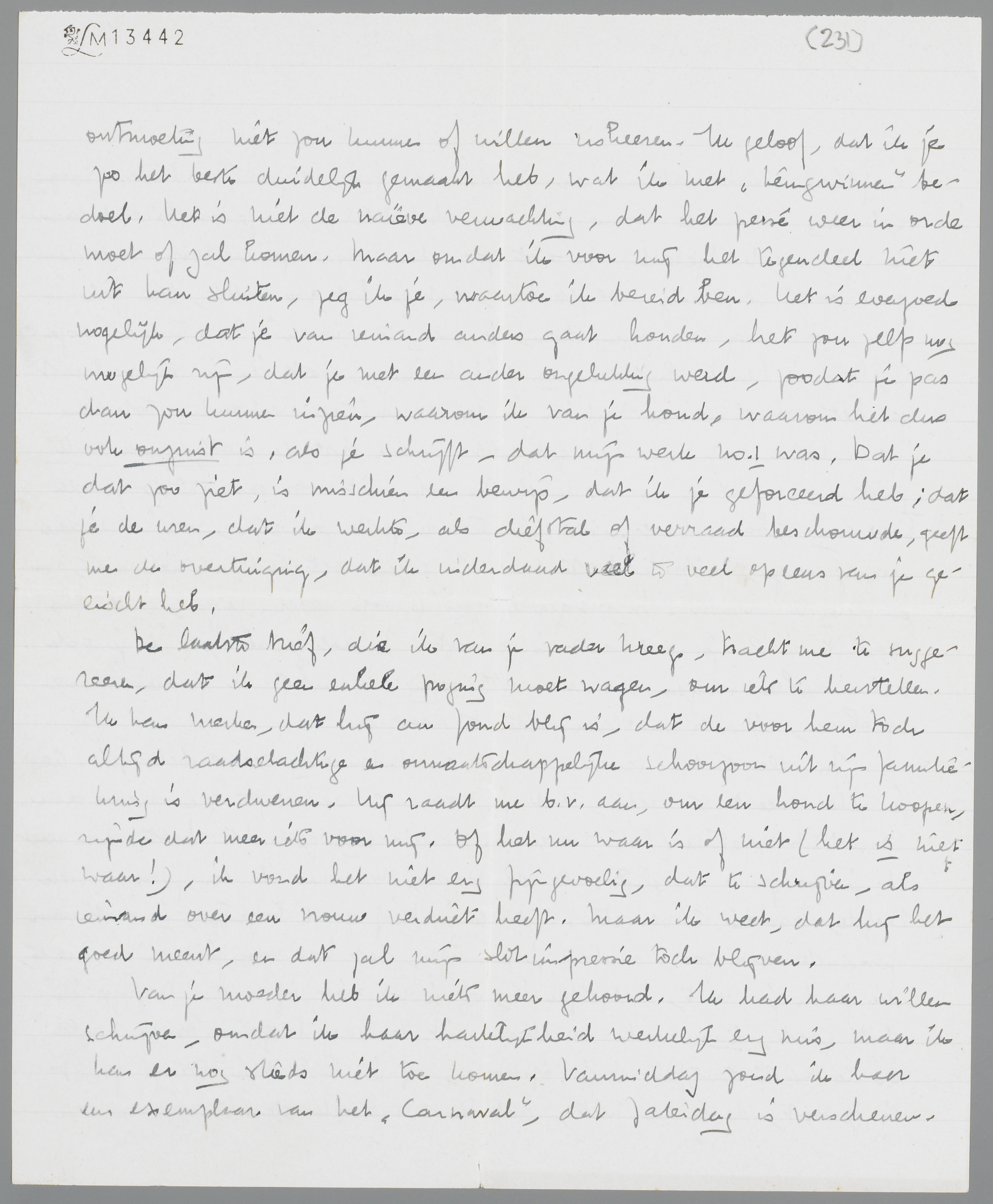 Van je moeder heb ik niets meer gehoord. Ik had haar willen schrijven, omdat ik haar hartelijkheid werkelijk erg mis, maar ik kan er nog steeds niet toe komen. Vanmiddag zond ik haar een exemplaar van het ‘Carnaval’, dat Zaterdag is verschenen. Ik denk, dat zij zal begrijpen, hoe het bedoeld is. Opzettelijk heb ik jou nog geen exemplaar gestuurd; ik weet niet, of je er nu prijs op stelt, omdat ik het je zeker niet met de vereischte vriendschappelijke gevoelens zou toezenden.