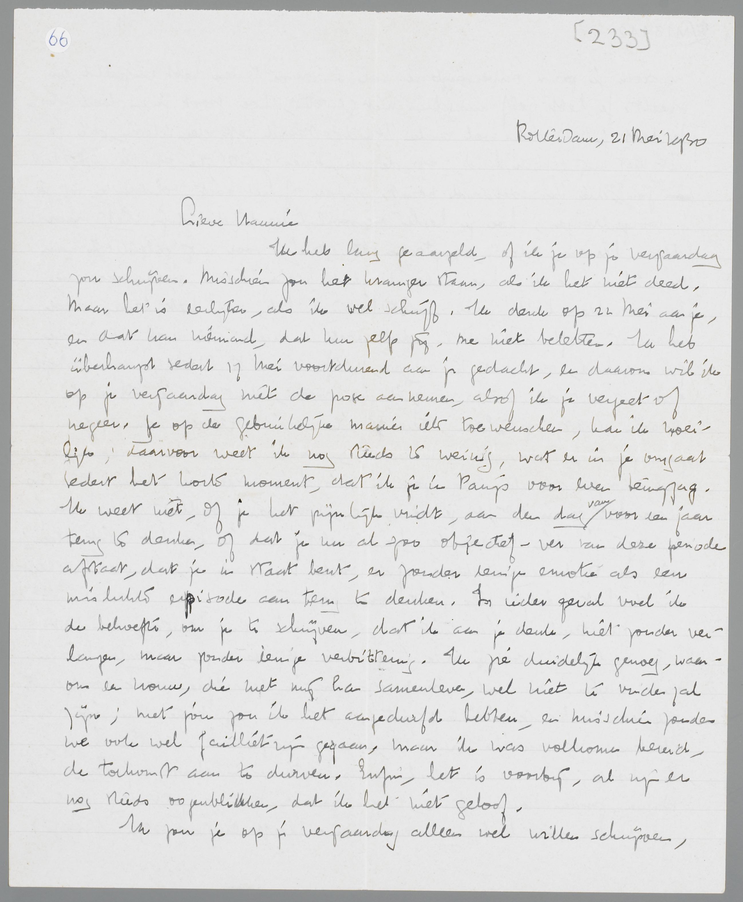 Ik heb lang geaarzeld, of ik je op je verjaardag zou schrijven. Misschien zou het kraniger staan, als ik het niet deed. Maar het is eerlijker, als ik wel schrijf. Ik denk op 21 Mei aan je, en dat kan niemand, dat kan zelfs jij, me niet beletten. Ik heb überhaupt sedert 17 Mei voortdurend aan je gedacht, en daarom wil ik op je verjaardag niet de pose aannemen, alsof ik je vergeet of negeer. Je op de gebruikelijke manier iets toewenschen, kan ik moeilijk. Daarvoor weet ik nog steeds te weinig, wat er in je omgaat sedert het korte moment, dat ik je in Parijs voor even terugzag. Ik weet niet, of je het pijnlijk vindt, aan de dag van voor een jaar terug te denken, of dat je nu al zoo objectief-ver van deze periode afstaat, dat je in staat bent, er zonder eenige emotie als een mislukte episode aan terug te denken. In ieder geval voel ik de behoefte om je te schrijven, dat ik aan je denk, niet zonder verlangen, maar zonder eenige verbittering. Ik zie duidlijk genoeg, waarom een vrouw, die met mij kan samenleven, wel niet te vinden zal zijn; met jou zou ik het aangedurfd hebben, en misschien zouden we ook wel failliet zijn gegaan, maar ik was volkomen bereid, de toekomst aan te durven. Enfin, het is voorbij, al zijn er nog steeds oogenblikken, dat ik het niet geloof.