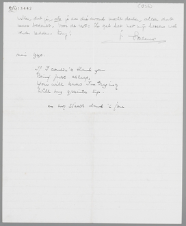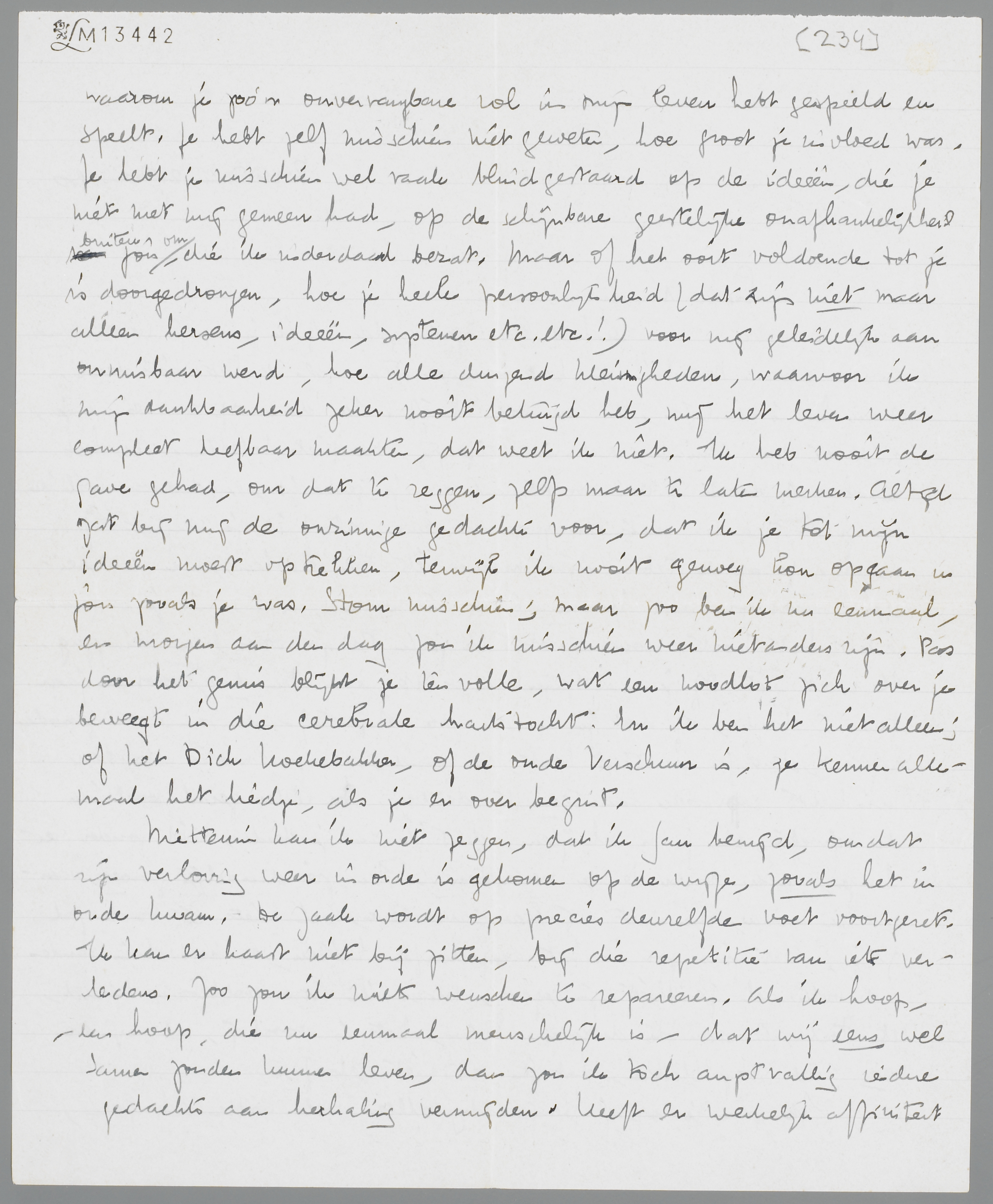 Ik zou je op je verjaardag alleen wel willen schrijven, waarom je zoo’n onvervangbare rol in mijn leven hebt gespeeld en speelt. Je hebt zelf misschien niet geweten, hoe groot je invloed was. Je hebt je misschien wel vaak blind gestaard op de ideeën, die je niet met mij gemeen had, op de schijnbare geestelijke onafhankelijkheid buiten jou om, die ik inderdaad bezat. Maar of het ooit voldoende tot je is doorgedrongen, hoe je heele persoonlijkheid (dat zijn niet maar alleen hersens, ideeën, systemen, etc. etc!) voor mij geleidelijk aan onmisbaar werd, hoe alle duizend kleinigheden, waarvoor ik mijn dankbaarheid zeker nooit betuigd heb, mij het leven weer compleet leefbaar maakten, dat weet ik niet. Ik heb nooit de gave gehad om dat te zeggen, zelfs maar te laten merken. Altijd gaat bij mij de onzinnige gedachte voor, dat ik je tot mijn ideeën moet optrekken, terwijl ik nooit genoeg kon opgaan in jou zoals je was. Stom misschien, maar zoo ben ik nu eenmaal, en morgen aan den dag zou ik misschien weer niet anders zijn. Pas door het gemis blijkt je ten volle, wat een noodlot zich over je beweegt in die cerebrale hartstocht. En ik ben het niet alleen; of het Dick Koekebakker, of de oude Verschuur is, ze kennen allemaal het liedje, als je er over begint.