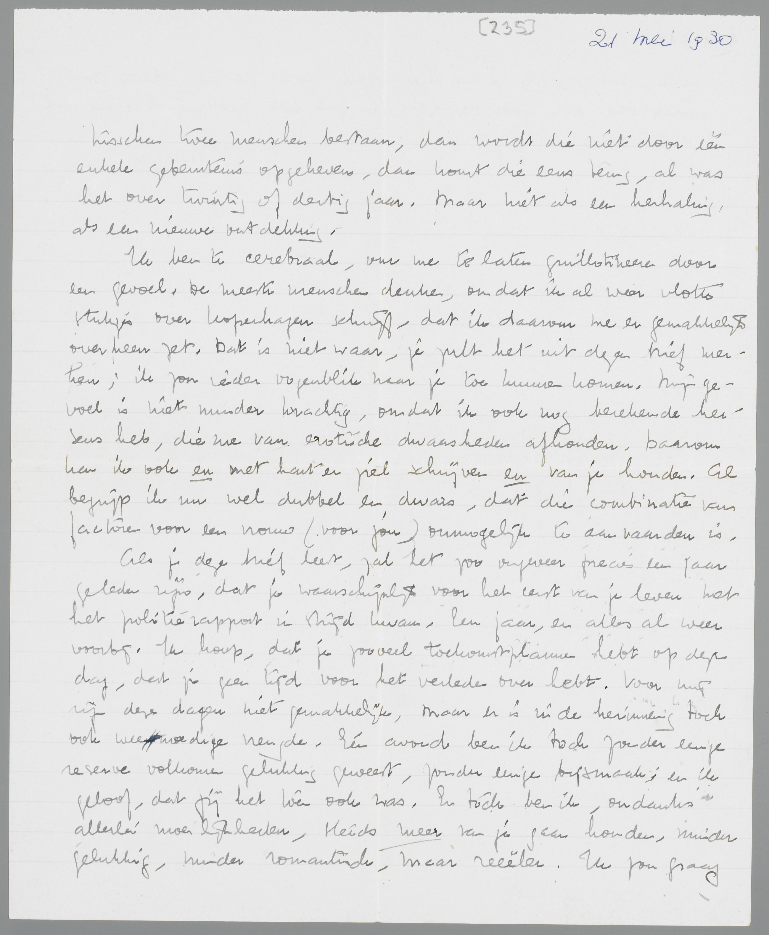 Ik ben te cerebraal, om me te laten guillotineeren door een gevoel. De meeste mensen denken, omdat ik al weer vlotte stukjes over Kopenhagen schrijf, dat ik daarom me er gemakkelijk overheen zet. Dat is niet waar, je zult het uit dezen brief weten; ik zou ieder ogenblik naar je toe kunnen komen. Mijn gevoel is niet minder krachtig, omdat ik ook nog berekende hersens heb, die me van erotische dwaasheden afhouden. Daarom kan ik ook en met hart en ziel schrijven, en van je houden. Al begrijp ik nu wel dubbel en dwars, dat die combinatie van factoren voor een vrouw (voor jou) onmogelijk te aanvaarden is.