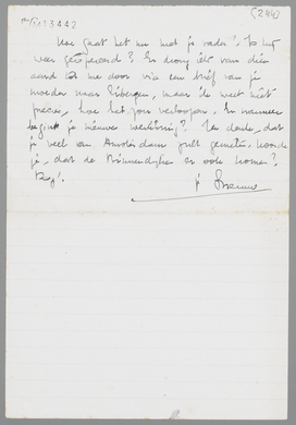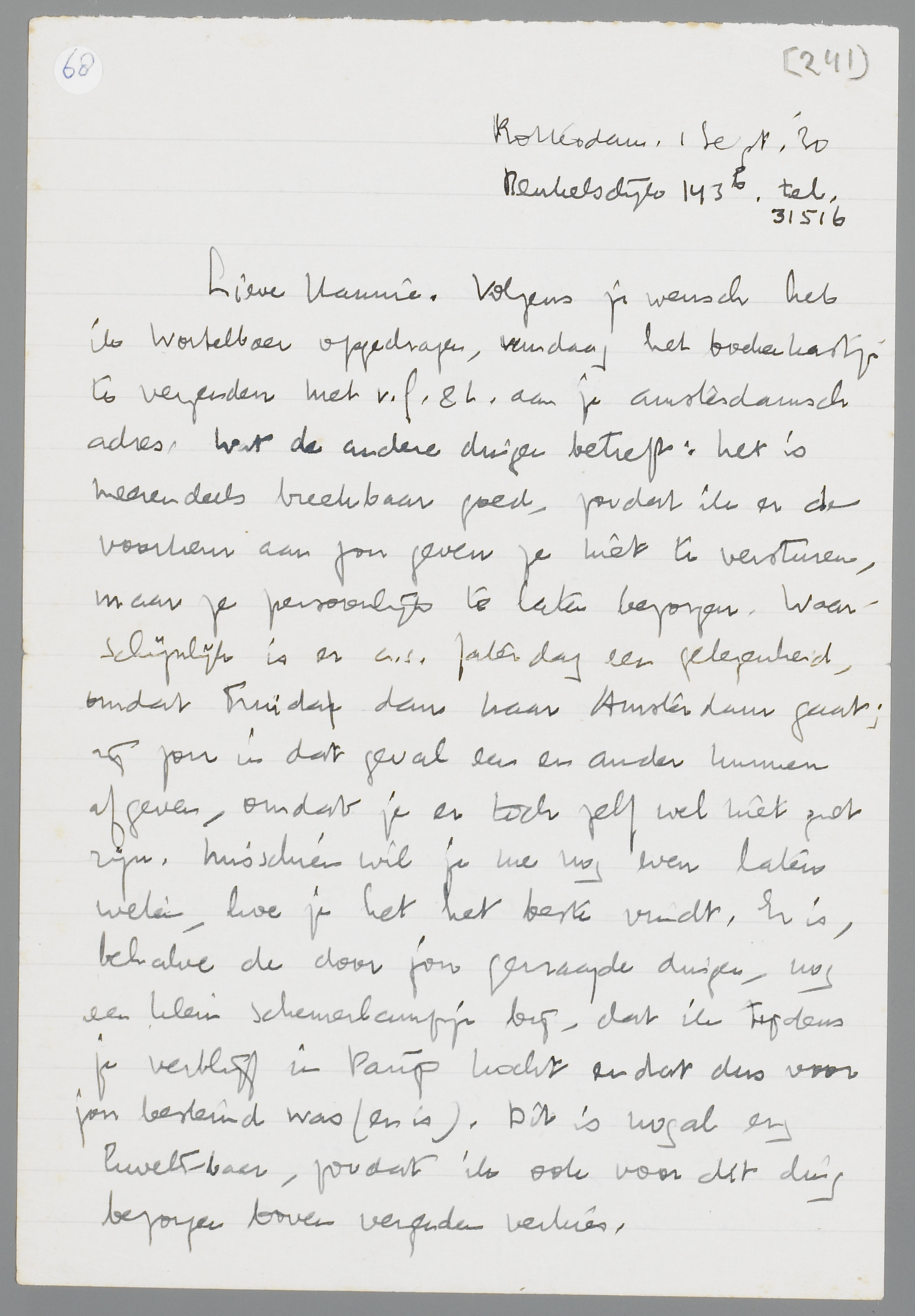 Volgens je wensch heb ik Wortelboer opgedragen, vandaag het boekenkastje te verzenden met v.g.& h. aan je amsterdamsch adres. Wat de andere dingen betreft: het is meerendeels breekbaar goed, zoodat ik er de voorkeur aan zou geven ze niet te versturen, maar ze persoonlijk te laten bezorgen. Waarschijnlijk is er a.s. Zaterdag een gelegenheid, omdat Truida dan naar Amsterdam gaat. Zij zou in dat geval een en ander kunnen afgeven, omdat je er toch zelf wel niet zal zijn. Misschien wil je me nog even laten weten, hoe je het het beste vindt. Er is, behalve de door jou gevraagde dingen, nog een klein schemerlampje bij, dat ik tijdens je verblijf in Parijs kocht en dat dus voor jou bestemd was (en is). Dit is nogal erg kwetsbaar, zoodat ik ook voor dit ding bezorgen boven verzenden verkies.