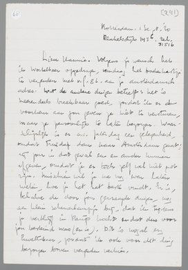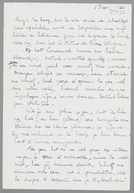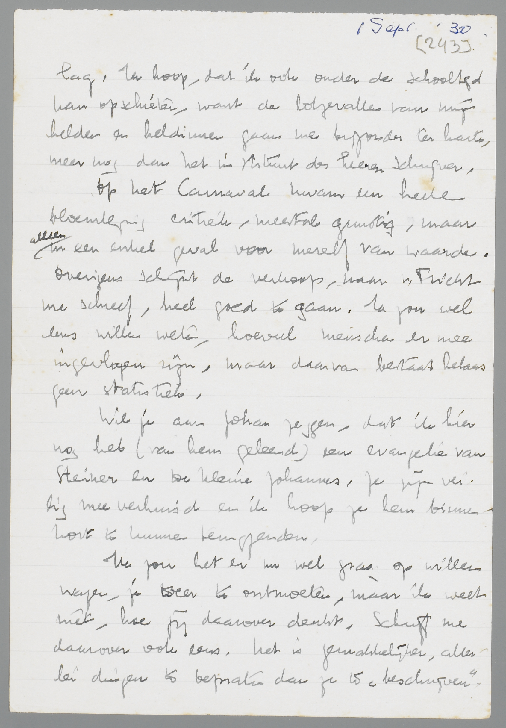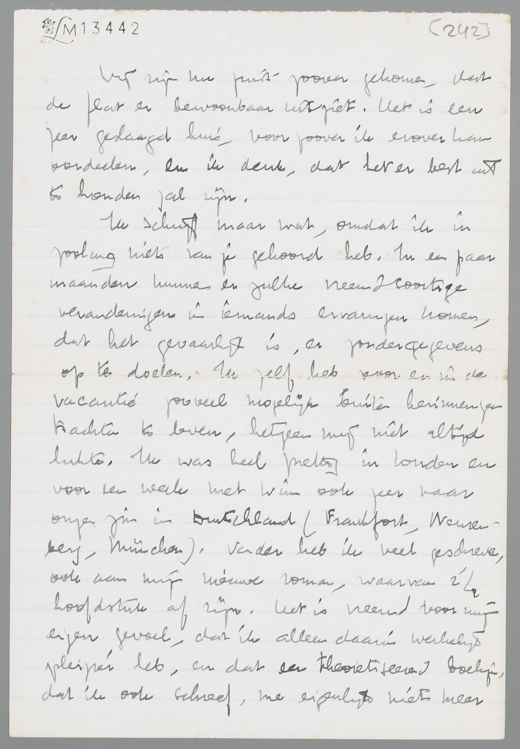 Ik schrijf maar wat, omdat ik in zoolang niets van je gehoord heb. In een paar maanden kunnen er zulke vreemdsoortige veranderingen in iemands ervaringen komen, dat het gevaarlijk is, er zonder gegevens op te doelen. Ik zelf heb voor en in de vacantie zooveel mogelijk buiten herinneringen trachten te leven, hetgeen mij niet altijd lukte. Ik was heel prettig in Londen en voor een week met Wim ook zeer naar onze zin in Duitsland (Frankfort, Neurenberg, München). Verder heb ik veel geschreven, ook aan mijn nieuwe roman, waarvan 2½ hoofdstuk af zijn. Het is vreemd voor mijn eigen gevoel, dat ik alleen daarin werkelijk pleizier heb, en dat een theoretiseerend boekje dat ik ook schreef, me eigenlijk niet meer lag. Ik hoop, dat ik ook onder de schooltijd kan opschieten, want de lotgevallen van mijn helden en heldinnen gaan me bijzonder ter harte, meer nog dan het instituut des heeren Schrijver.