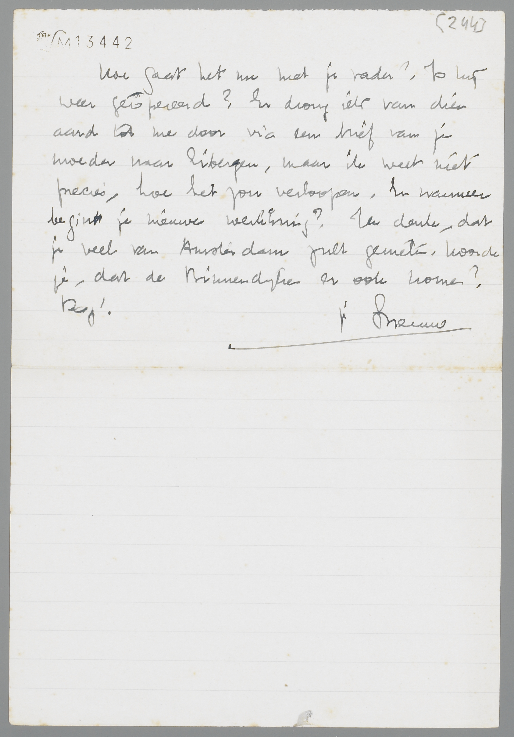 Hoe gaat het nu met je vader? Is hij weer geopereerd? Er drong iets van dien aard tot me door via een brief van je moeder naar Eibergen, maar ik weet niet precies, hoe het zou verloopen. En wanneer begint je nieuwe werkkring? Ik denk, dat je veel van Amsterdam zult genieten. Hoorde je, dat de Binnendijken er ook komen?