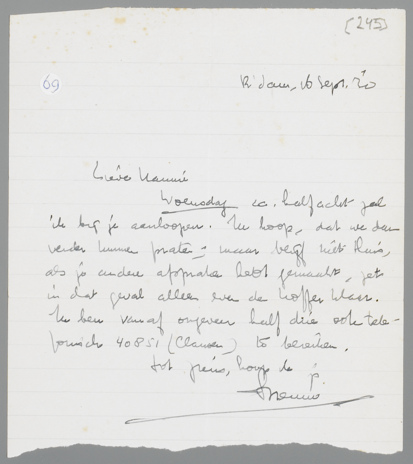 Woensdag ca. half acht zal ik bij je aanloopen. Ik hoop, dat we dan verder kunnen praten; maar blijf niet thuis, als je andere afspraken hebt gemaakt. Zet in dat geval alleen even de koffer klaar.