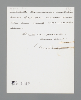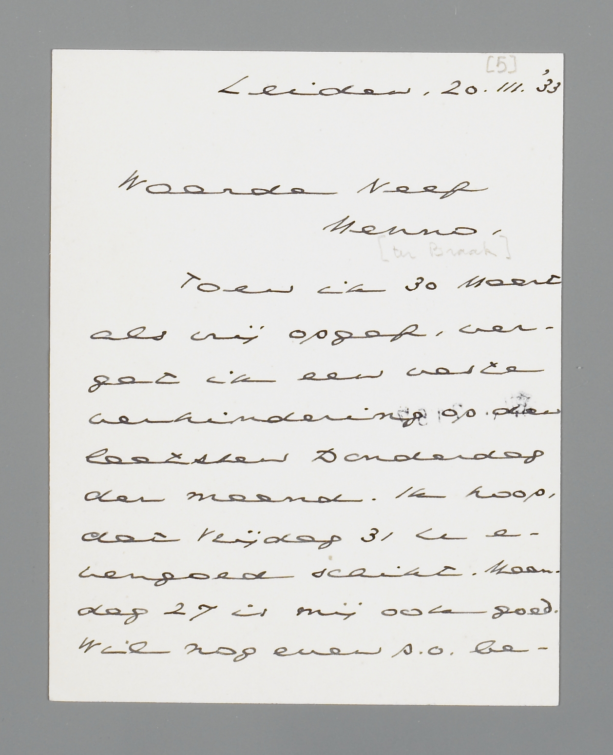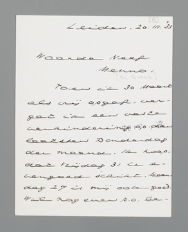 Toen ik 30 Maart als vrij opgaf, vergat ik een vaste verhindering op den laatsten Donderdag der maand. Ik hoop, dat Vrijdag 31 U evengoed schikt. Maandag 27 is mij ook goed. Wil nog even p.o. bericht zenden, welke van beide avonden ik U mag verwachten.