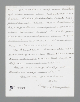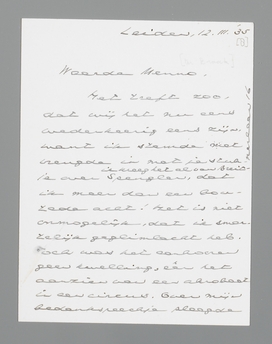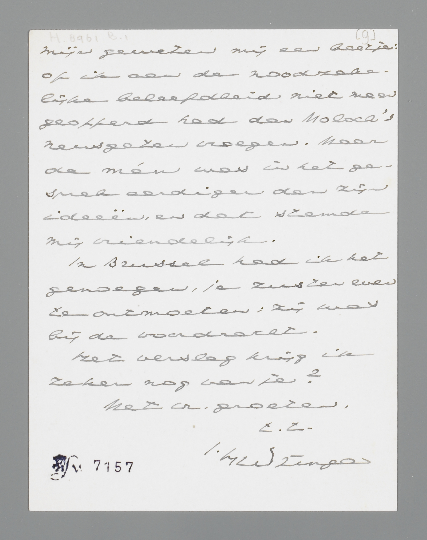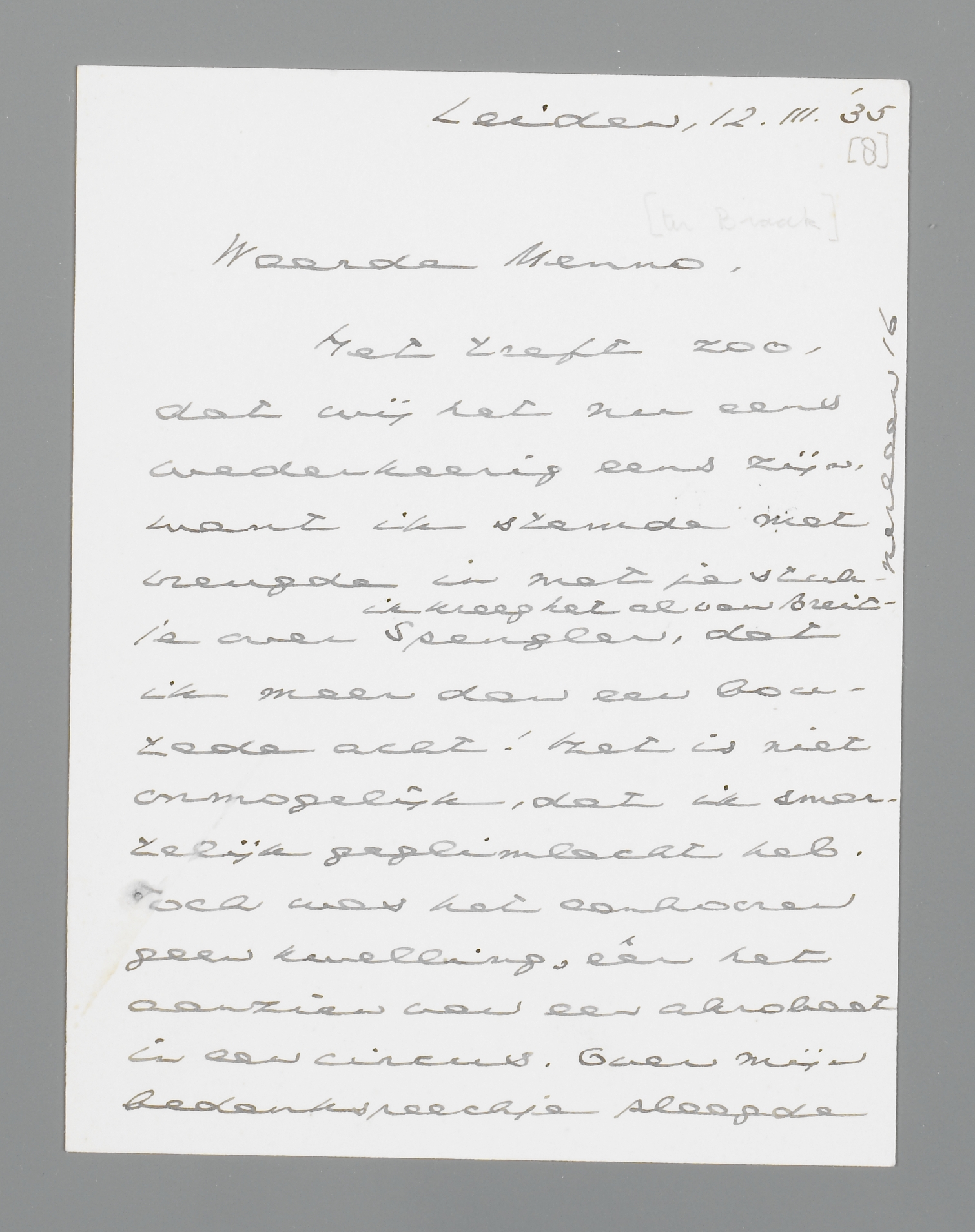 Het treft zoo, dat wij het nu eens wederkeerig eens zijn, want ik stemde met vreugde in met je stukje over Spengler ik kreeg het al van Breitnerlaan 16, dat ik meer dan een boutade acht! Het is niet onmogelijk, dat ik smartelijk geglimlacht heb. Toch was het aanhooren geen kwelling, eêr het aanzien van een akrobaat in een circus. Over mijn bedankspeechje plaagde mijn geweten mij een beetje: of ik aan de noodzakelijke beleefdheid niet meer geofferd had dan Moloch's neusgaten vroegen. Maar de mán was in het gesprek aardiger dan zijn ideeën, en dat stemde mij vriendelijk.