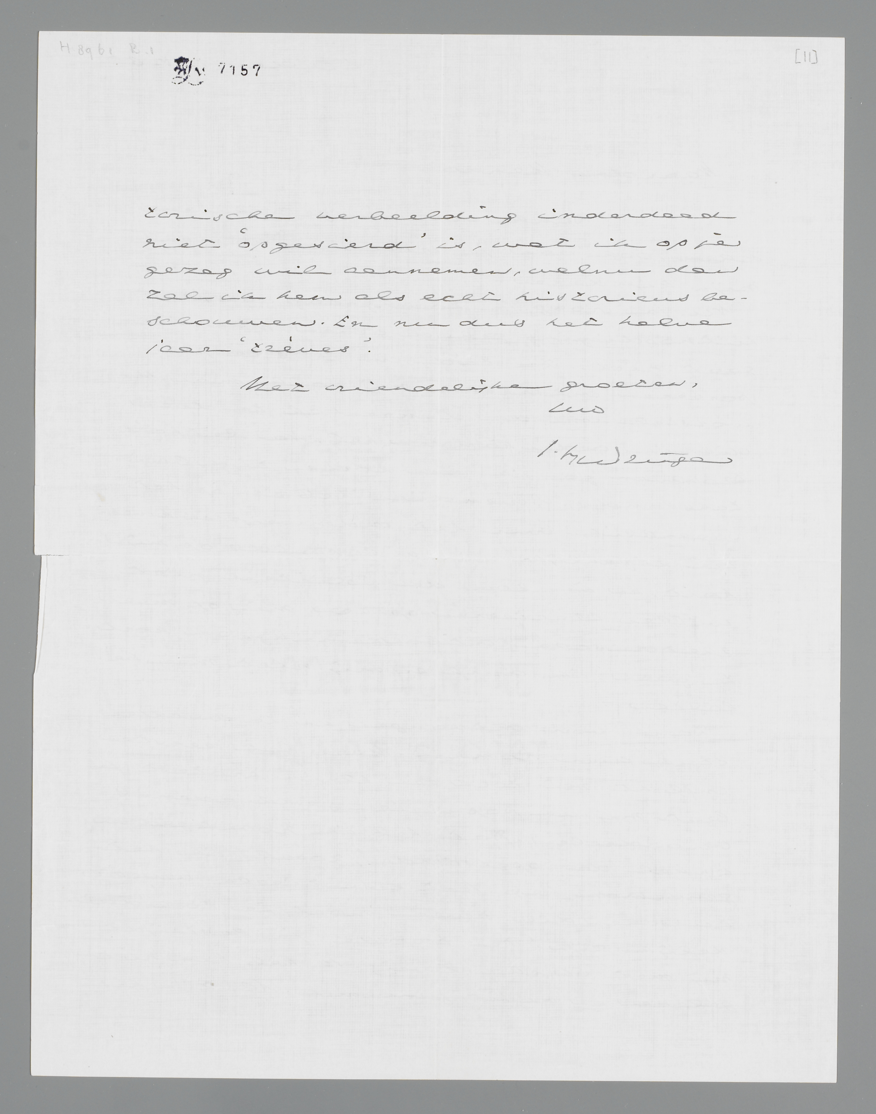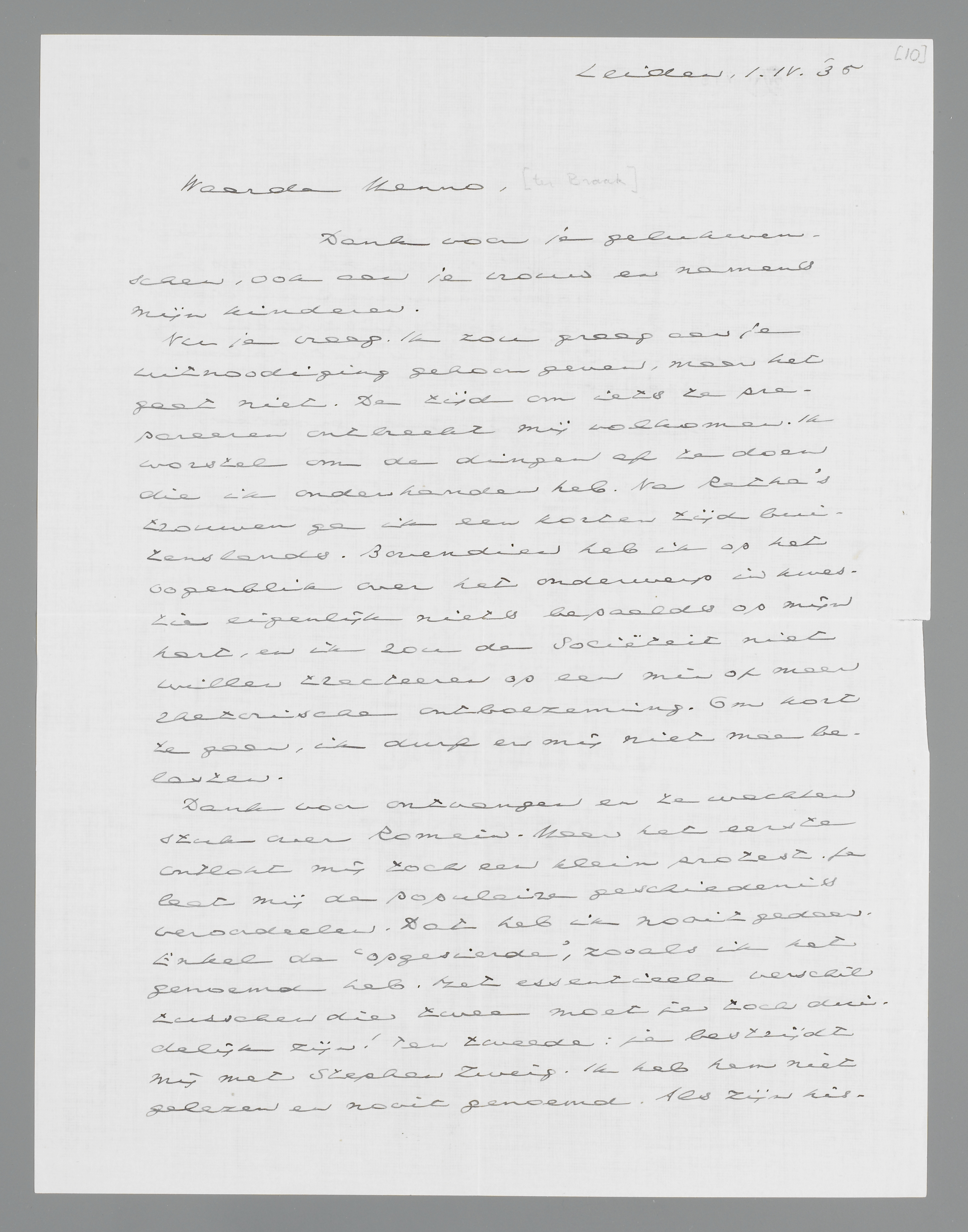 Dank voor ontvangen en te wachten stuk over Romein. Maar het eerste ontlokt mij toch een klein protest. Je laat mij de populaire geschiedenis veroordeelen. Dat heb ik nooit gedaan. Enkel de ‘opgesierde’, zooals ik het genoemd heb. Het essentieele verschil tusschen die twee moet je toch duidelijk zijn! Ten tweede: je bestrijdt mij met Stephan Zweig. Ik heb hem niet gelezen en nooit genoemd. Als zijn historische verbeelding inderdaad niet ‘opgesierd’ is, wat ik op je gezag wil aannemen, welnu dan zal ik hem als echt historicus beschouwen. En nu dus het halve jaar ‘trèves’.