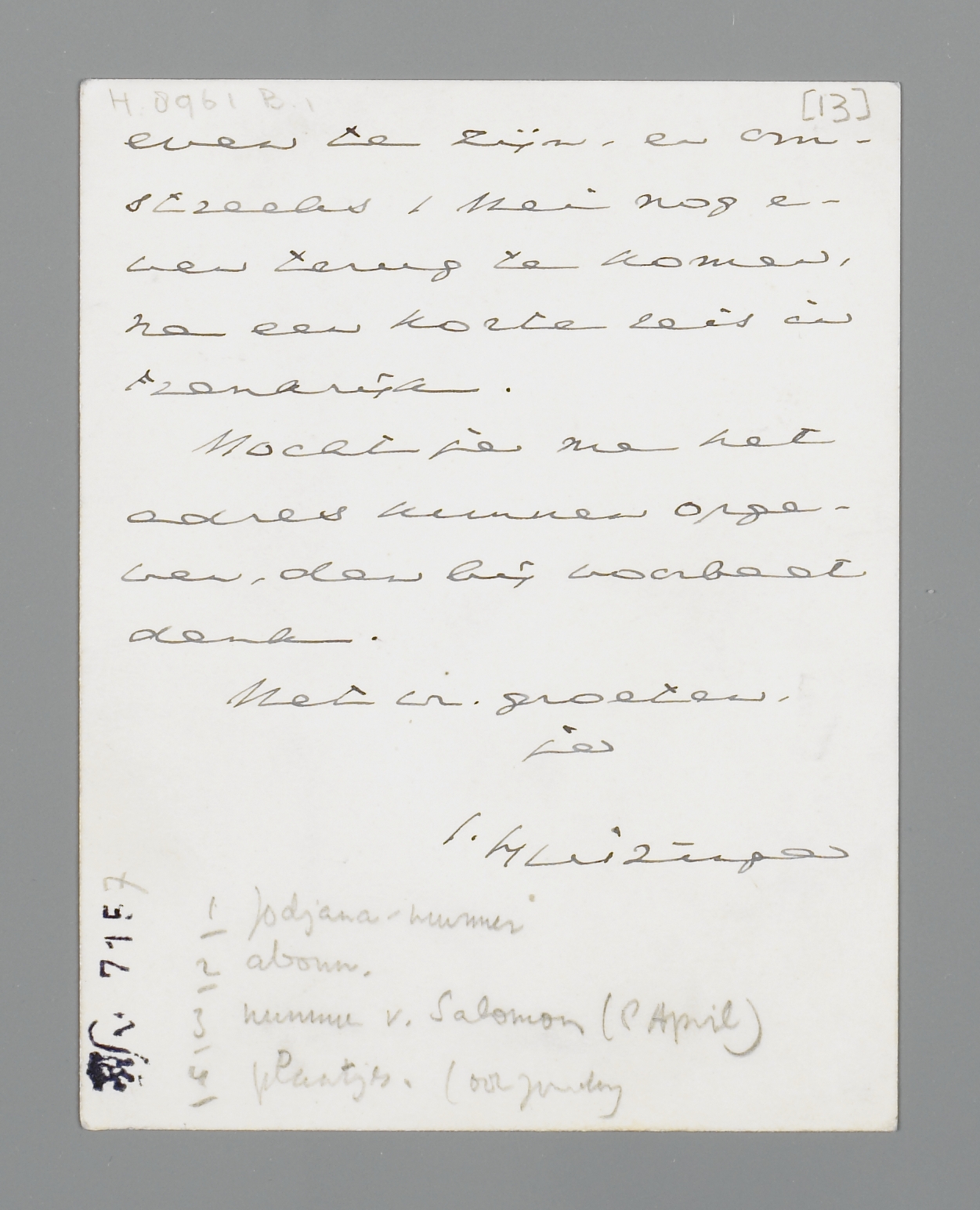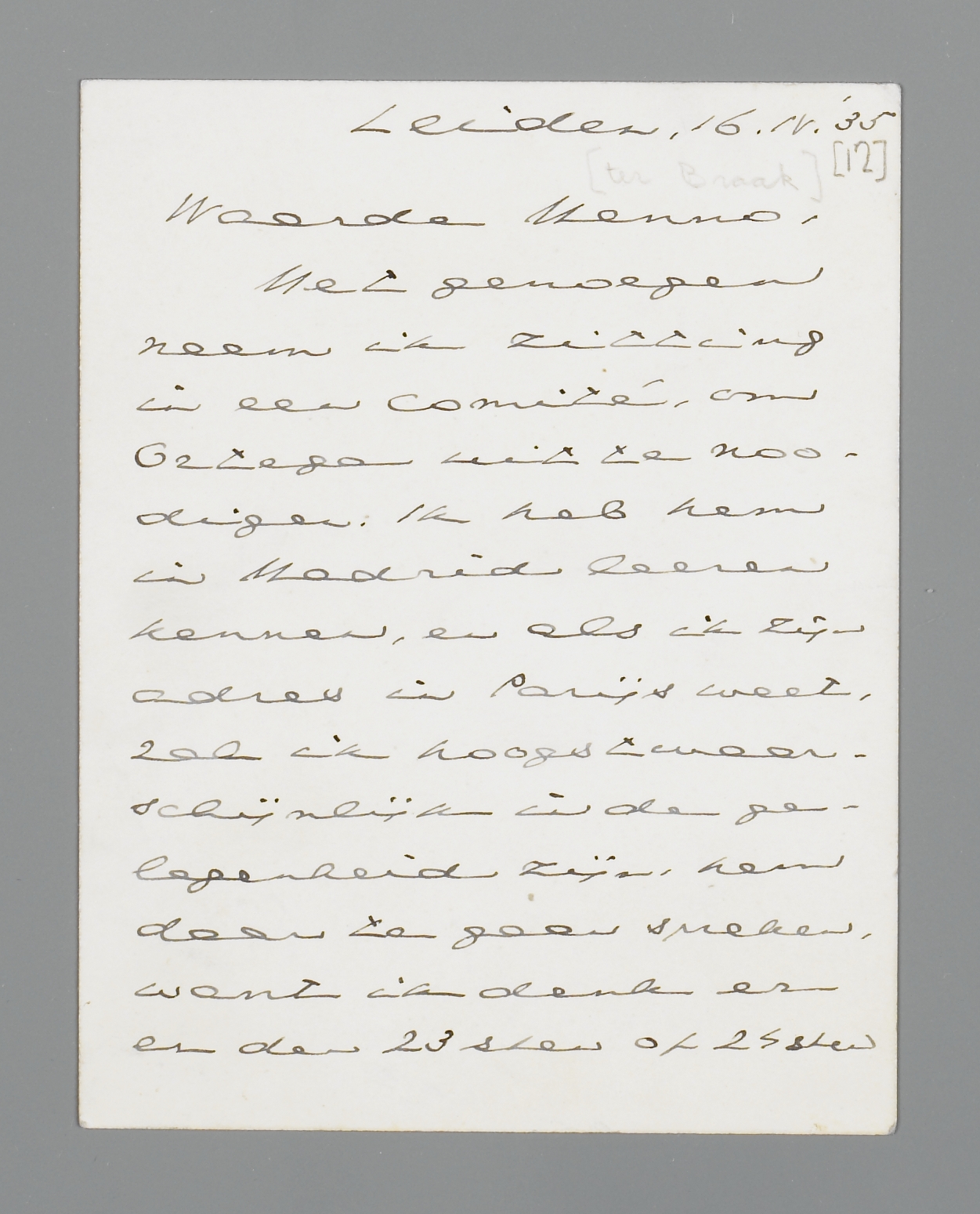 Met genoegen neem ik zitting in een comité, om Ortega uit te noodigen. Ik heb hem in Madrid leeren kennen, en als ik zijn adres in Parijs weet, zal ik hoogstwaarschijnlijk in de gelegenheid zijn, hem daar te gaan spreken, want ik denk er den 23sten of 24sten even te zijn, en omstreeks 1 Mei nog even terug te komen, na een korte reis in Frankrijk.