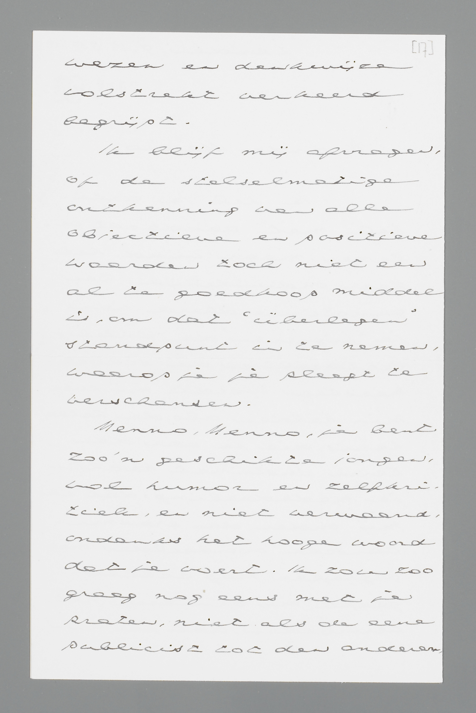 Ik blijf mij afvragen, of de stelselmatige ontkenning van alle objectieve en positieve waarden toch niet een al te goedkoop middel is, om dat ‘überlegen’ standpunt in te nemen, waarop je je pleegt te verschansen.