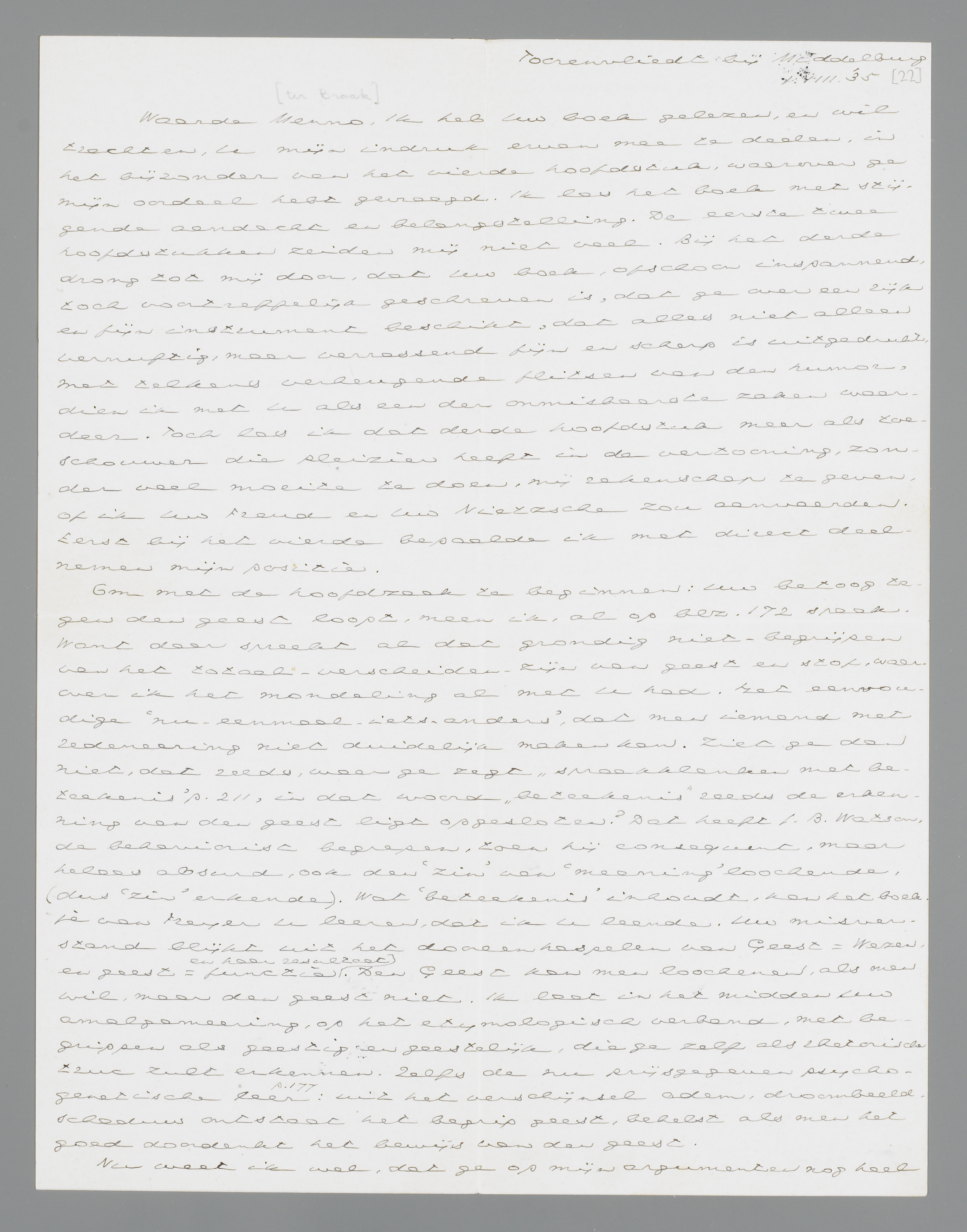 Om met de hoofdzaak te beginnen: Uw betoog tegen den geest loopt, meen ik, al op blz. 172 spaak. Want daar spreekt al dat grondig niet-begrijpen van het totaal-verscheiden-zijn van geest en stof, waarover ik het mondeling al met U had. Het eenvoudige ‘nu-eenmaal-iets-anders’, dat men iemand met redeneering niet duidelijk maken kan. Ziet ge dan niet, dat reeds, waar ge zegt ‘spraakklanken met beteekenis’ p. 211, in dat woord ‘beteekenis’ reeds de erkenning van den geest ligt opgesloten? Dat heeft J.B. Watson, de behaviorist begrepen, toen hij consequent, maar helaas absurd, ook den ‘zin’ van ‘meaning’ loochende, (dus ‘zin’ erkende). Wat ‘beteekenis’ inhoudt, kan het boekje van Freyer U leeren, dat ik U leende. Uw misverstand blijkt uit het dooreenhaspelen van Geest = Wezen, en geest = functie en haar resultaat. Den Geest kan men loochenen, als men wil, maar den geest niet. Ik laat in het midden Uw amalgameering, op het etymologisch verband, met begrippen als geestig en geestelijk, die ge zelf als rhetorische truc zult erkennen. Zelfs de nu prijsgegeven psychogenetische leer p. 177: uit het verschijnsel adem, droombeeld, schaduw ontstaat het begrip geest, behelst als men het goed doordenkt het bewijs van den geest.
