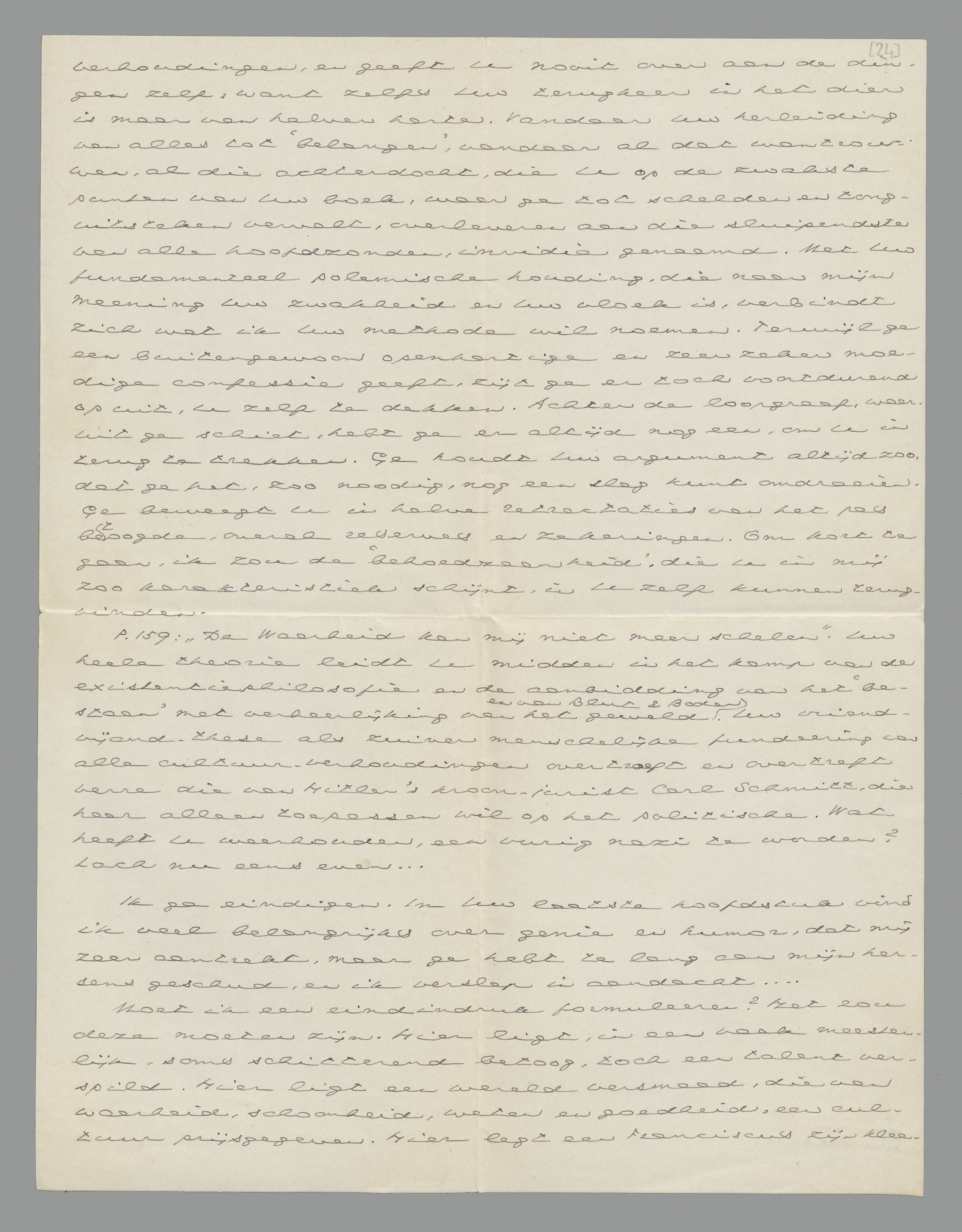 P. 159: ‘De Waarheid kan mij niet meer schelen’. Uw heele theorie leidt U midden in het kamp van de existentiephilosofie en de aanbidding van het ‘bestaan’ met verheerlijking van het geweld en van Blut & Boden. Uw vriend-vijand-these als zuiver menschelijke fundeering van alle cultuur-verhoudingen overtroeft en overtreft verre die van Hitler's kroon-jurist Carl Schmitt, die haar alleen toepassen wil op het politische. Wat heeft U weerhouden, een vurig nazi te worden? Lach nu eens even...