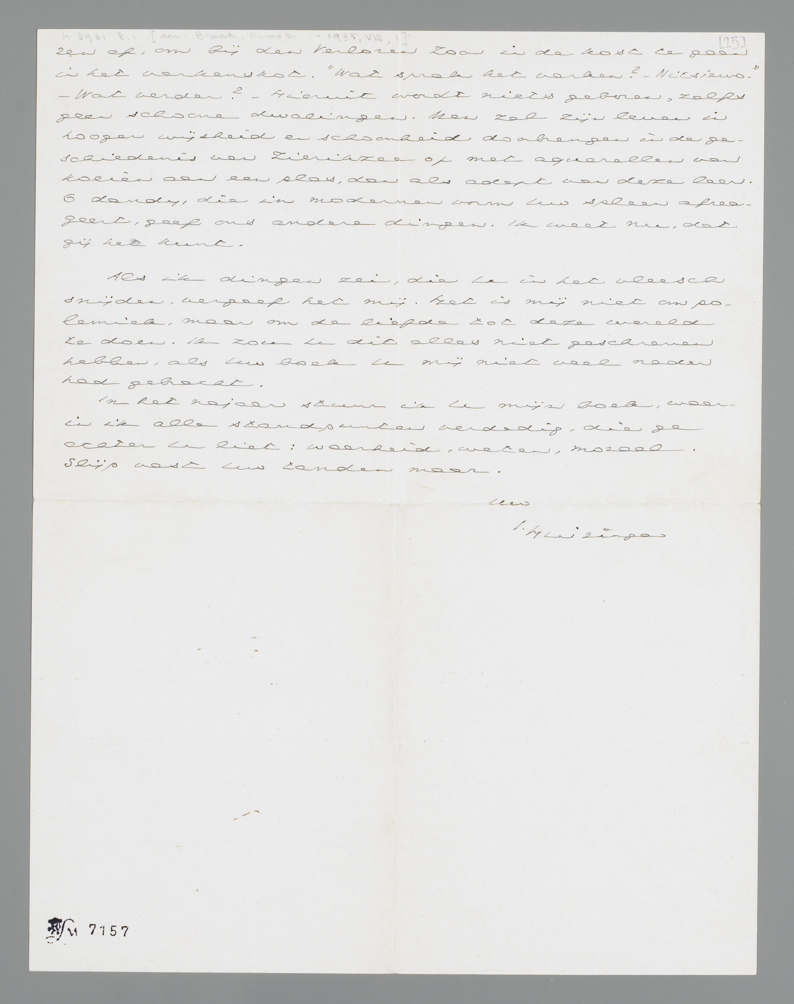 Ik heb Uw boek gelezen, en wil trachten, U mijn indruk ervan mee te deelen, in het bijzonder van het vierde hoofdstuk, waarover ge mijn oordeel hebt gevraagd. Ik las het boek met stijgende aandacht en belangstelling. De eerste twee hoofdstukken zeiden mij niet veel. Bij het derde drong tot mij door, dat Uw boek, ofschoon inspannend, toch voortreffelijk geschreven is, dat ge over een rijk en fijn instrument beschikt, dat alles niet alleen vernuftig, maar verrassend fijn en scherp is uitgedrukt, met telkens verheugende flitsen van den humor, dien ik met U als een der onmisbaarste zaken waardeer. Toch las ik dat derde hoofdstuk meer als toeschouwer die pleizier heeft in de vertooning, zonder veel moeite te doen, mij rekenschap te geven, of ik Uw Freud en Uw Nietzsche zou aanvaarden. Eerst bij het vierde bepaalde ik met direct deelnemen mijn positie.