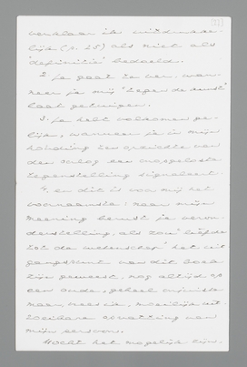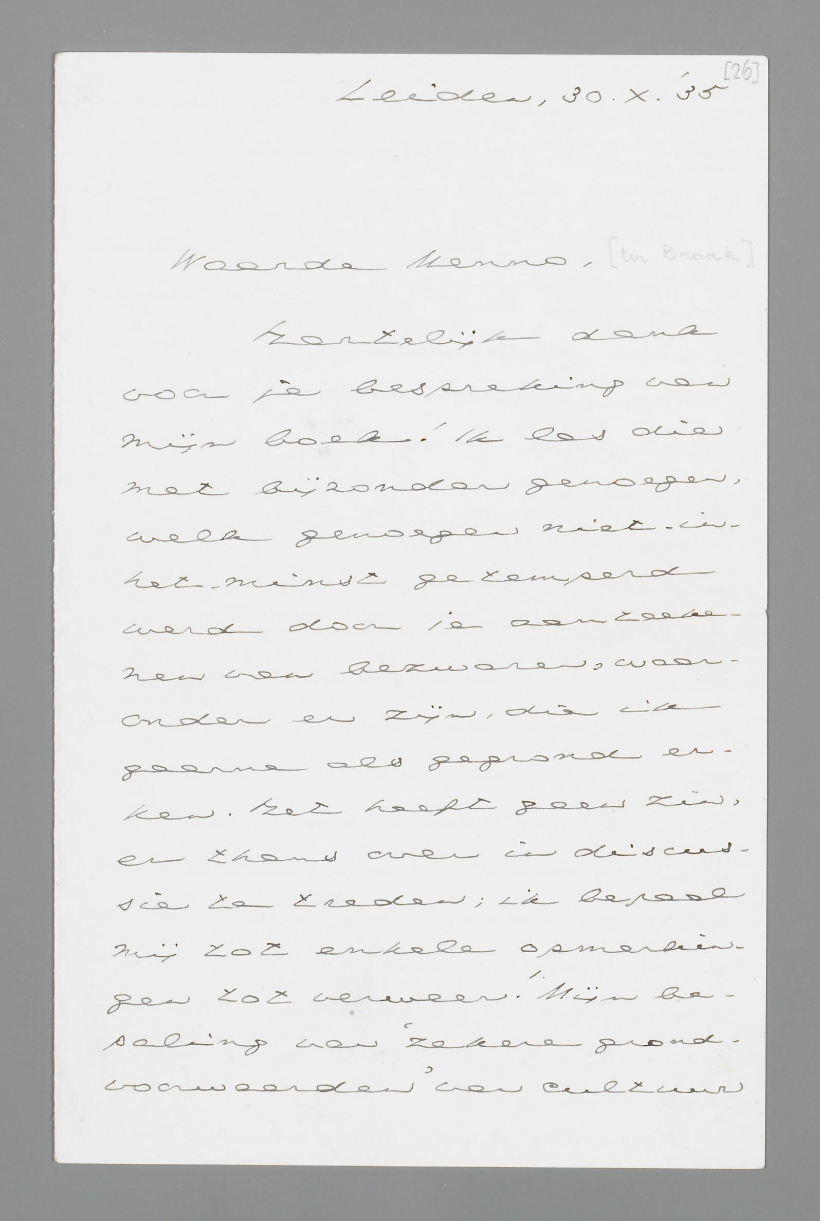 Hartelijk dank voor je bespreking van mijn boek! Ik las die met bijzonder genoegen, welk genoegen niet-in-het-minst getemperd werd door je aanteekenen van bezwaren, waaronder er zijn, die ik gaarne als gegrond erken. Het heeft geen zin, er thans over in discussie te treden; ik bepaal mij tot enkele opmerkingen tot verweer.