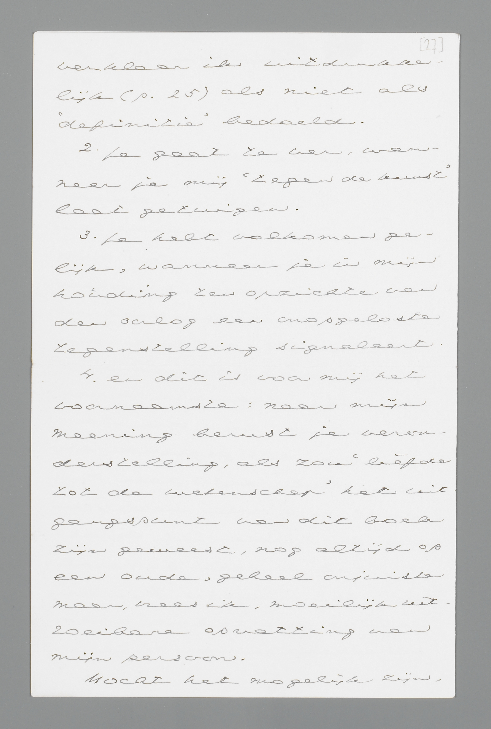 | 4. | en dit is voor mij het voornaamste: naar mijn meening berust je veronderstelling, als zou ‘liefde tot de wetenschap’ het uitgangspunt van dit boek zijn geweest, nog altijd op een oude, geheel onjuiste maar, vrees ik, moeilijk uitroeibare opvatting van mijn persoon. |