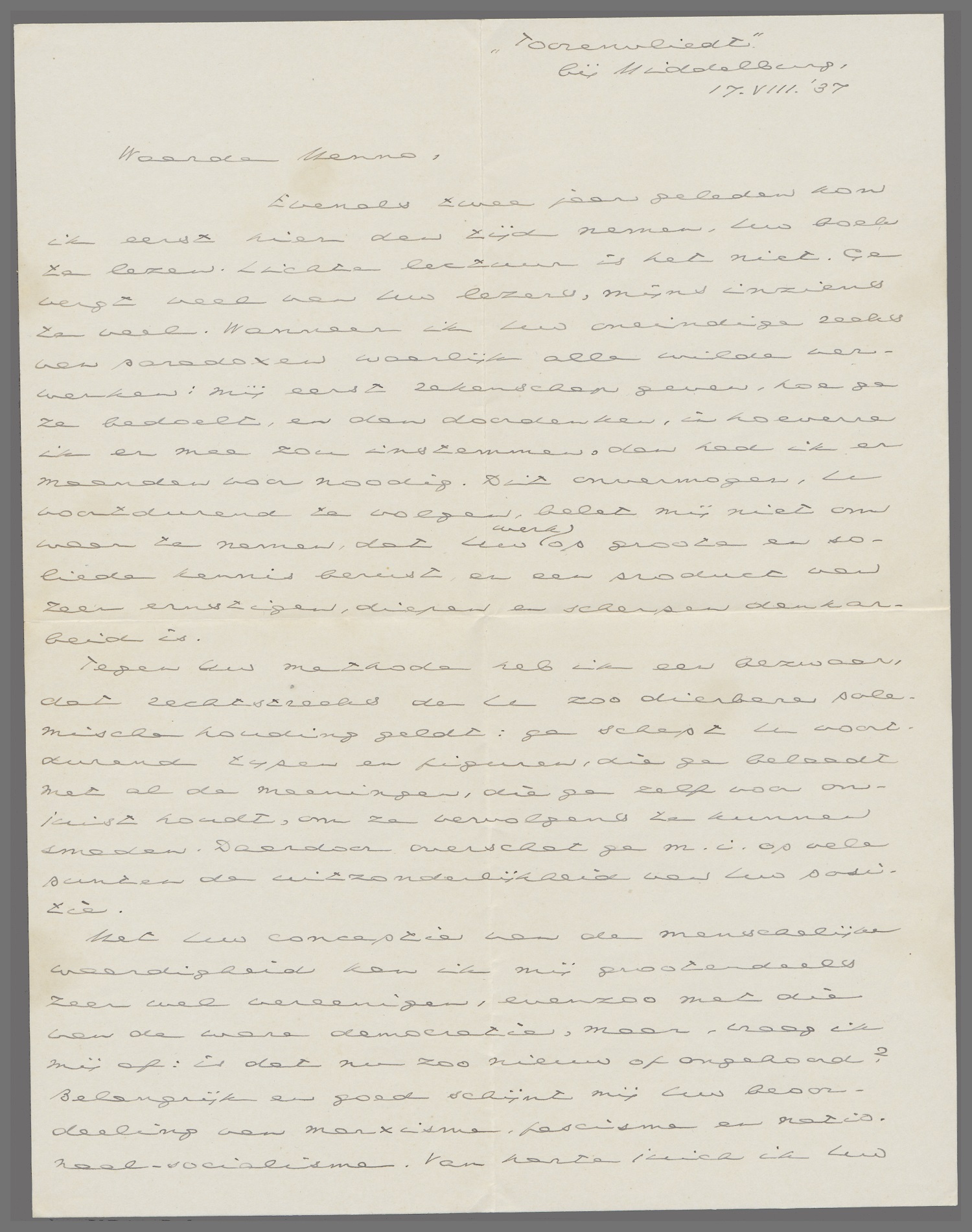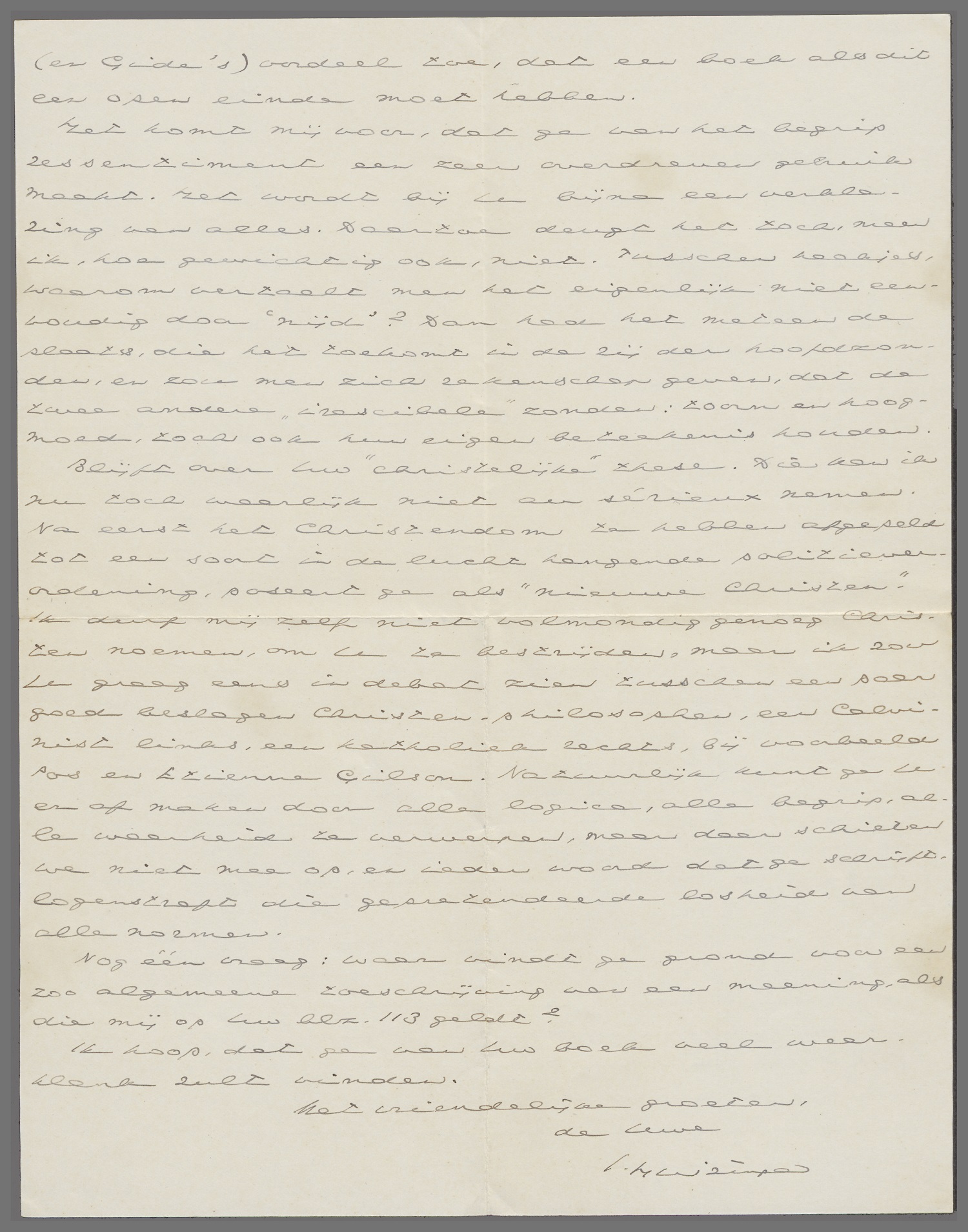Met uw conceptie van waardigheid kan ik mij grootendeels zeer wel vereenigen, evenzoo met die van de ware democratie, maar, vraag ik mij af: is dat nu zoo nieuw of ongehoord? Belangrijk en goed schijnt mij uw beoordeeling van marxisme, fascisme en nationaal-socialisme. Van harte juich ik uw (en Gide's) oordeel toe, dat een boek als een open einde moet hebben.