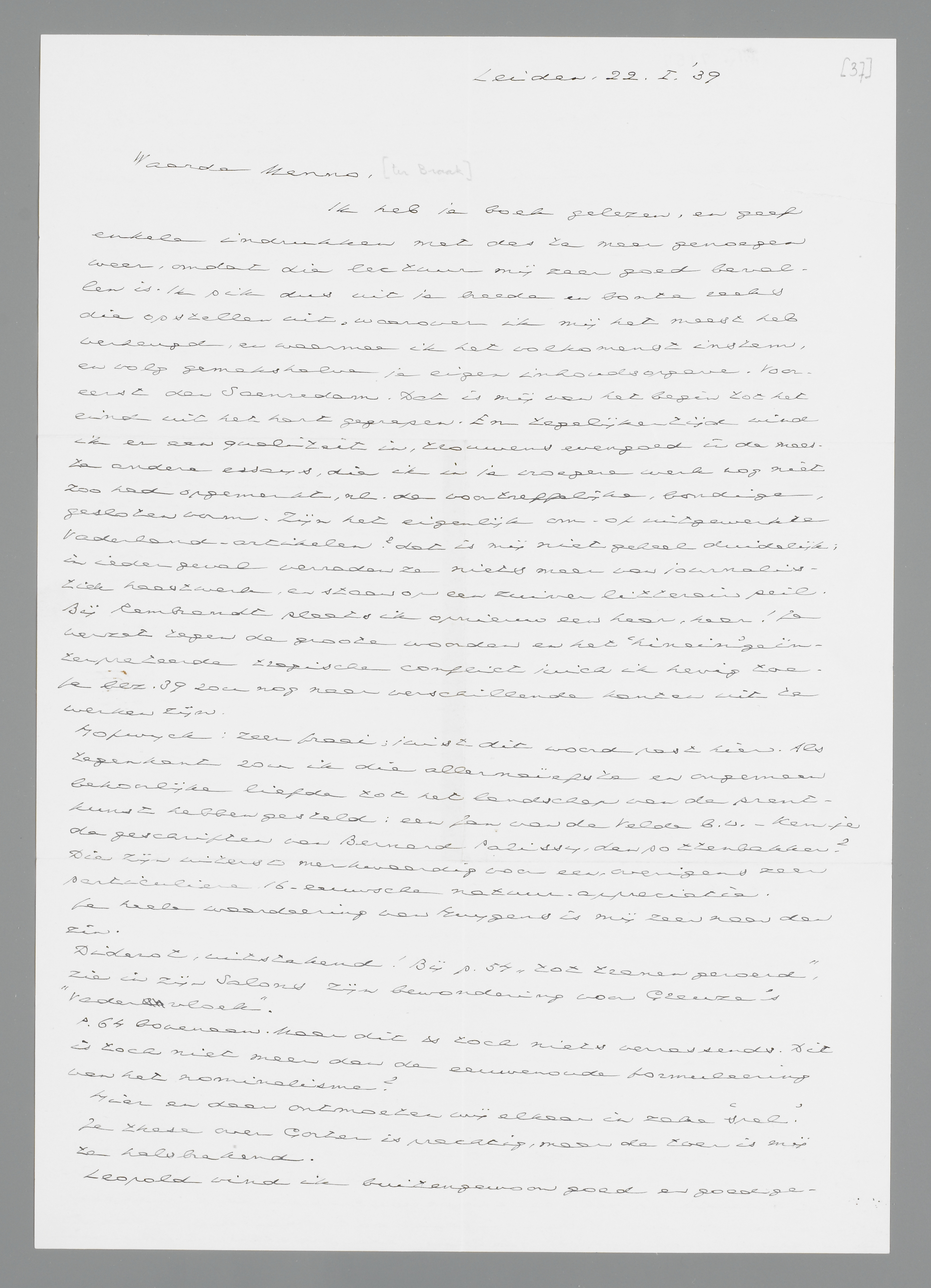 Ik heb je boek gelezen, en geef enkele indrukken met des te meer genoegen weer, omdat die lectuur mij zeer goed bevallen is. Ik pik dus uit je breede en bonte reeks die opstellen uit, waarover ik mij het meest heb verheugd, en waarmee ik het volkomenst instem, en volg gemakshalve je eigen inhoudsopgave. Vooreerst dan Saenredam. Dat is mij van het begin tot het eind uit het hart gegrepen. En tegelijkertijd vind ik er een qualiteit in, trouwens evengoed in de meeste andere essays, die ik in je vroegere werk nog niet zoo had opgemerkt, nl. de voortreffelijke, bondige, gesloten vorm. Zijn het eigenlijk om- of uitgewerkte Vaderland-artikelen? dat is mij niet geheel duide lijk; in ieder geval verraden ze niets meer van journalistiek haastwerk, en staan op een zuiver litterair peil. Bij Rembrandt plaats ik opnieuw een hear, hear! Je verzet tegen de groote woorden en het ‘hinein’ geïnterpreteerde tragische conflict juich ik hevig toe. Je blz. 39 zou nog naar verschillende kanten uit te werken zijn.