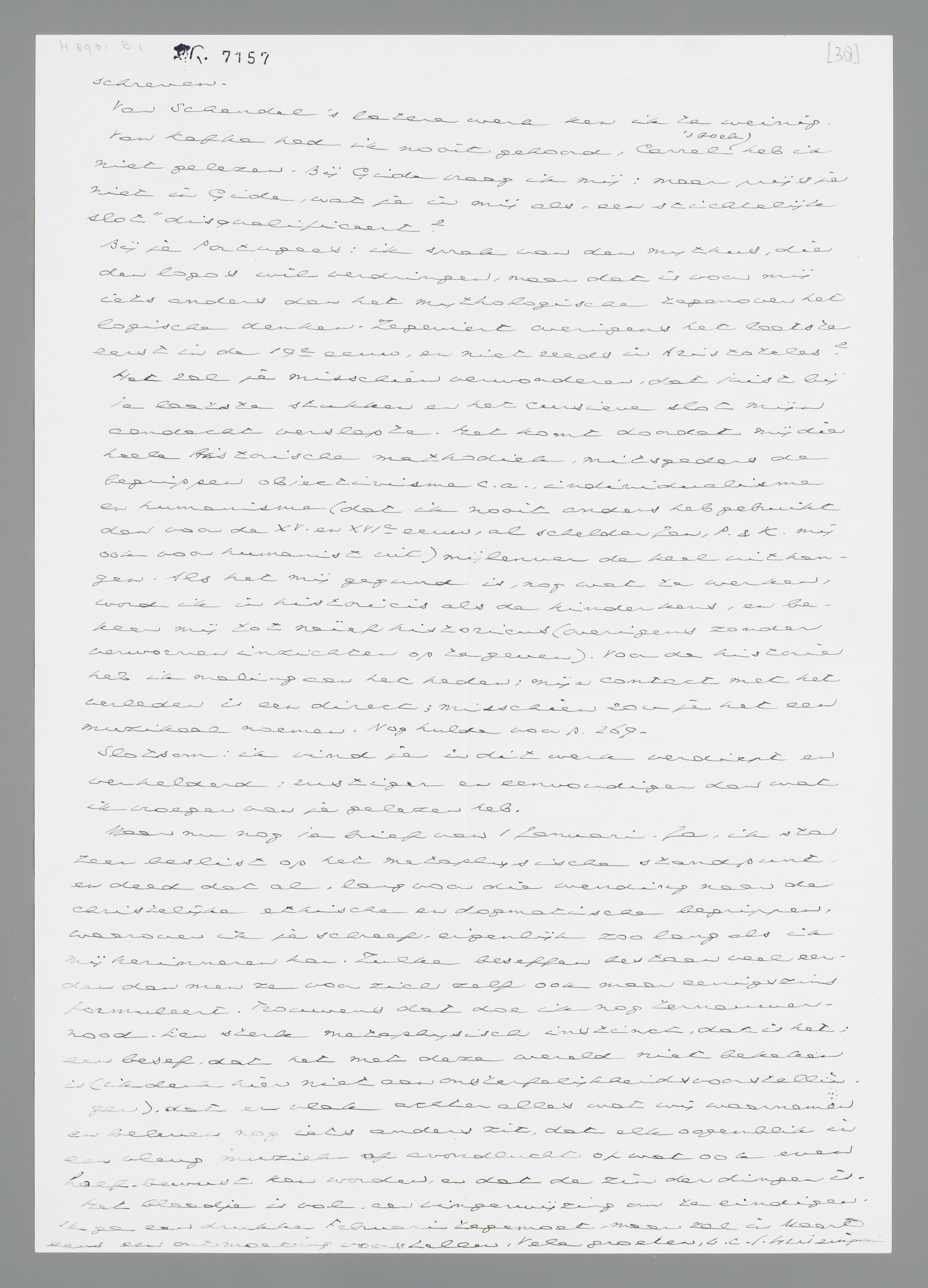 Het zal je misschien verwonderen, dat juist bij je laatste stukken en het cursieve slot mijn aandacht verslapte. Het komt doordat mij die heele historische methodiek, mitsgaders de begrippen objectivisme c.a., individualisme en humanisme (dat ik nooit anders heb gebruikt dan voor de XV. en XVIe eeuw, al schelden Jan, P. en K. mij ook voor humanist uit) mijlenver de keel uithangen. Als het mij gegund is, nog wat te werken, word ik in historicis als de kinderkens, en bekeer mij tot naïef historicus (overigens zonder verworven inzichten op te geven). Voor de historie heb ik maling aan het heden; mijn contact met het verleden is een direct; misschien zou je het een muzikaal noemen. Nog hulde voor p. 269
