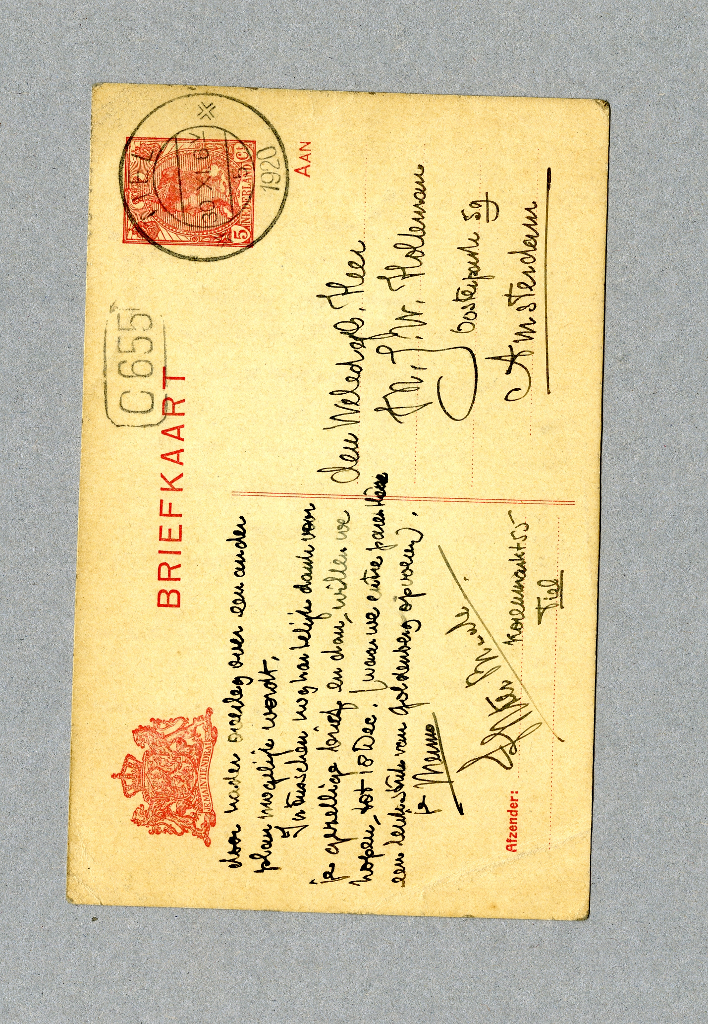 We waren allen, ik wel het meest, bovenmate verheugd, je zoo kranig uit de doodkist der vergetelheid te zien opduiken en te hooren, dat je het, ondanks gruwelijke zelfverwijten in après-portefeuille stemming, nog steeds goed maakt. Je idee om over te komen is schitterend; kom dan 18 Dec. a.s.; dan is de groote uitvoering, waarvoor je nog een invitatie zult ontvangen (quaestor Caron heeft n.l. de vrijheid genomen je als oudlid aan te merken); je ziet dan alle oude kennissen en vriendinnen (!) meteen in leuke stemming weer (uitgezonderd mevr. Prins, die zich nog voorbereidt op haar door ons zoo geniaal ontdekte jongste spruit); en den volgenden dag ga je eenige dagen mee naar Eibergen, waar we in de solitude naar hartelust kunnen dazen en zwammen, hetgeen zeer noodig is. Denk eens over dit riante voorstel na; is het niet naar je zin, dien dan per briefkaart een motie in waardoor nader overleg over een ander plan mogelijk wordt.