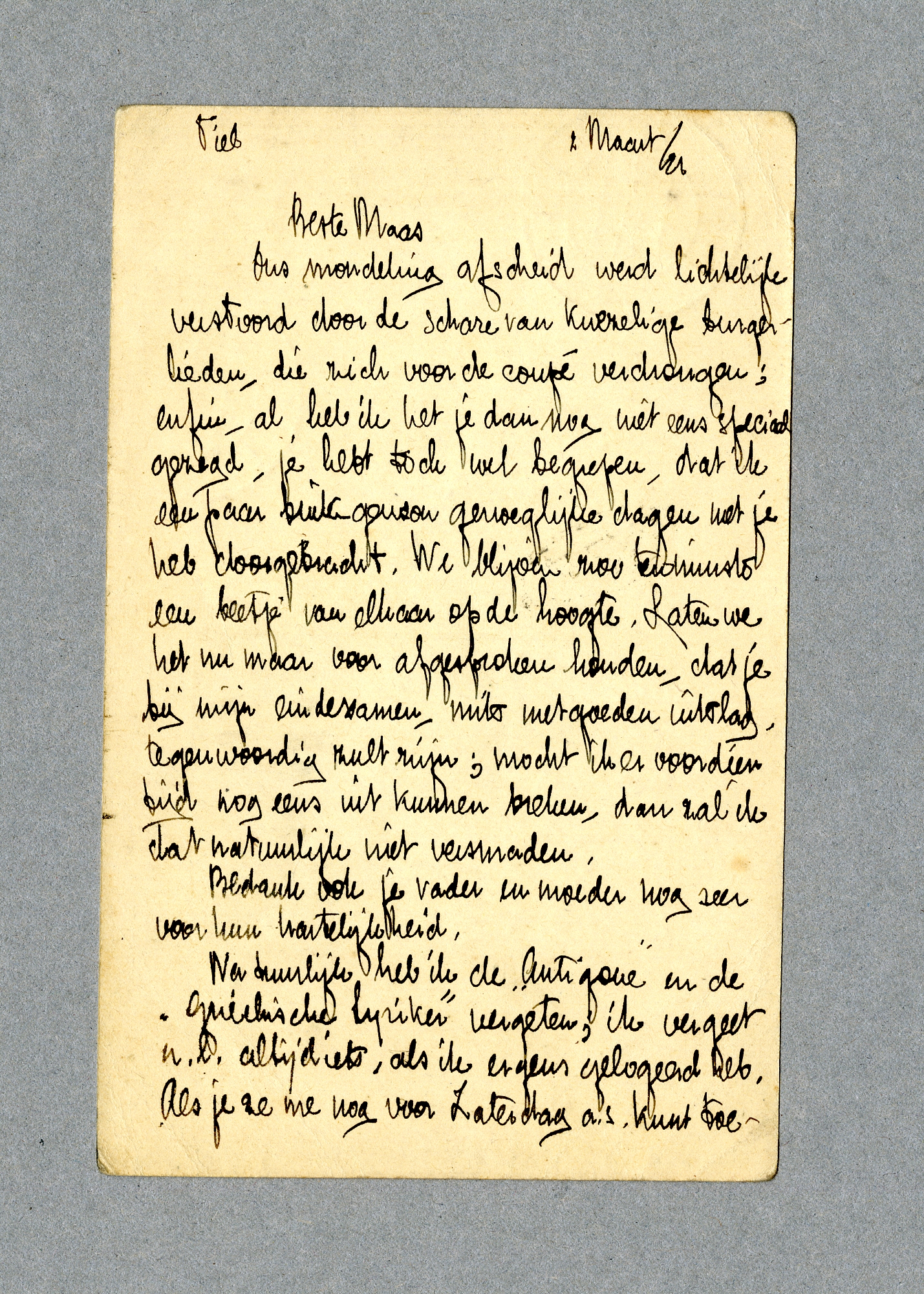 Natuurlijk heb ik de ‘Antigone’ en de ‘Griechische Lyriker’ vergeten; ik vergeet n.l. altijd iets, als ik ergens gelogeerd heb. Als je ze me nog voor Zaterdag a.s. kunt toesturen, zou dat wel gemakkelijk zijn; ik dank je nog zeer voor die boekjes. Ik zal je eerstdaags ‘het Spook van V.’ en de ‘Midsummernightsdream’ toesturen.