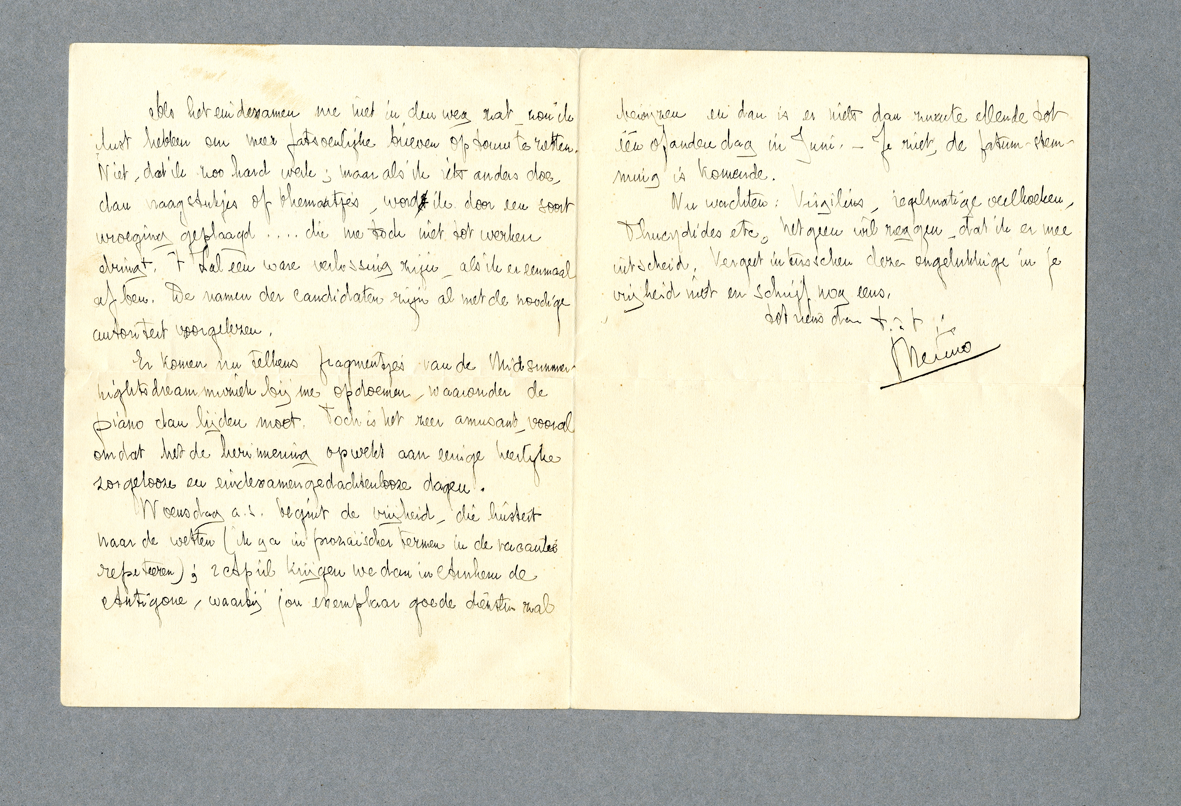Het Spook heb ik met siddering en spanning gelezen. 't Is waarachtig een geniaal stukje om de gebeurtenissen zoo door elkaar te draaien, dat je in 't midden van het boek nog geen flauwe notie van de afloop hebt. Niettemin heb ik me voorgenomen, om voor het eindexamen slechts talen te lezen, want het Spook heeft me een heele middag van mijn werk afgehouden. Ik had het je al eerder terug gestuurd, als mevr. Viëtor het niet te leen had gevraagd. (Irrealis). Fraai ziet het er niet meer uit, maar ik geloof niet, dat ik er veel aan bedorven heb, daar het in Amsterdam toch ± in dezelfde toestand verkeerde.