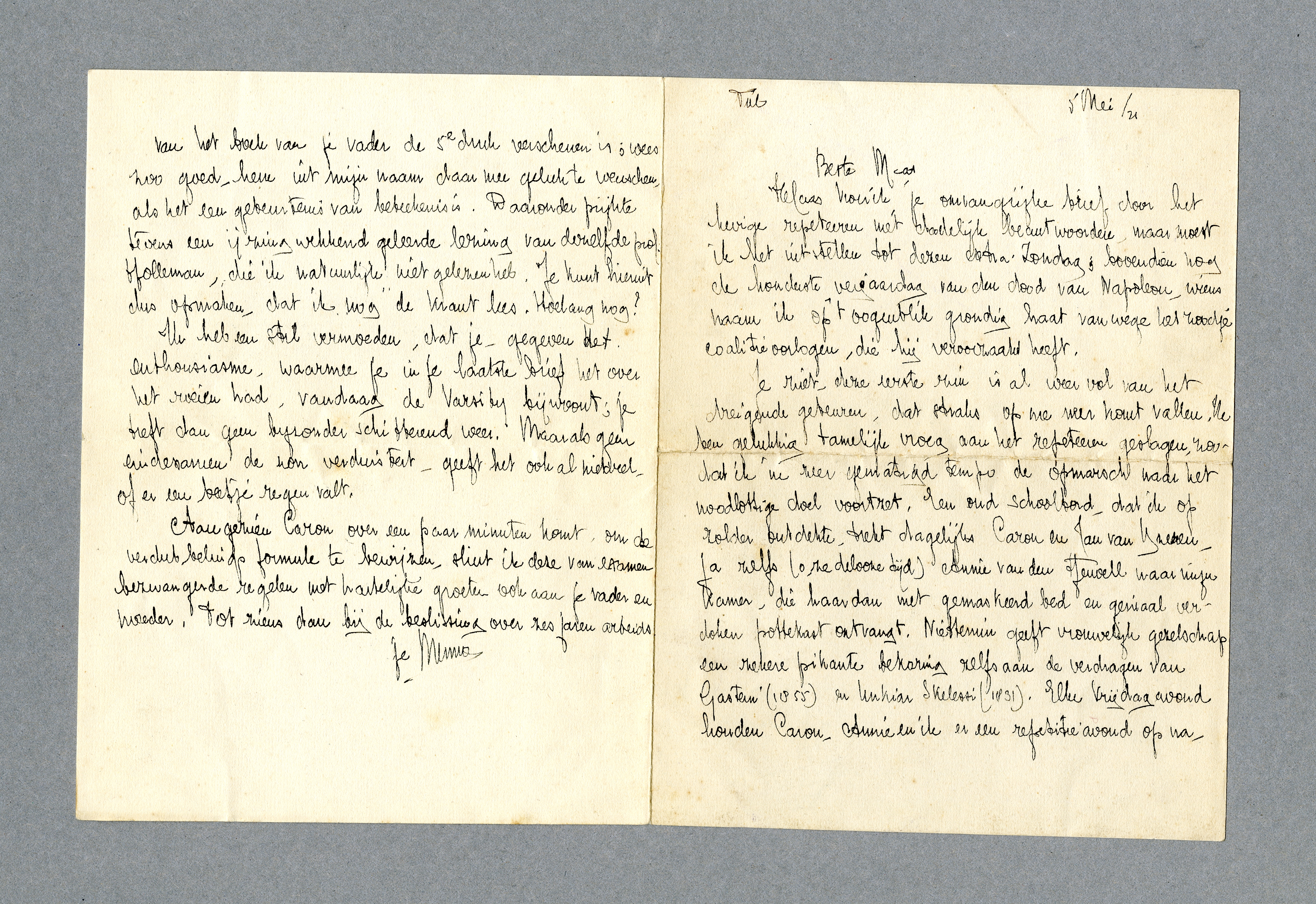 Helaas kon ik je omvangrijke brief door het hevige repeteeren niet dadelijk beantwoorden, maar moest ik het uitstellen tot dezen extra-Zondag; bovendien nog de honderdste verjaardag van den dood van Napoleon, wiens naam ik op 't oogenblik grondig haat vanwege het zoodje coalitieoorlogen, die hij veroorzaakt heeft.