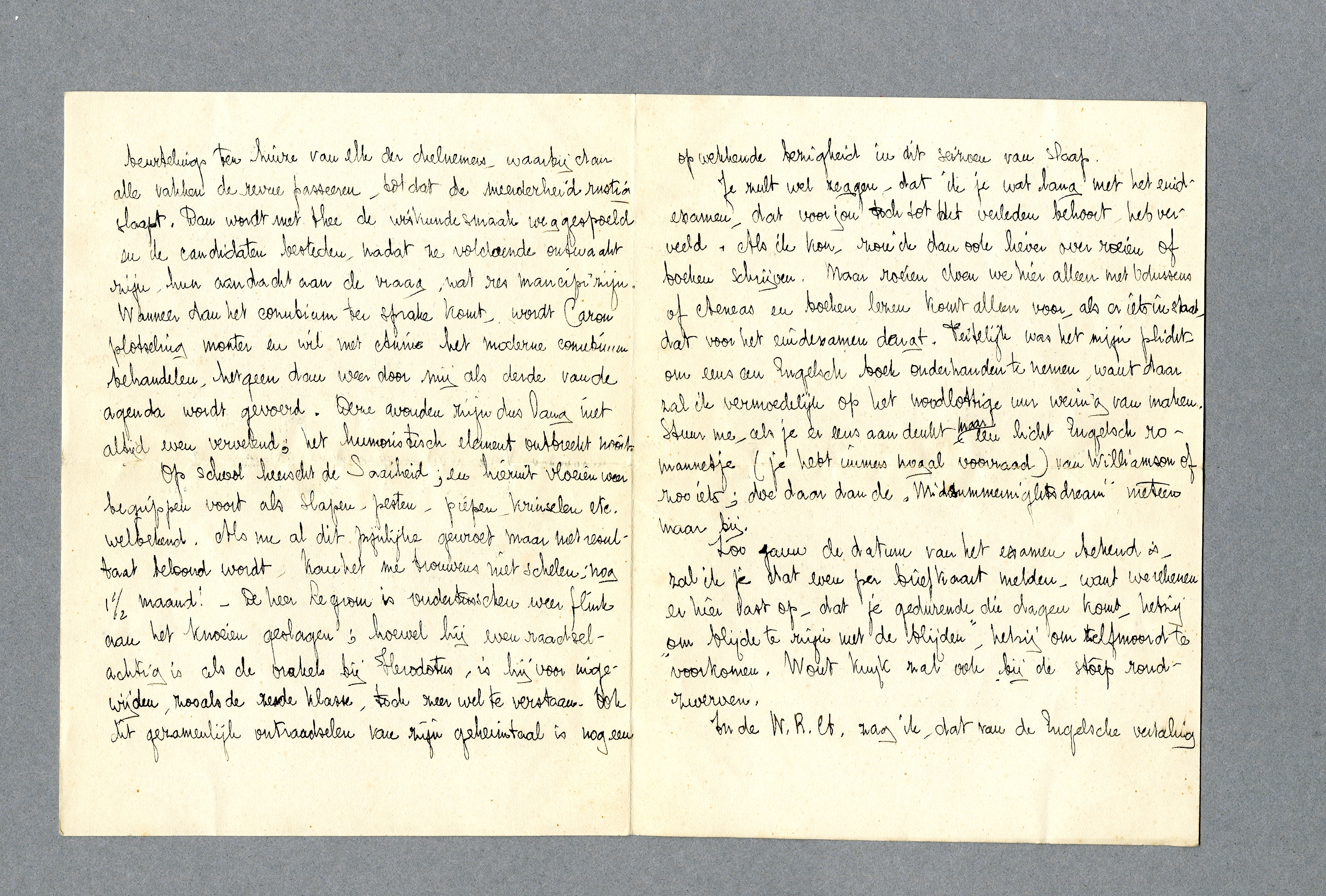 Je ziet, deze eerste zin is al weer vol van het dreigende gebeuren, dat straks op me neer komt vallen. Ik ben gelukkig tamelijk vroeg aan het repeteeren geslagen, zoodat ik in zeer gematigd tempo de opmarsch naar het noodlottige doel voortzet. Een oud schoolbord, dat ik op zolder ontdekte, trekt dagelijks Caron en Jan van Yzeren, ja zelfs (o, zedelooze tijd) Annie van den Heuvell naar mijn kamer, die haar dan met gemaskeerd bed en geniaal verdoken pottekast ontvangt. Niettemin geeft vrouwelijk gezelschap een zekere pikante bekoring zelfs aan de verdragen van Gastein (1855) en Unkiar Skelessi (1831). Elke Vrijdagavond houden Caron, Annie en ik er een repetitieavond op na, beurtelings ten huize van elk der deelnemers, waarbij dan alle vakken de revue passeeren, totdat de meerderheid rustig slaapt. Dan wordt met thee de wiskundesmaak weggespoeld en de candidaten besteden, nadat ze voldoende ontwaakt zijn, hun aandacht aan de vraag, wat res mancipi zijn. Wanneer dan het conubium ter sprake komt, wordt Caron plotseling monter en wil met Annie het moderne conubium behandelen, hetgeen dan weer door mij als derde van de agenda wordt gevoerd. Deze avonden zijn dus lang niet altijd even vervelend; het humoristische element ontbreekt nooit.