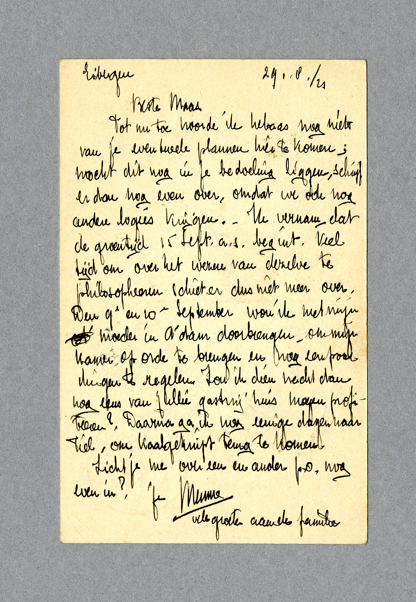 Tot nu toe hoorde ik helaas nog niets van je eventueele plannen hier te komen; mocht dit nog in je bedoeling liggen, schrijf er dan nog even over, omdat we ook nog andere logées krijgen. - Ik vernam, dat de groentijd 15 Sept. a.s. begint. Veel tijd om over het wezen van dezelve te philosopheeren schiet er dus niet meer over. Den 9e en 10e September wou ik met mijn moeder in A'dam doorbrengen, om mijn kamer op orde te brengen en nog een paar dingen te regelen. Zou ik dien nacht dan nog eens van jullie gastvrij huis mogen profiteeren? Daarna ga ik nog eenige dagen naar Tiel, om kaalgeknipt terug te komen.