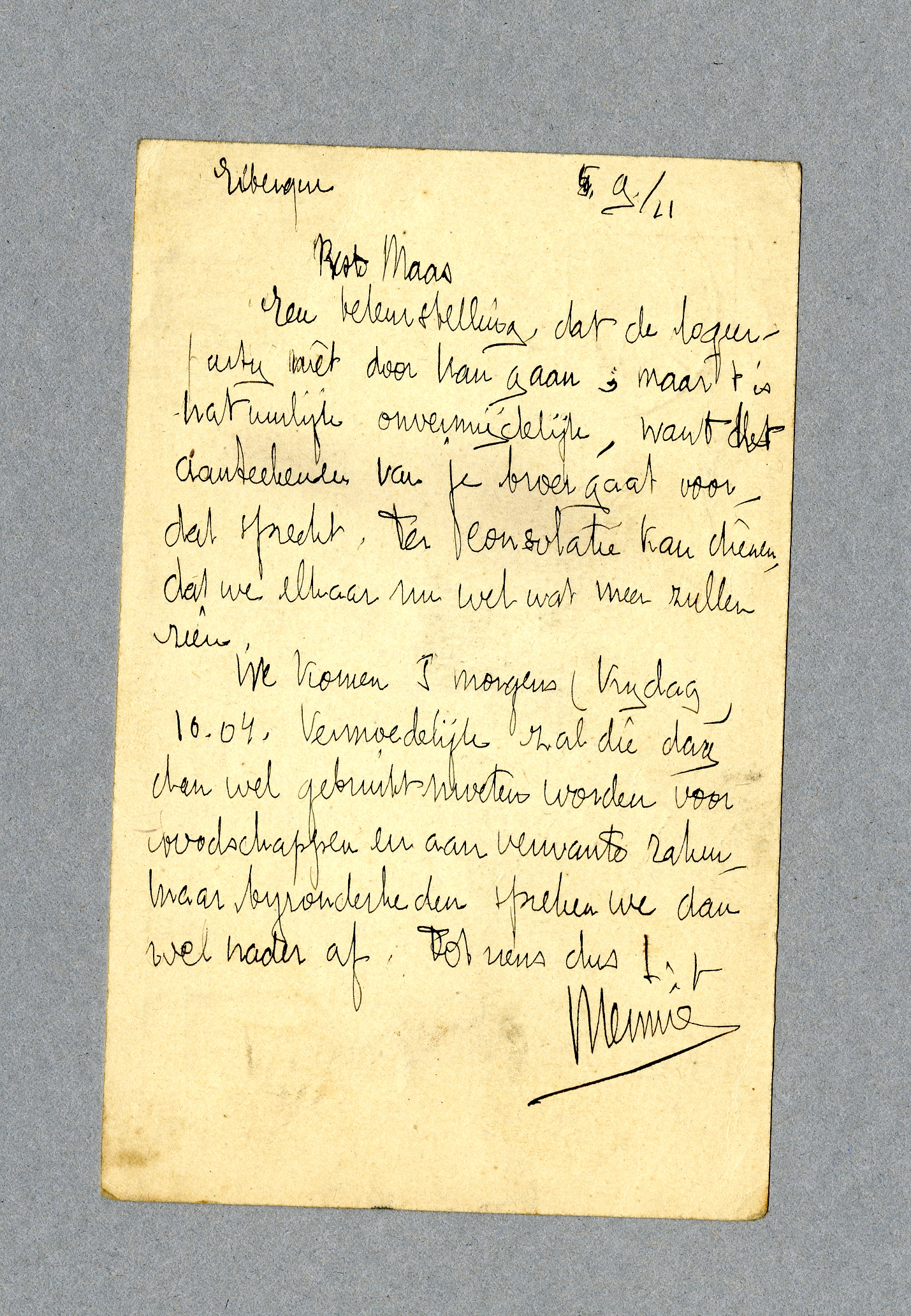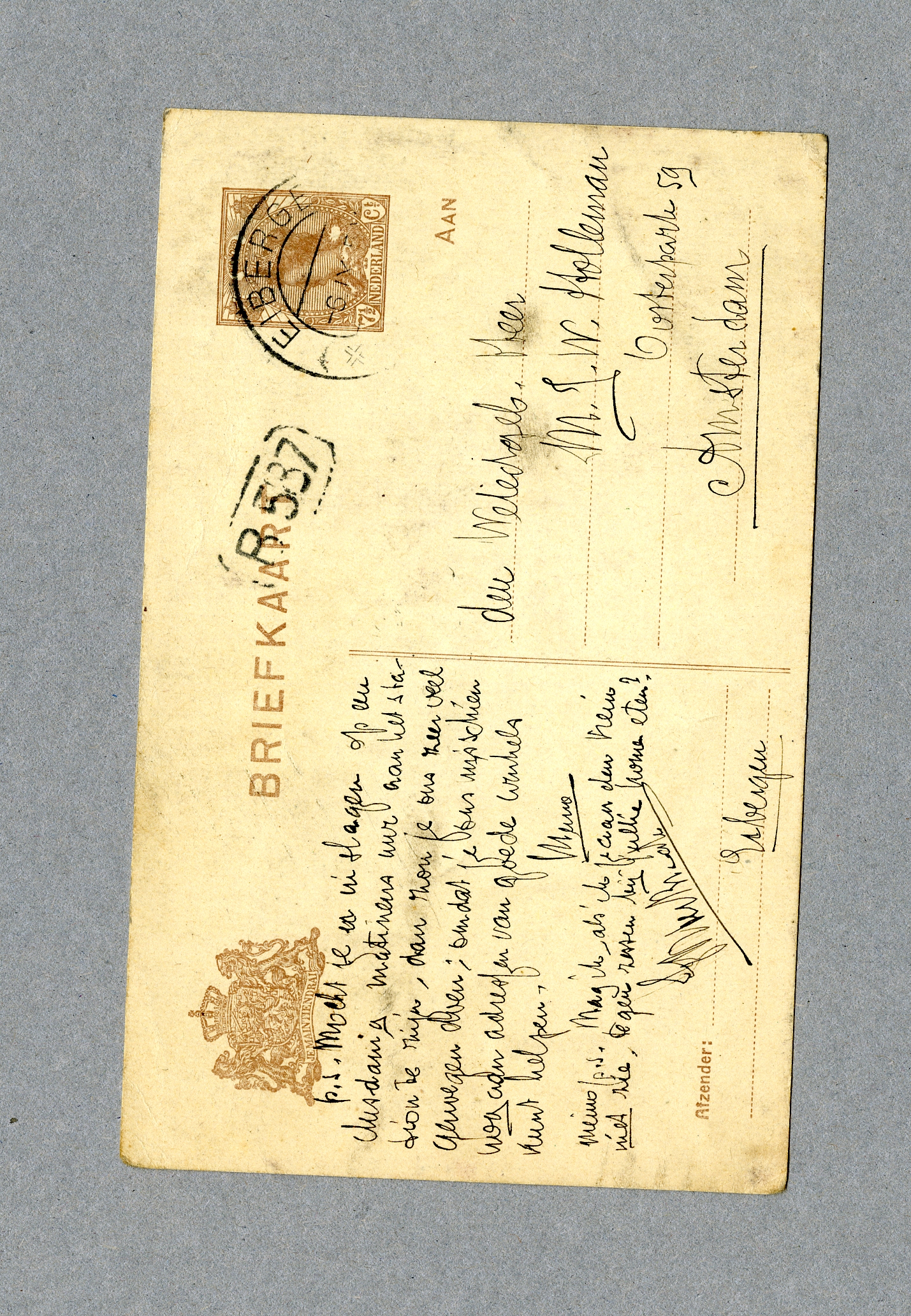 p.s. Mocht je er in slagen op een dusdanig matineus uur aan het station te zijn, dan zou je ons zeer veel genoegen doen; omdat je ons misschien nog aan adressen van goede winkels kunt helpen.