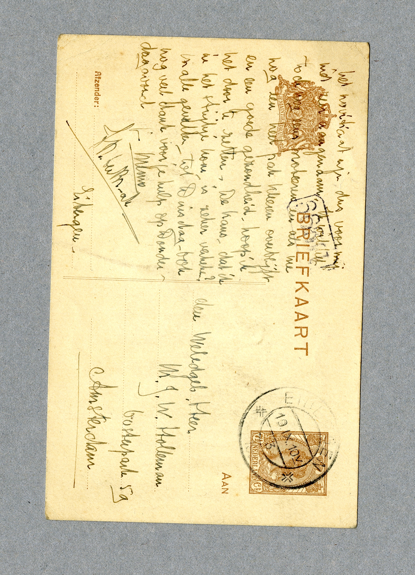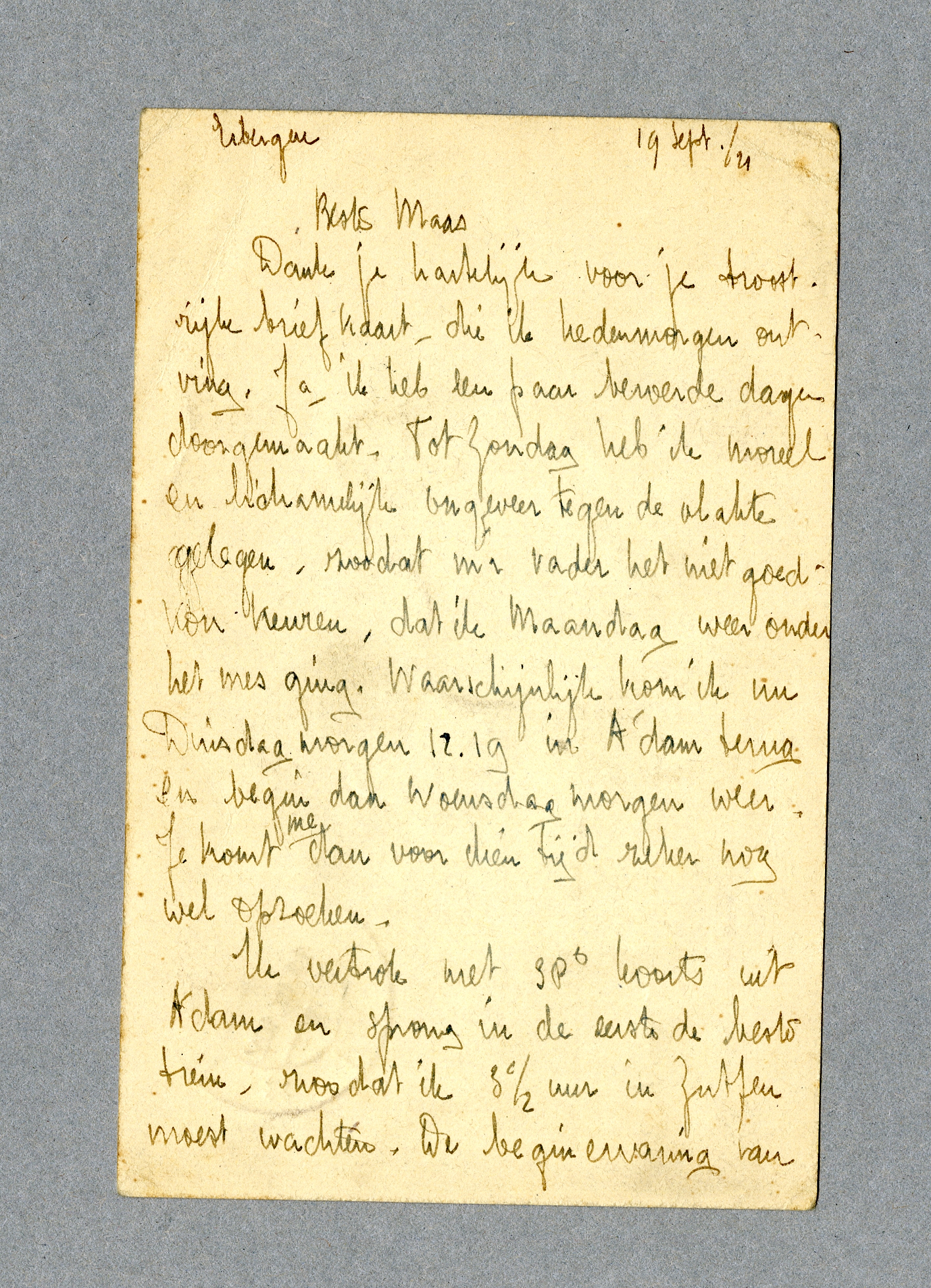 Dank je hartelijk voor je troostrijke brief, die ik hedenmorgen ontving. Ja, ik heb een paar beroerde dagen doorgemaakt. Tot Zondag heb ik moreel en lichamelijk ongeveer tegen de vlakte gelegen, zoodat m'n vader het niet goed kon keuren, dat ik Maandag weer onder het mes ging. Waarschijnlijk kom ik nu Dinsdagmorgen 12.19 in A'dam terug en begin dan Woensdagmorgen weer. Je komt me dan voor dien tijd zeker nog wel opzoeken.