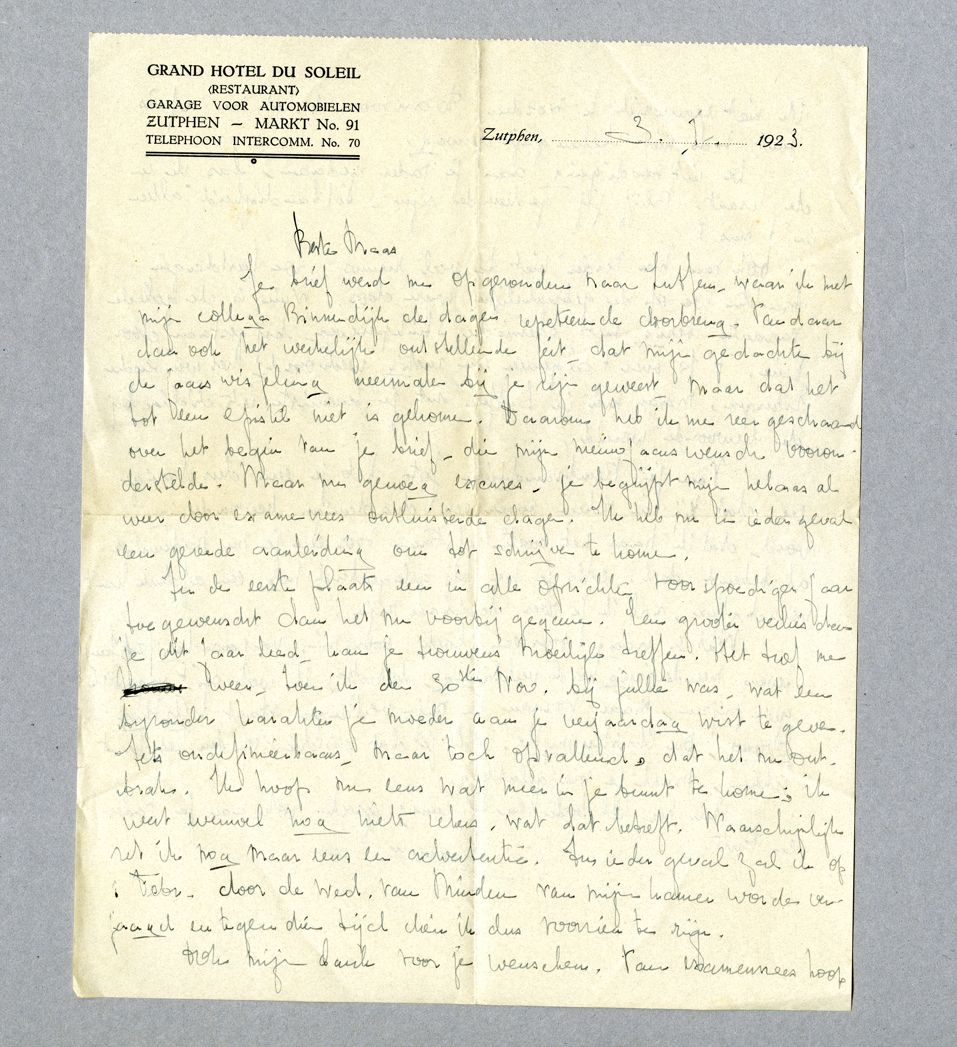 Je brief werd me opgezonden naar Zutfen, waar ik met mijn collega Binnendijk de dagen repeteerende doorbreng. Vandaar dan ook het werkelijk ontstellende feit, dat mijn gedachte bij de jaarswisseling meermalen bij je zijn geweest, maar dat het tot een epistel niet is gekomen. Daarom heb ik me zeer geschaamd over het begin van je brief, die mijn nieuwjaarswensch vooronderstelde. Maar nu genoeg excuses, je begrijpt mijn helaas al weer door examens ontluisterde dagen. Ik heb nu in ieder geval een gerede aanleiding om tot schrijven te komen.
