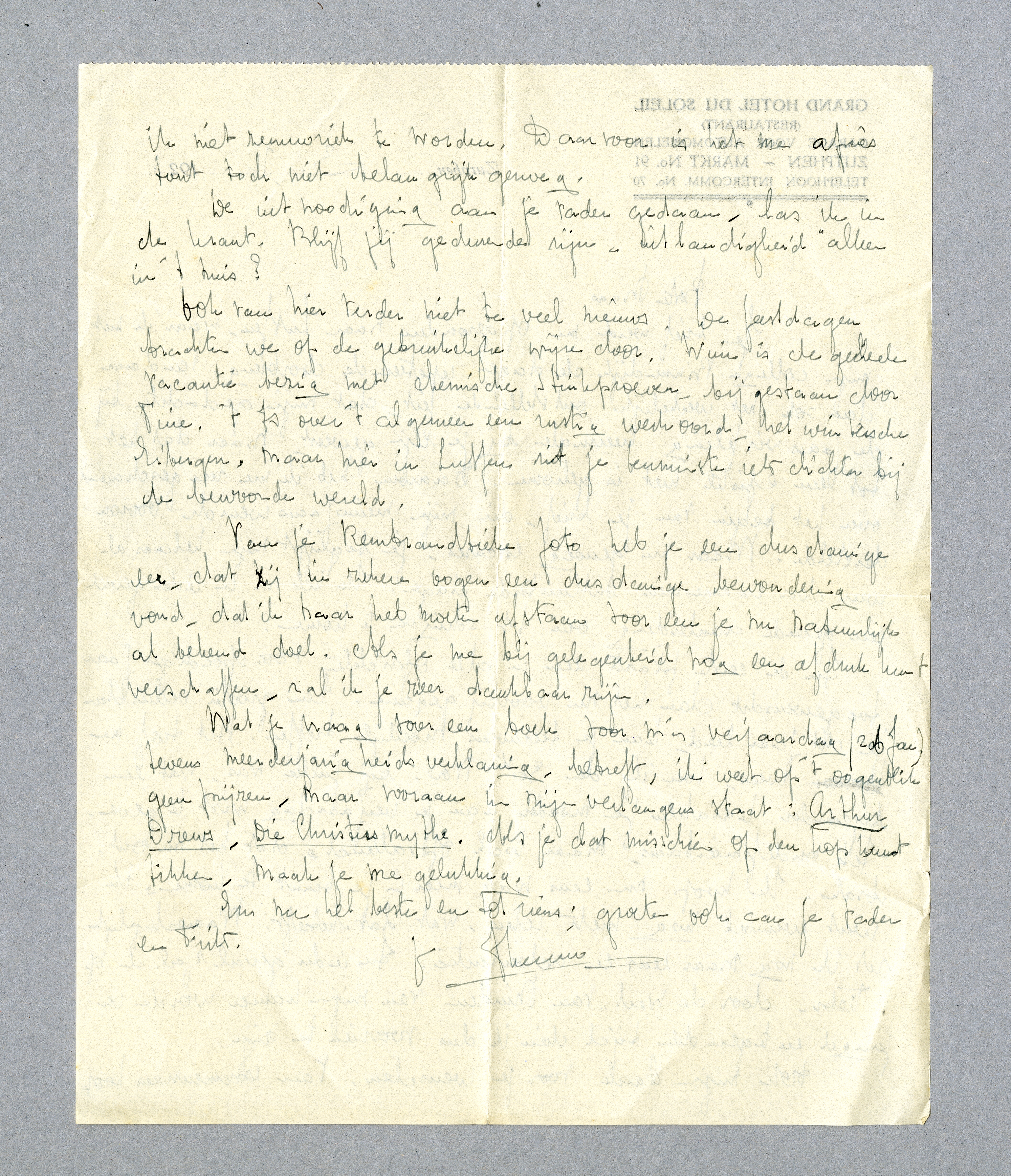 Van je Rembrandtieke foto heb je een dusdanige eer, dat zij in zekere oogen een dusdanige bewondering vond, dat ik haar heb moeten afstaan voor een je nu natuurlijk al bekend doel. Als je me bij gelegenheid nog een afdruk kunt verschaffen, zal ik je zeer dankbaar zijn.